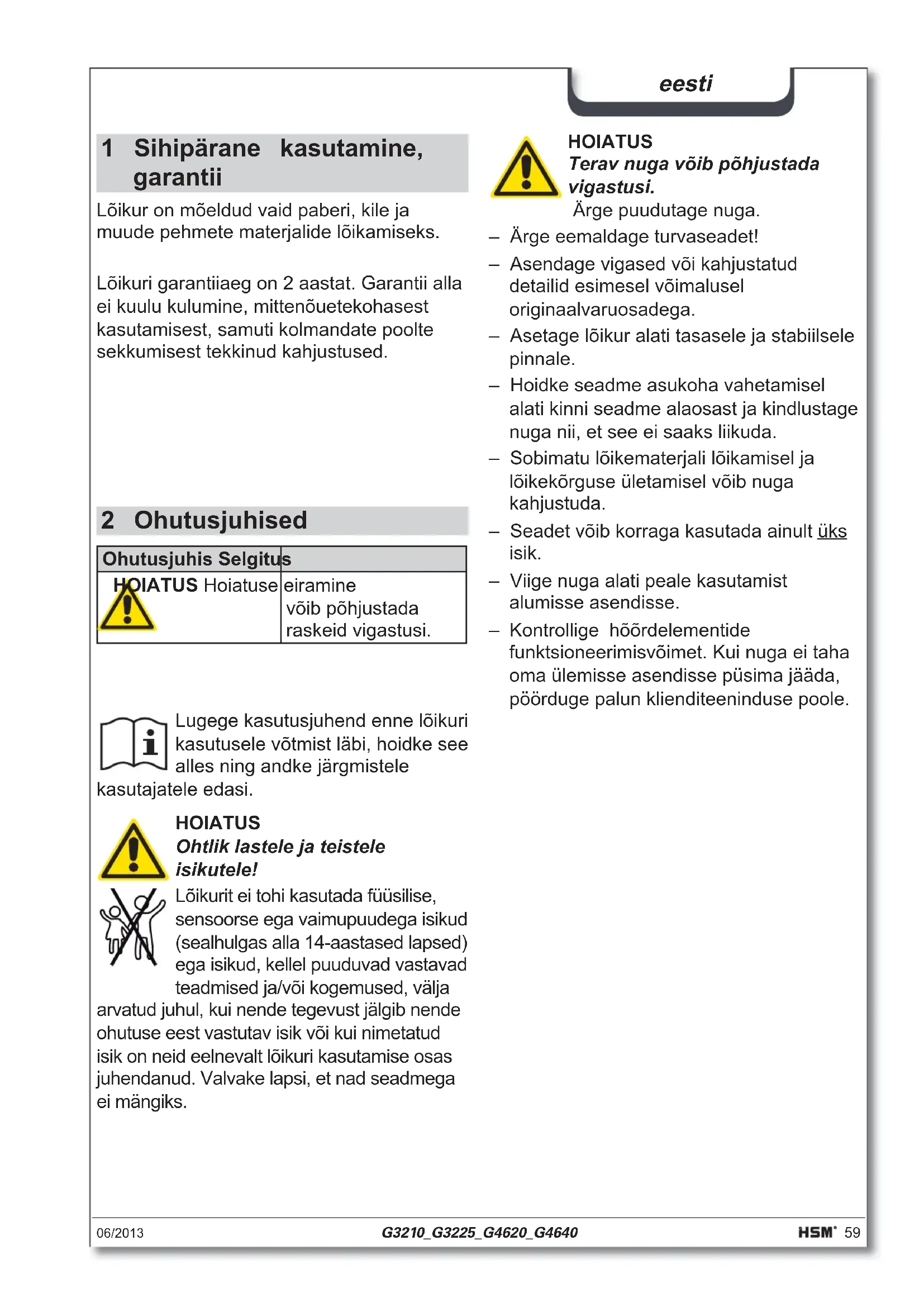 Max. výška rezania (mm) 1,0 2,5 2,0 4,0 Max. formát A4 A4 A3 A3 Dĺžka rezania (mm) 325 325 460 460 Prítlak manuálny automatický automatický automatický Pracovný stôl (mm) 325 x 155 325 x 230 460 x 230 460 x 320 Rozmery (mm) 605 x 280 x 75 606 x 308 x 122 737 x 362 x 122 750 x 406 x 133 Hmotnosť (kg) 2,12 3,72 4,66 7,30 Upozornenie: Aby pri odkladní páková rezačka nezaberala veľa miesta aby bol nôž pri premiestňovaní zafi xovaný, ochranný štít sa dá sklopiť. Je to však možné len vtedy, keď sa nôž nachádza v polohe dole.58 G3210_G3225_G4620_G4640 06/2013 slovensky06/2013 G3210_G3225_G4620_G4640 59 eesti 1 Sihipärane kasutamine, garantii Lõikur on mõeldud vaid paberi, kile ja muude pehmete materjalide lõikamiseks. Lõikuri garantiiaeg on 2 aastat. Garantii alla ei kuulu kulumine, mittenõuetekohasest kasutamisest, samuti kolmandate poolte sekkumisest tekkinud kahjustused. 2 Ohutusjuhised Ohutusjuhis Selgitus HOIATUS Hoiatuse eiramine võib põhjustada raskeid vigastusi. Lugege kasutusjuhend enne lõikuri kasutusele võtmist läbi, hoidke see alles ning andke järgmistele kasutajatele edasi. HOIATUS Ohtlik lastele ja teistele isikutele! Lõikurit ei tohi kasutada füüsilise, sensoorse ega vaimupuudega isikud (sealhulgas alla 14-aastased lapsed) ega isikud, kellel puuduvad vastavad teadmised ja/või kogemused, välja arvatud juhul, kui nende tegevust jälgib nende ohutuse eest vastutav isik või kui nimetatud isik on neid eelnevalt lõikuri kasutamise osas juhendanud. Valvake lapsi, et nad seadmega ei mängiks. HOIATUS Terav nuga võib põhjustada vigastusi. Ärge puudutage nuga. – Ärge eemaldage turvaseadet! – Asendage vigased või kahjustatud detailid esimesel võimalusel originaalvaruosadega. – Asetage lõikur alati tasasele ja stabiilsele pinnale. – Hoidke seadme asukoha vahetamisel alati kinni seadme alaosast ja kindlustage nuga nii, et see ei saaks liikuda. – Sobimatu lõikematerjali lõikamisel ja lõikekõrguse ületamisel võib nuga kahjustuda. – Seadet võib korraga kasutada ainult üks isik. – Viige nuga alati peale kasutamist alumisse asendisse. – Kontrollige hõõrdelementide funktsioneerimisvõimet. Kui nuga ei taha oma ülemisse asendisse püsima jääda, pöörduge palun klienditeeninduse poole.60 G3210_G3225_G4620_G4640 06/2013 eesti