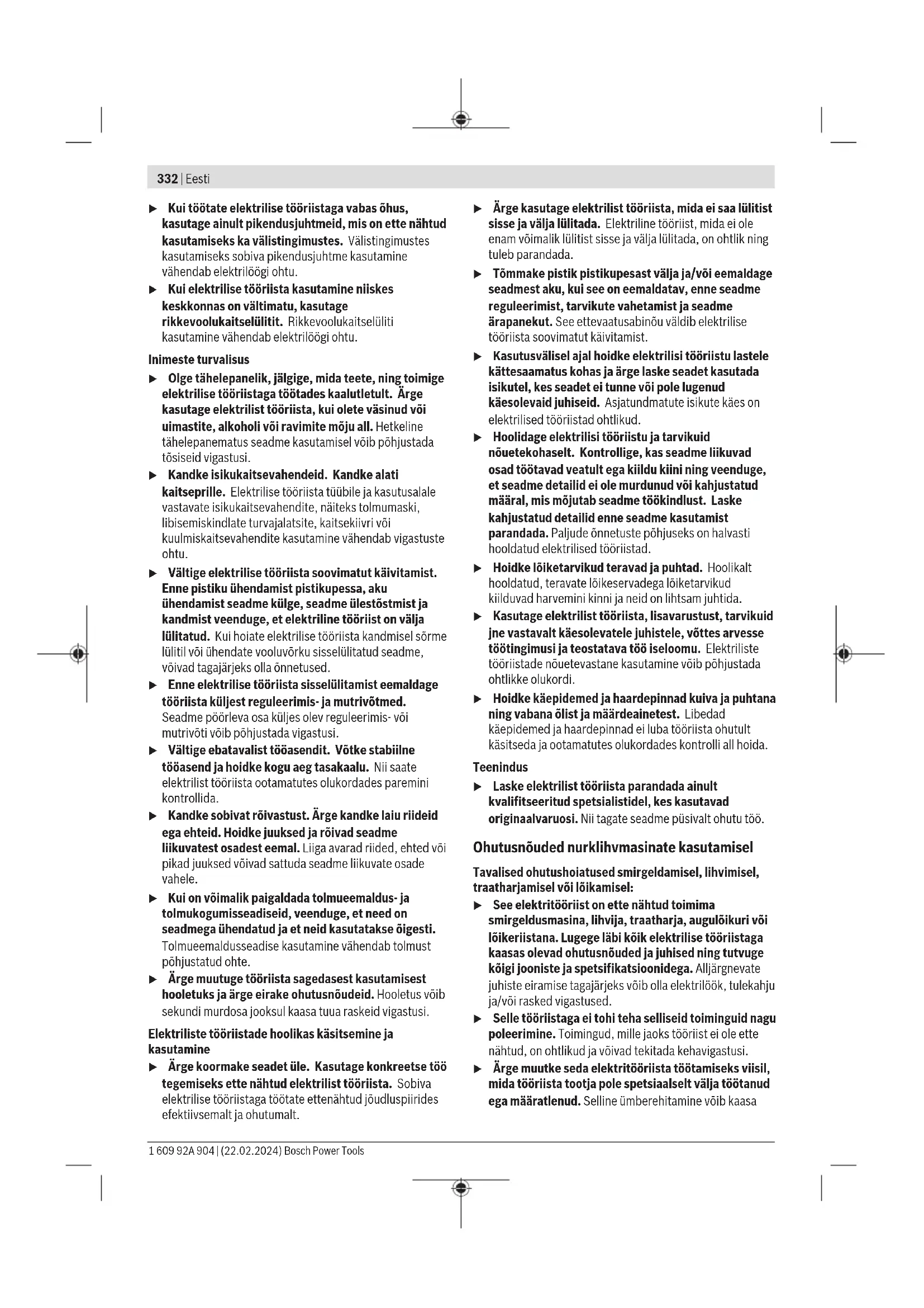 Toodud pöörlemiskiirusastmete väärtused on ligikaudsed. Paigaldus Kaitseseadise paigaldamine u Enne mistahes tööde teostamist elektrilise tööriista kallal tõmmake pistik pistikupesast välja. Märkus: Juhul kui lihvketas töötamise ajal murdub või kui kettakaitse/elektrilise tööriista kinnitusseadised saavad kahjustada, tuleb elektriline tööriist toimetada viivitamatult hoolduskeskusse; aadressid on toodud jaotises “Klienditeenindus ja kasutusalane nõustamine". Bosch Power Tools 1 609 92A 904 | (22.02.2024)338 | Eesti Kaitsekate lihvimiseks Asetage kaitsekate (7) elektrilisel tööriistal olevale hoidikule, nii et kaitsekatte kodeerimisnagad kattuvad hoidikuga. Vajutage sealjuures ja hoidke vajutatult lukustuse vabastamishooba (1). Vajutage kaitsekate (7) spindlikaelale, kuni kaitsekatte ühenduskoht toetub elektrilise tööriista äärikule ja pöörake kaitsekatet, nii et see selgelt kuuldavalt fikseerub. Sobitage kaitsekate (7) tööoperatsiooni nõuetega. Suruge selleks lukustuse vabastamishoob (1) üles ja pöörake kaitsekate (7) soovitud asendisse. u Seadke kaitsekate(7) alati nii, et lukustuse vabastamishoova(1) mõlemad nagad oleksid kaitsekatte(7) vastavates väljalõigetes. u Reguleerige kaitsekate (7) välja nii, et sädemeid ei lendu kasutaja suunas. u Lisavarustuse pöörlemissuunas peab saama kaitekatet(7) pöörata ainult lukustuse vabastamishooba(1) käsitsedes! Vastasel korral ei tohi elektrilist tööriista mitte mingil juhul edasi kasutada ja see tuleb üle anda klienditeenindusele. Suunis: Kodeerimisnagad kaitsekattel (7) tagavad, et elektrilisele tööriistale saab paigaldada ainult sobiva kaitsekatte. Imikate lihvimiseks Värvide, lakkide ja plastide lihvimiseks kõvasulam- kausskettaga (11) võite kasutada tomueemalduskatet (6). Tolmueemalduskate (6) ei sobi metallide töötlemiseks. Tolmueemalduskattega (6) saab ühendada sobiva Boschi tolmuimeja. Asetage selleks tolmueemaldusadapteriga imivoolik tolmueemalduskatte sellekohasesse ühendusotsakusse. Kaitsekate lõikamiseks u Kasutage lõikamiseks alati lõikamise kaitsekatet (8) või lihvimise kaitsekatet (7) koos lõikamiskattega(9). u Kivi lõikamisel tuleb tagada piisavalt tõhus tolmuimemine. Lõikamise kaitsekate(8) paigaldatakse samamoodi kui lihvimise kaitsekate (7). Metallist lõikamiskate Paigaldage metallist lõikamiskate (9) lihvimise kaitsekattele (7) (vaata joonist A): pöörake hoidelook tagasi (➊). Asetage kate (9) lihvimise kaitsekattele (7) (➋). Suruge hoidelook tugevalt vastu kaitsekatet (7) (➌). Eemaldamiseks (vaata joonist B) suruge hoideloogal olevat nuppu (➊) ja pöörake hoidelook tagasi(➋). Tõmmake kate (9) kaitsekattelt (7) maha (➌). Plastist lõikamiskate Asetage plastist lõikamiskate(9) lihvimise kaitsekattele(7) (vaata joonistC). Kate(9) fikseerub kuuldavalt ja nähtavalt kaitsekattele(7). Eemaldamiseks (vaata joonistD) vabastage kate(9) lukustusest kaitsekattel(7) (➊) vaskult või paremalt poolt ja tõmmake kate maha (➋). Juhtkelguga kaitsekate lõikamiseks Juhtkelguga lõikamise tolmueemalduskate(30) paigaldatakse samamoodi kui lihvimise kaitsekate. Lisakäepideme (5)/(4) kinnitamisega läbi tolmueemalduskatte ajami korpusele ühendatakse elektriline tööriist kindlalt tolmueemalduskattega. Juhtkelguga tolmueemaldamiskattega (30) saab ühendada sobiva Boschi tolmuimeja. Asetage selleks tolmueemaldusadapteriga imivoolik tolmueemalduskatte sellekohasesse ühendusotsakusse. Suunis: Tolmu poolt tolmu imemise ajal tekitatav hõõrdumine imivoolikus ja lisavarustuses põhjustab elektrostaatilise laengu, mille lahendumist võib kasutaja (olenevalt keskkonnateguritest ja oma füsioloogilisest seisundist) tunda.Bosch soovitab üldiselt kasutada kuivade materjalide peentolmu imemiseks antistaatilist imivoolikut (lisavarustus). Käekaitse u Paigaldage kummist lihvtaldrikuga(23) või kaussharja/koonusharja/teemant-puurkrooniga töötamisel alati käekaitse(22). Kinnitage käekaitse (22) lisakäepidemega (5)/(4). Standardne lisakäepide / vibratsiooni summutav lisakäepide Kruvige lisakäepide (5)/(4) olenevalt tööviisist paremalt või vasakult poolt ajamipeale. u Kasutage oma elektrilist tööriista ainult lisakäepidemega (5)/(4). u Lõpetage elektrilise tööriista kasutamine, kui lisakäepide (5)/(4) on vigastatud. Ärge tehke lisakäepidemel (5)/(4) mitte mingeid muudatusi. Vibratsiooni summutav lisakäepide (4) võimaldab vähese vibratsiooniga ja seega mugavat ning turvalist töötamist. Lihvimistarvikute paigaldamine u Enne mistahes tööde teostamist elektrilise tööriista kallal tõmmake pistik pistikupesast välja. u Ärge puudutage lihv- ja lõikekettaid enne, kui need on jahtunud. Kettad lähevad töötamisel väga kuumaks. Puhastage lihvimisspindel (21) ja kõik paigaldatavad osad. Tarviku kinnitamiseks ja vabastamiseks vajutage spindli lukustamise nupule (2), et lihvimisspindlit lukustada. u Spindli lukustamise nupule vajutage üksnes siis, kui spindel seisab. Vastasel korral võib tööriist kahjustada saada. Lihv- /lõikeketas Paigaldamine kinnitusmutriga(17) ja kiirkinnitusmutriga(18) 1 609 92A 904 | (22.02.2024) Bosch Power ToolsEesti | 339 Pöörake tähelepanu lihvimistööriistade mõõtmetele. Ava läbimõõt peab tugiäärikuga sobima. Ärge kasutage adaptereid ega vähendusdetaile. Teemantlõikeketaste kasutamise korral veenduge, et teemantlõikekettal olev pöörlemissuuna nool ja elektrilise tööriista pöörlemissuund (vt ajamipeal olevat pöörlemissuuna noolt) kattuvad. Paigalduse järjekord on näha jooniste lehel. Lihvimis-/lõikeketta kinnitamiseks keerake pingutusmutter (17) peale ja pingutage seda topeltvõtmega (vaadake „ Kiirkinnitusmutter “, Lehekülg339). Rõngastihendiga tugiäärikus (10) on tsentreerimiskraele paigaldatud plastdetail (rõngastihend). Kui rõngastihend puudub või on kahjustatud, tuleb rõngastihendiga kinnitusäärik (10) enne edasist kasutamist tingimata asendada. u Pärast lihvimistarviku paig