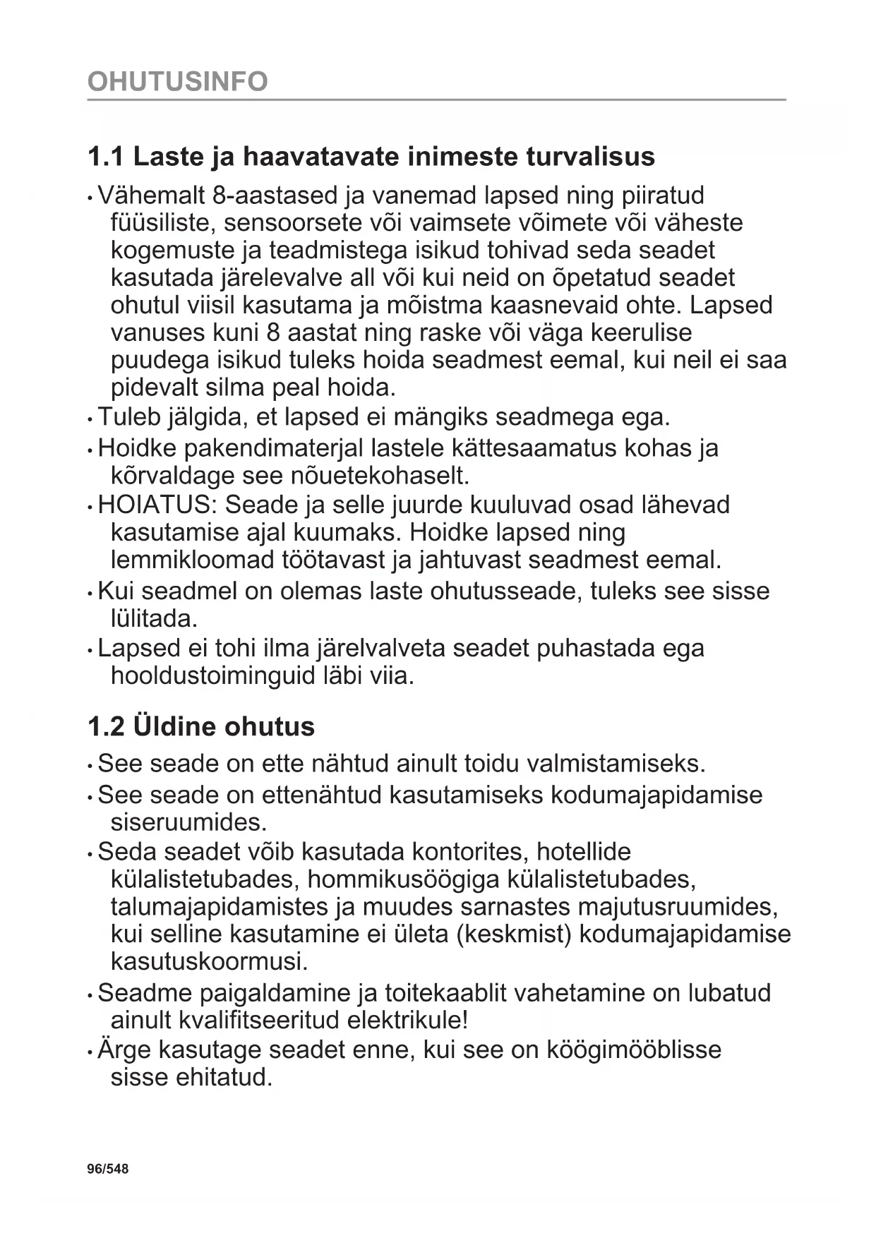 Enne seadme paigaldamist ja kasutamist lugege kaasasolev juhend tähelepanelikult läbi. Tootja ei võta endale vastutust vigastuste või varalise kahju eest, mis on tingitud paigaldusnõuete eiramisest või väärast kasutusest. Hoidke kasutusjuhend kindlas kohas alles, et saaksite seda vajadusel vaadata. 95/548 OHUTUSINFO1.1 Laste ja haavatavate inimeste turvalisus