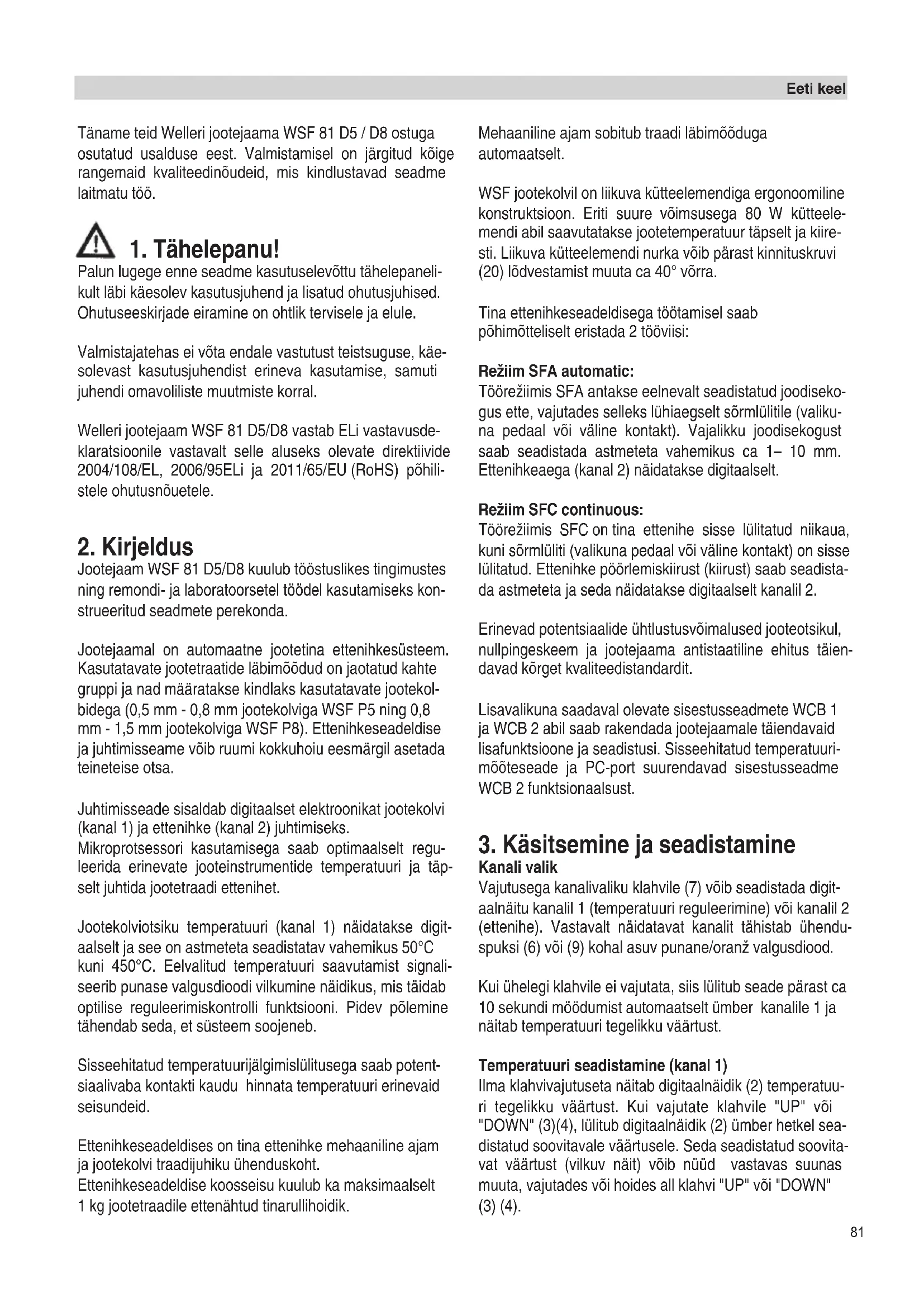 Palun lugege enne seadme kasutuselevõttu tähelepaneli- kult läbi käesolev kasutusjuhend ja lisatud ohutusjuhised. Ohutuseeskirjade eiramine on ohtlik tervisele ja elule. Valmistajatehas ei võta endale vastutust teistsuguse, käe- solevast kasutusjuhendist erineva kasutamise, samuti juhendi omavoliliste muutmiste korral. Welleri jootejaam WSF 81 D5/D8 vastab ELi vastavusde- klaratsioonile vastavalt selle aluseks olevate direktiivide 2004/108/EL, 2006/95ELi ja 2011/65/EU (RoHS) põhili- stele ohutusnõuetele.