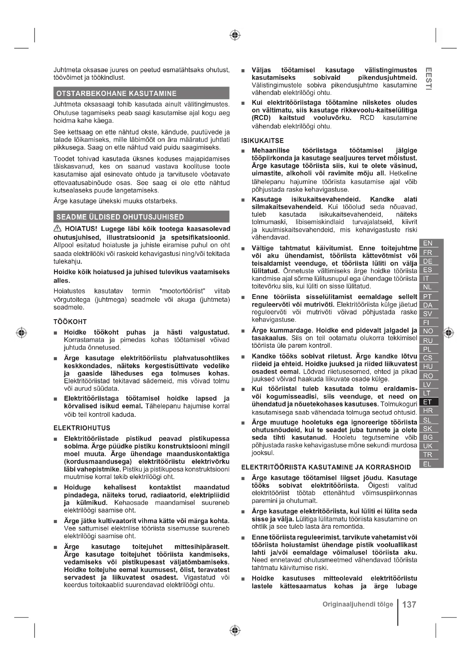 ■ Ärge kasutage töötamisel liigset jõudu. Kasutage tööks sobivat elektritööriista. Õigesti valitud elektritööriist töötab ettenähtud võimsuspiirkonnas paremini ja ohutumalt. ■ Ärge kasutage elektritööriista, kui lüliti ei lülita seda sisse ja välja. Lülitiga lülitamatu tööriista kasutamine on ohtlik ja see tuleb lasta ära remontida. ■ Enne tööriista reguleerimist, tarvikute vahetamist või tööriista hoiustamist ühendage pistik vooluallikast lahti ja/või eemaldage võimalusel tööriista aku. Need ennetavad ohutusmeetmed vähendavad tööriista tahtmatu käivitumise riski. ■ Hoidke kasutuses mitteolevaid elektritööriistu lastele kättesaamatus kohas ja ärge lubage138 Originaaljuhendi tõlge elektritööriista mitte tundvaid või kasutusjuhendiga mitte tutvunud isikuid elektritööriista kasutada. Oskamatu kasutaja käes olev elektritööriist on ohtlik. ■ Hooldage elektritööriistu ja tarvikuid. Kontrollige liikuvate osade mittetsentreeritust ja kinnitumist, osade vigastusi ning tehke kindlaks muud seisundid, mis võivad mõjustada elektritööriista tööd. Kui mõni osa on vigastatud, siis laske elektritööriist enne kasutamist ära parandada. Halvasti hooldatud elektritööriistad põhjustavad palju õnnetusi. ■ Hoidke lõiketerad teravad ja puhtad. Teravate lõiketeradega ja nõuetekohaselt hooldatud lõikeriistad jäävad harvemini kinni ning neid on kergem kontrolli all hoida. ■ Tööriistade, tarvikute, otsakute ja muude lisaseadmete kasutamisel juhinduge nende kasutusjuhenditest, võttes arvesse tehtavat tööd ja tööolusid. Tööoperatsiooniks mitte ettenähtud tööriista kasutamine võib tekitada ohtliku olukorra. ■ Hoidke tööriista käepidemed ja haardepinnad kuivana, puhtana ja ärge laske neile sattuda õli või määret. Libedad käepidemed ja haardepinnad ei võimalda tööriista turvaliselt haarata ja ootamatutes olukordades kontrollida.