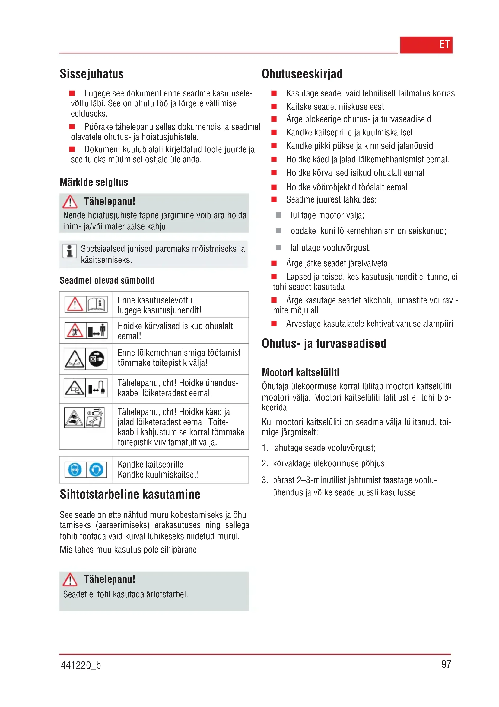 Sissejuhatus Lugege see dokument enne seadme kasutusele- võttu läbi. See on ohutu töö ja tõrgete vältimise eelduseks. Pöörake tähelepanu selles dokumendis ja seadmel olevatele ohutus- ja hoiatusjuhistele. Dokument kuulub alati kirjeldatud toote juurde ja see tuleks müümisel ostjale üle anda. Märkide selgitus Tähelepanu! Nende hoiatusjuhiste täpne järgimine võib ära hoida inim- ja/või materiaalse kahju. Spetsiaalsed juhised paremaks mõistmiseks ja käsitsemiseks. Seadmel olevad sümbolid Enne kasutuselevõttu lugege kasutusjuhendit! Hoidke kõrvalised isikud ohualalt eemal! Enne lõikemehhanismiga töötamist tõmmake toitepistik välja! Tähelepanu, oht! Hoidke ühendus- kaabel lõiketeradest eemal. Tähelepanu, oht! Hoidke käed ja jalad lõiketeradest eemal. Toite- kaabli kahjustumise korral tõmmake toitepistik viivitamatult välja. Kandke kaitseprille! Kandke kuulmiskaitset! Sihtotstarbeline kasutamine See seade on ette nähtud muru kobestamiseks ja õhu- tamiseks (aereerimiseks) erakasutuses ning sellega tohib töötada vaid kuival lühikeseks niidetud murul. Mis tahes muu kasutus pole sihipärane. Tähelepanu! Seadet ei tohi kasutada äriotstarbel. Ohutuseeskirjad Kasutage seadet vaid tehniliselt laitmatus korras Kaitske seadet niiskuse eest Ärge blokeerige ohutus- ja turvaseadiseid Kandke kaitseprille ja kuulmiskaitset Kandke pikki pükse ja kinniseid jalanõusid Hoidke käed ja jalad lõikemehhanismist eemal. Hoidke kõrvalised isikud ohualalt eemal Hoidke võõrobjektid tööalalt eemal Seadme juurest lahkudes: lülitage mootor välja; oodake, kuni lõikemehhanism on seiskunud; lahutage vooluvõrgust. Ärge jätke seadet järelvalveta Lapsed ja teised, kes kasutusjuhendit ei tunne, ei tohi seadet kasutada Ärge kasutage seadet alkoholi, uimastite või ravi- mite mõju all Arvestage kasutajatele kehtivat vanuse alampiiri Ohutus- ja turvaseadised Mootori kaitselüliti Õhutaja ülekoormuse korral lülitab mootori kaitselüliti mootori välja. Mootori kaitselüliti talitlust ei tohi blo- keerida. Kui mootori kaitselüliti on seadme välja lülitanud, toi- mige järgmiselt: