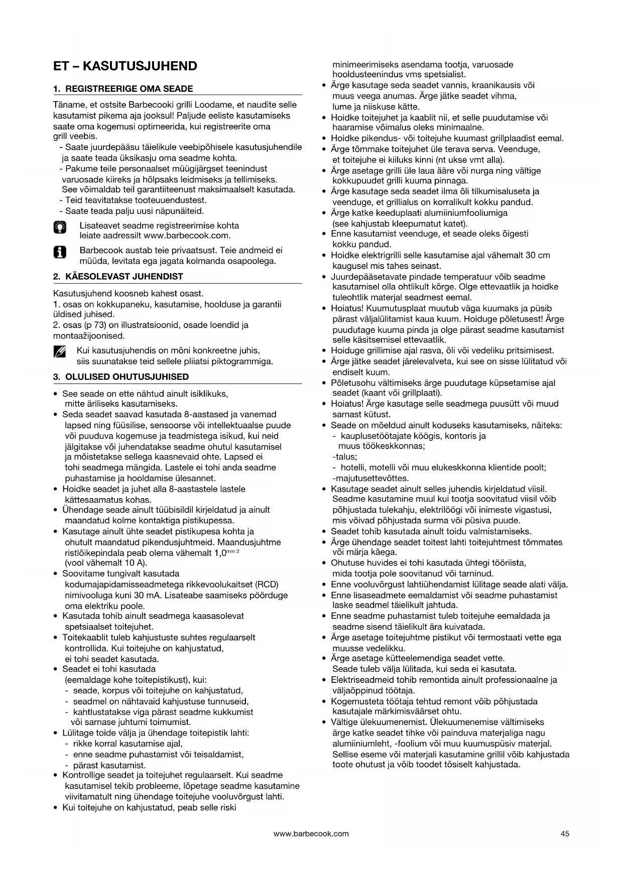 Täname, et ostsite Barbecooki grilli Loodame, et naudite selle kasutamist pikema aja jooksul! Paljude eeliste kasutamiseks saate oma kogemusi optimeerida, kui registreerite oma grill veebis. - Saate juurdepääsu täielikule veebipõhisele kasutusjuhendile ja saate teada üksikasju oma seadme kohta. - Pakume teile personaalset müügijärgset teenindust varuosade kiireks ja hõlpsaks leidmiseks ja tellimiseks. See võimaldab teil garantiiteenust maksimaalselt kasutada. - Teid teavitatakse tooteuuendustest. - Saate teada palju uusi näpunäiteid. Lisateavet seadme registreerimise kohta leiate aadressilt www.barbecook.com. Barbecook austab teie privaatsust. Teie andmeid ei müüda, levitata ega jagata kolmanda osapoolega.