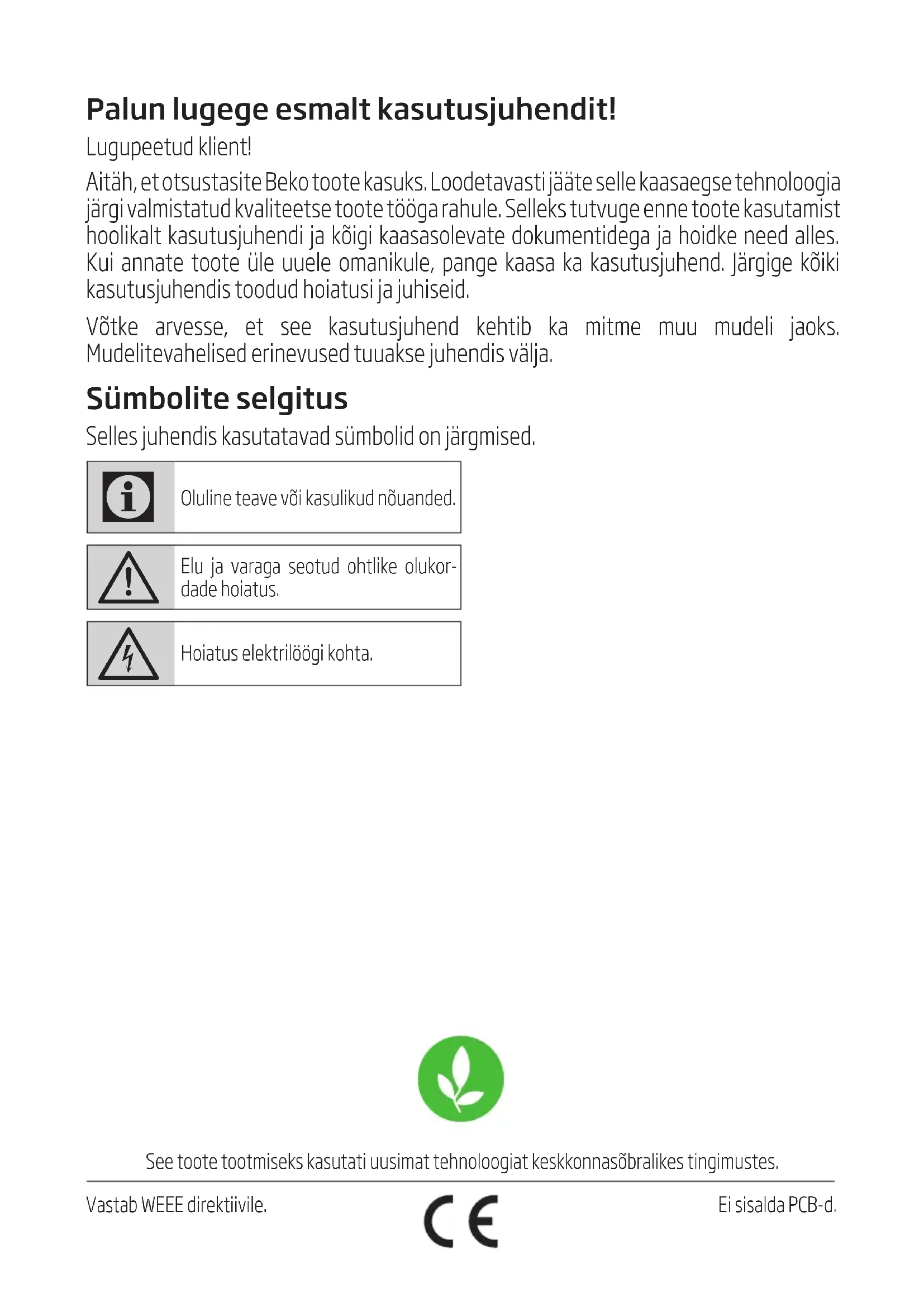 Curăţarea ş întreţnereaVastab WEEE drektvle. See toote tootmseks kasutat uusmat tehnoloogat keskkonnasõbralkes tngmustes. Palun lugege esmalt kasutusjuhendit! Lugupeetud klient! Aitäh, et otsustasite Beko toote kasuks. Loodetavasti jääte selle kaasaegse tehnoloogia järgi valmistatud kvaliteetse toote tööga rahule. Selleks tutvuge enne toote kasutamist hoolikalt kasutusjuhendi ja kõigi kaasasolevate dokumentidega ja hoidke need alles. Kui annate toote üle uuele omanikule, pange kaasa ka kasutusjuhend. Järgige kõiki kasutusjuhendis toodud hoiatusi ja juhiseid. Võtke arvesse, et see kasutusjuhend kehtib ka mitme muu mudeli jaoks. Mudelitevahelised erinevused tuuakse juhendis välja. Sümbolite selgitus Selles juhendis kasutatavad sümbolid on järgmised.