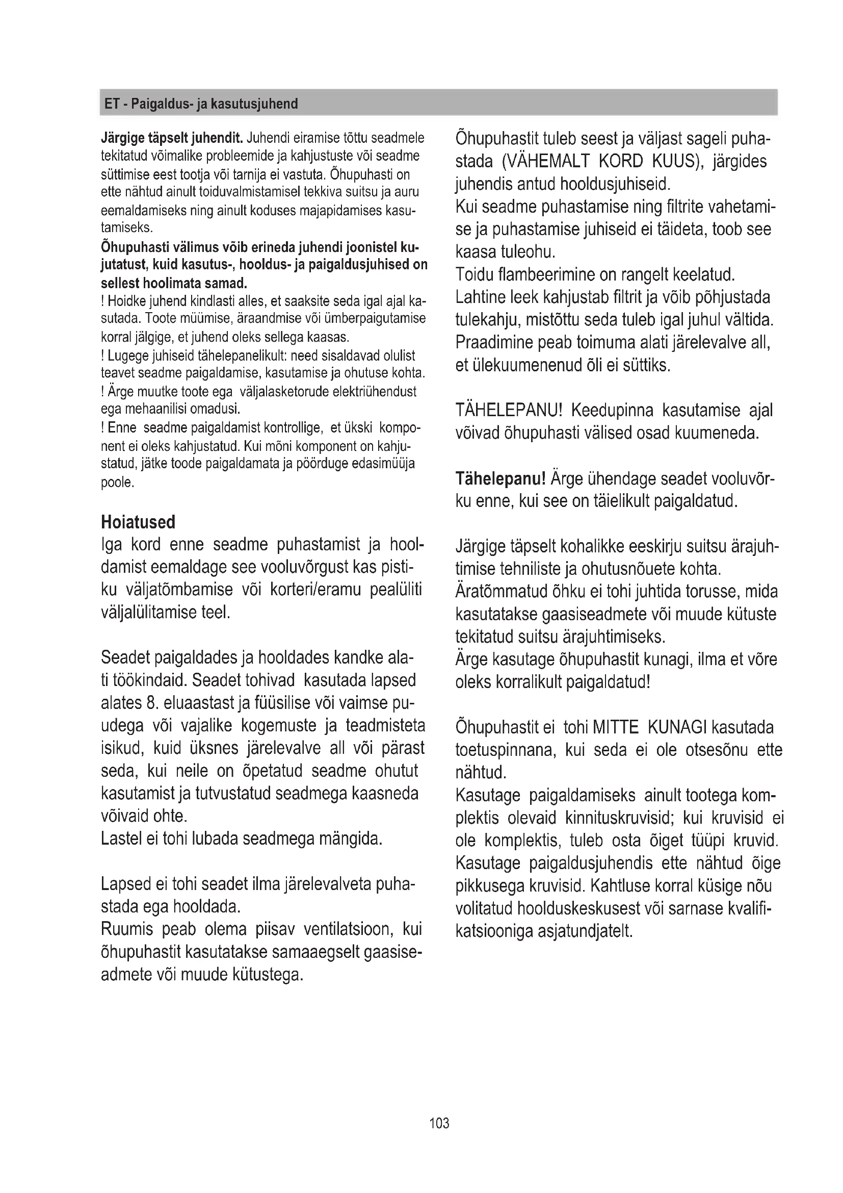14-2; CEI/EN 61000-3-2; CEI/EN 61000-3-3. Soovitusi õigeks keskkonnamõju vähendava- ks kasutamiseks: toiduvalmistamist alustades lülitage õhupuhasti sisse miinimumvõimsusel ja jätke see tööle ka mõneks minutiks pärast toidu- valmistamise lõpetamist. Suurendage võimsust ainult juhul, kui suitsu ja auru on väga palju, ning turborežiimi kasutage ainult äärmisel juhul. Et lõhna eemaldav süsteem toimiks tõhusalt, vahetage vastavalt vajadusele ltrit/ltreid/sütt. Puhastage vajaduse korral rasvaltrit, et see toimiks tõhusalt. Võimalikult suure tõhususe ja võimalikult väikese müra tagamiseks kasutage juhendis ette nähtud maksimaalse läbimõõduga torusid. Kasutamine Õhupuhastit saab kasutada äratõmberežiimil või ltreerival siseringlusega režiimil. Äratõmberežiim Aur juhitakse ühendusääriku külge kinnitatud väljalasketoru kaudu välja. Väljalasketoru peab olema sama läbimõõduga nagu ühendusrõngas. Tähelepanu! Väljalasketoru ei kuulu komplekti ja see tuleb juurde osta. Toru horisontaalne osa peab olema väikese ülespoole kaldega (u 10°), et hõlbustada õhu väljajuhtimist. Kui õhupuha- sti on varustatud söeltritega, tuleb need välja võtta.105 Filtreerimisrežiim Äratõmmatud õhk puhastatakse rasvast ja juhita- kse ruumi tagasi. Õhupuhasti kasutamiseks sel- lel režiimil tuleb paigaldada täiendav aktiivsöega ltreerimissüsteem. Märkus. Söeltrid läbinud õhk juhitakse kööki ta- gasi läbi toru, mis suunab õhu kapi küljele. Paigaldamine Märkus. Seade tuleb paigaldada nii, et tagada võimalikeks parandustöödeks alaline juurdepääs seadmele ja selle elektroonilistele komponenti- dele. HOIATUS. Elektroonilisi komponente sisaldav metallkarp tuleb paigutada vähemalt 65 cm kau- gusele gaasipliidist ja igal juhul 65 cm kaugusele õhupuhasti sissetõmbeavast. SOOVITUS. Soovitame paigaldada elektrooni- lisi komponente sisaldava metallkarbi vähemalt 10 cm kõrgusele põrandast ja piisavalt kaugele kõikidest soojusallikatest (nt pliidi külg või kee- dupind). Kui gaasipliidi paigaldamisjuhendis on ette nähtud suurem kaugus, tuleb seda järgida. Elektriühendus Õhupuhasti peab vooluvõrguga ühendama kvali- tseeritud spetsialist. Vooluvõrgu pinge peab vastama õhupuhasti si- seküljel asuval etiketil näidatud pingele. Kui õhu- puhastil on olemas pistik, tuleb see ühendada nõuetekohase pistikupesaga, mille asukoht on juurdepääsetav ka pärast seadme paigaldami- st. Kui pistik puudub (seade ühendatakse otse vooluvõrku) või kui pistikupesa ei asu pärast seadme paigaldamist juurdepääsetavas kohas, paigaldage vastavalt asjakohasele juhendile nõuetekohane bipolaarne kaitselüliti, mis tagab täieliku väljalülitamise vooluvõrgust ülepinge III kategooria tingimustel. Tähelepanu! Iga kord enne õhupuhasti voo- luvõrku ühendamist ja kontrollimist, kas seade toimib nõuetekohaselt, jälgige, et elektrikaabel oleks korralikult ühendatud. Paigaldamine Enne seadme paigaldamist kontrollige, et ük- ski komponent ei oleks kahjustatud. Kui mõni komponent on kahjustatud, jätke seade paigal- damata ja pöörduge edasimüüja poole. Samuti lugege tähelepanelikult läbi kõik alljärgnevad juhised. Kasutage õhu väljajuhtimiseks maksimaalselt 5 meetri pikkust toru.