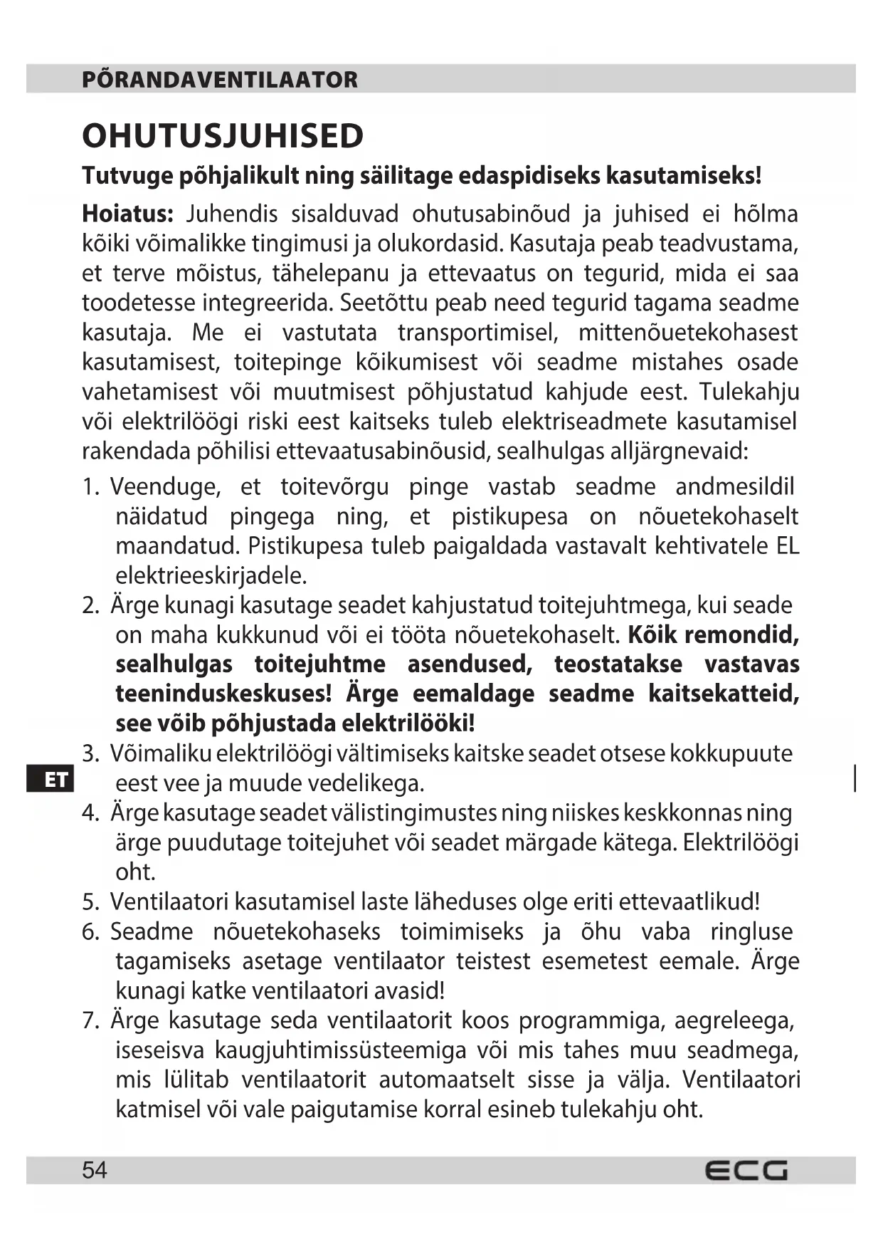 Do not immerse in water! – Ärge sukeldage vette! Hoiatus: Ülekuumenemise vältimiseks ei tohi ventilaatorit katta. OHT LASTELE: Ärge lubage lastel mängida pakkematerjalidega. Ärge lubage lastel mängida plastkottidega. Lämbumise oht. KOKKUPANEK