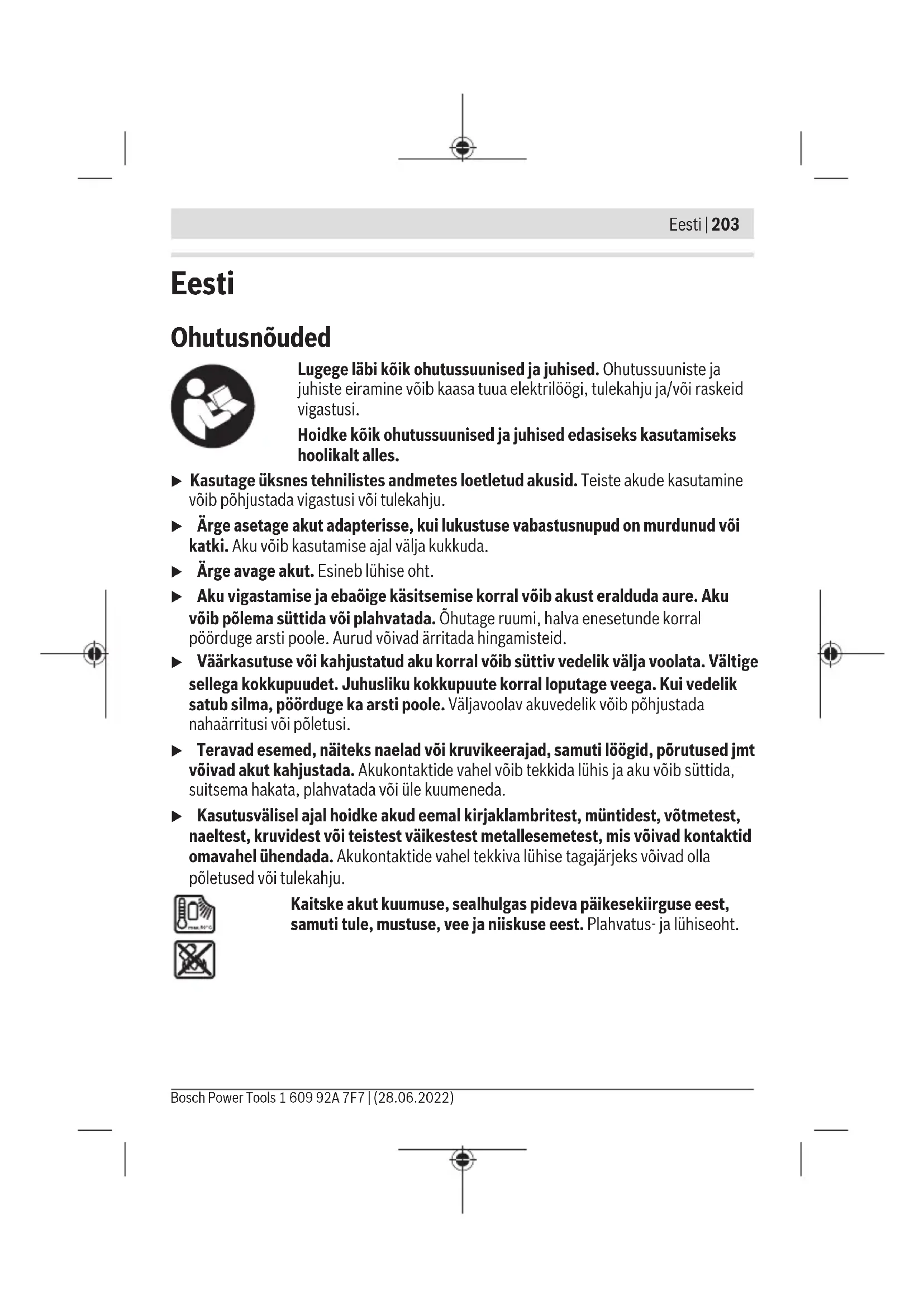 GBA 18V... ProCORE18V... Soovitatavad akulaadijad GAL18... GAX18... GAL36... A) Tegelik väljundvool oleneb ühendatud USB-seadmest. B) Tegelik väljundvool oleneb soojendusega tööriietuse jaoks seatud väärtusest. C) Piiratud võimsus temperatuuril <0°C. D) Järgnevaid akusid ei tohi kasutada akuadapteriga: – 1607A350BG – 1607A350MA – 1607A350MR – 1607A350M0 – 2607336815 – 2607337069 – 1607A350AN – 1607A350ET Aku Aku paigaldamine ja eemaldamine (vaatajooniseidA1–A2) u Aku paigaldamisel ärge rakendage jõudu. Aku on konstrueeritud nii, et seda saab aku adapterisse sisestada vaid õiges asendis. Paigaldamiseks lükake aku (6) adapterisse(1) kuni toeni. Eemaldamiseks vajutage akul (6) olevaid lukustuse vabastamisnuppusid (7) ja tõmmake aku adapterist välja (1). Bosch Power Tools 1 609 92A 7F7 | (28.06.2022)206 | Eesti Aku laetuse taseme näidik Rohelised LEDid aku laetuse taseme näidikul näitavad aku laetuse taset. Ohutuse huvides saab aku laetuse taset vaadata ainult väljalülitatud elektrilisel tööriistal. Laetuse taseme vaatamiseks vajutage laetuse taseme näidiku nuppu või . See on võimalik ka väljavõetud aku korral. Kui laetuse taseme näidiku nupuvajutamisel ei sütti ükski LED, on aku defektne ja tuleb välja vahetada. Aku tüüp GBA 18V... LED Mahtuvus Pidev tuli 3× roheline 60–100% Pidev tuli 2× roheline 30–60% Pidev tuli 1× roheline 5–30% Vilkuv tuli 1× roheline 0–5% Aku tüüp ProCORE18V... LED Mahtuvus Pidev tuli 5× roheline 80–100% Pidev tuli 4× roheline 60–80% Pidev tuli 3× roheline 40–60% Pidev tuli 2× roheline 20–40% Pidev tuli 1× roheline 5–20% Vilkuv tuli 1× roheline 0–5% Juhised aku käsitsemiseks Kaitske akut niiskuse ja vee eest. Hoidke aku temperatuuril –20 °C kuni 50 °C. Ärge jätke akut suvel autosse. Puhastage aku ventilatsiooniavasid pehme, puhta ja kuiva pintsliga. 1 609 92A 7F7 | (28.06.2022) Bosch Power ToolsEesti | 207 Oluliselt lühenenud kasutusaeg pärast laadimist näitab, et aku on muutunud kasutuskõlbmatuks ja tuleb välja vahetada. Järgige ringlussevõtu juhiseid. Kasutamine Väliste USB-seadmete laadimine (vtjnB) Akuadapteril(1) olevate USB-ühendustega saate mitmesuguste akutoitega USB- seadmete (nt mobiiltelefon, MP3-mängija, tahvelarvuti) aku tööaega pikendada. u Veenduge, et välist USB-seadet on võimalik aku adapteri USB-ühenduse kaudu laadida. Pöörake seejuures tähelepanu punktis „Tehnilised andmed“ toodud teabele. – Ühendage USB-seadme laadimiskaabel USB-pesaga(2) akuadapteril(1). – Vajutage akuadapteri aktiveerimiseks sisselülitusnuppu(5). Sisselülitusnupus(5) süttib tuli. Kui laadimiskaablit ei ole ühendatud, inaktiveeruvad USB-ühendused 30sekundi pärast automaatselt. Tuli sisselülitusnupus(5) kustub. Energia säästmiseks inaktiveeruvad USB-ühendused pärast laadimist automaatselt. Kütteelemendi ühendamine (vtjnB) – Lükake kütteelemendi ühenduspistik akuadapteril(1) olevasse pessa(3). – Vajutage akuadapteri aktiveerimiseks sisselülitusnuppu(5). Sisselülitusnupus(5) süttib tuli. Reguleerige tööriietuse soojendus soovitud väärtusele. Järgige soojendusega tööriietuse kasutusjuhendit. – Pange akuadapter(1) riietuseseme selleks ette nähtud taskusse või riputage akuadapter vööklambri(4) abil oma vööle. Tõrgete kõrvaldamine Probleem Kõrvaldamine Välist USB-seadet ei ole võimalik USB-ühenduse kaudu laadida. Aku laadimine Ühendage välise USB-seadme laadimiskaabel USB- pesaga(2) akuadapteril(1). Aktiveerige akuadapter(1) sisselülitusnupuga(5). Bosch Power Tools 1 609 92A 7F7 | (28.06.2022)208 | Eesti Probleem Kõrvaldamine Välist USB-seadet ei saa laadida USB-ühenduse kaudu akuadapteril (pöörake tähelepanu punktis „Tehnilised andmed“ olevale teabele