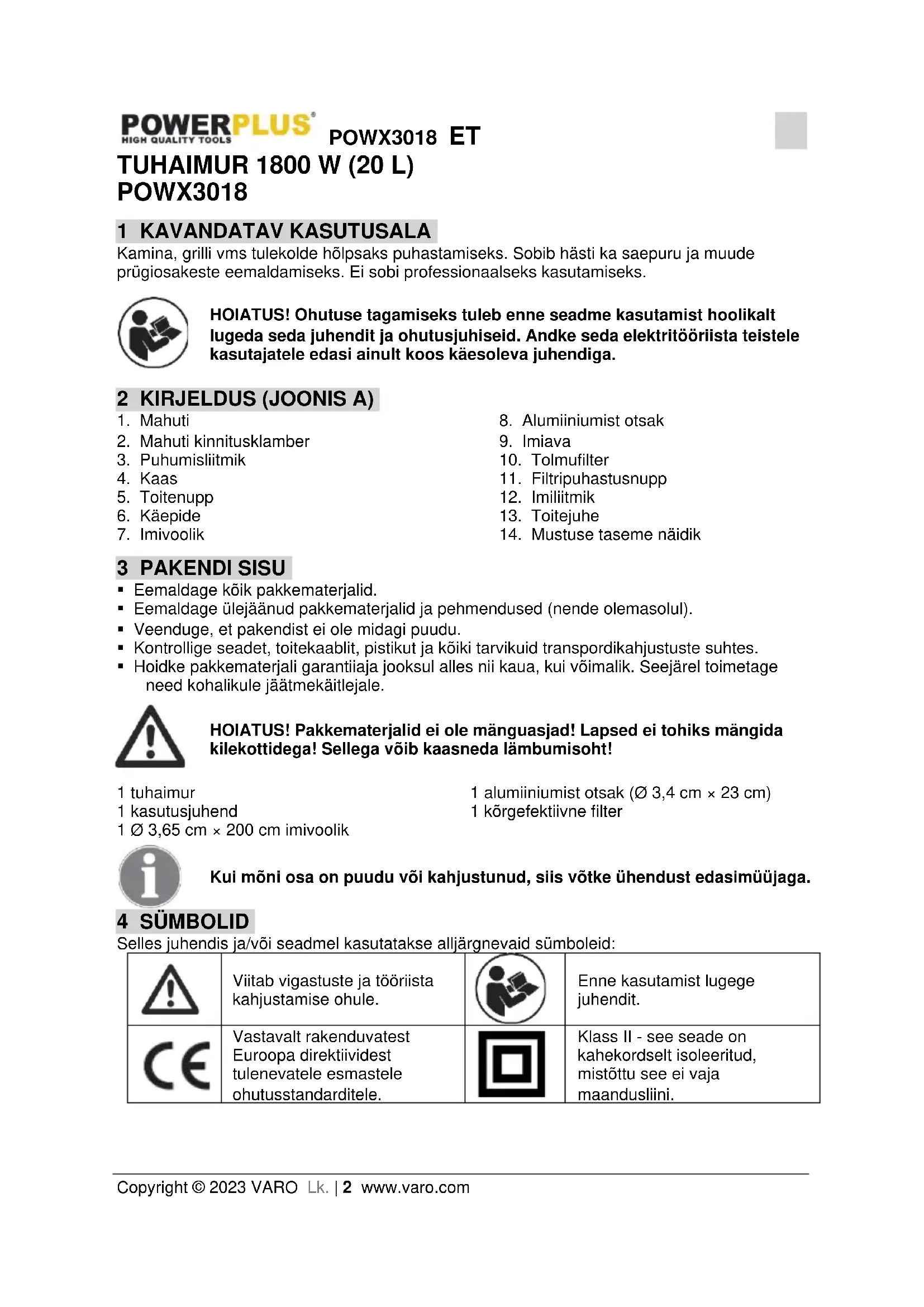 Copyright © 2023 VARO Lk. | 2 www.varo.com TUHAIMUR 1800 W (20 L) POWX3018 1 KAVANDATAV KASUTUSALA Kamina, grilli vms tulekolde hõlpsaks puhastamiseks. Sobib hästi ka saepuru ja muude prügiosakeste eemaldamiseks. Ei sobi professionaalseks kasutamiseks. HOIATUS! Ohutuse tagamiseks tuleb enne seadme kasutamist hoolikalt lugeda seda juhendit ja ohutusjuhiseid. Andke seda elektritööriista teistele kasutajatele edasi ainult koos käesoleva juhendiga. 2 KIRJELDUS (JOONIS A)