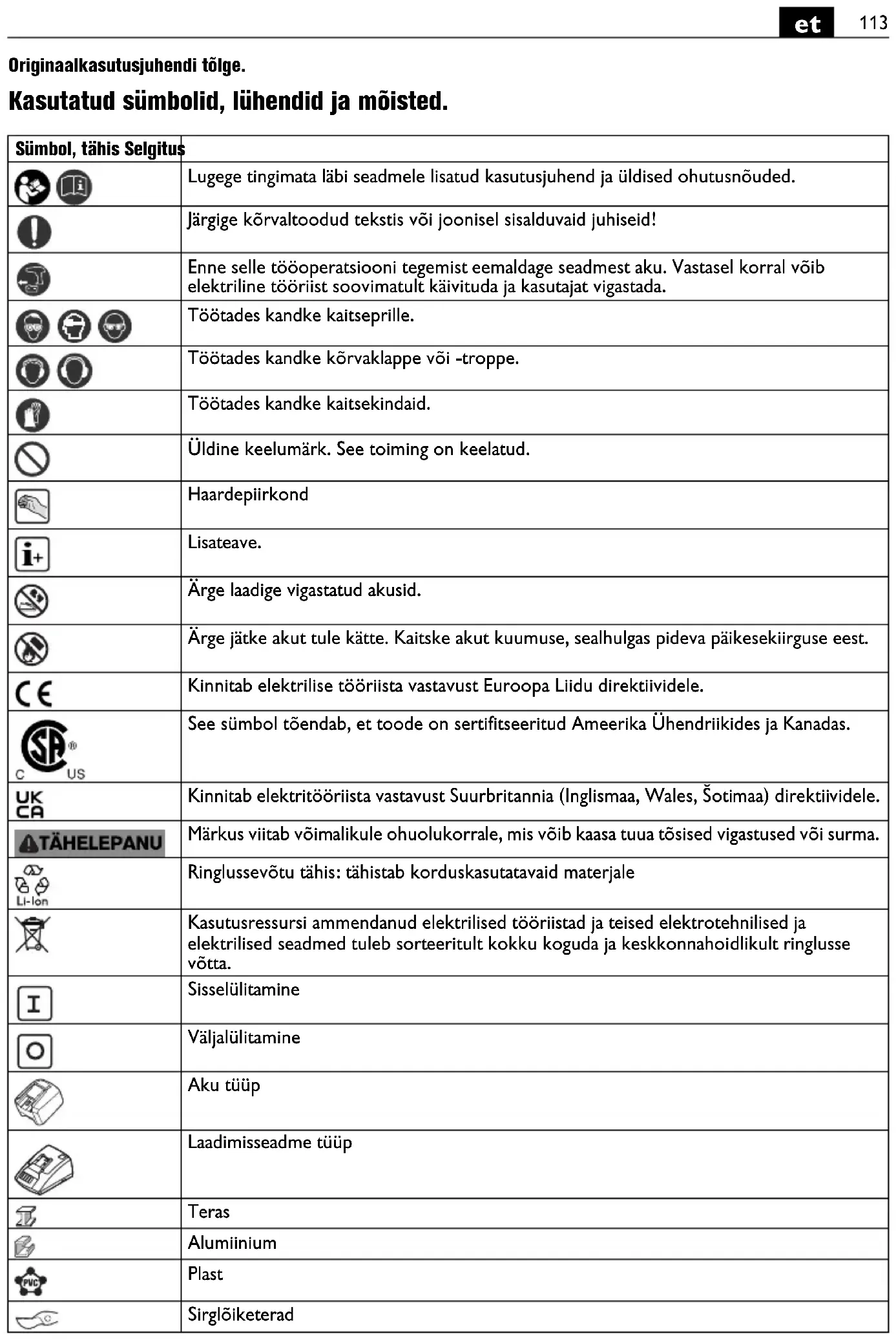Originaalkasutusjuhendi tõlge. Kasutatud sümbolid, lühendid ja mõisted. Sümbol, tähis Selgitus Lugege tingimata läbi seadmele lisatud kasutusjuhend ja üldised ohutusnõuded. Järgige kõrvaltoodud tekstis või joonisel sisalduvaid juhiseid! Enne selle tööoperatsiooni tegemist eemaldage seadmest aku. Vastasel korral võib elektriline tööriist soovimatult käivituda ja kasutajat vigastada. Töötades kandke kaitseprille. Töötades kandke kõrvaklappe või -troppe. Töötades kandke kaitsekindaid. Üldine keelumärk. See toiming on keelatud. Haardepiirkond Lisateave. Ärge laadige vigastatud akusid. Ärge jätke akut tule kätte. Kaitske akut kuumuse, sealhulgas pideva päikesekiirguse eest. Kinnitab elektrilise tööriista vastavust Euroopa Liidu direktiividele. See sümbol tõendab, et toode on sertifitseeritud Ameerika Ühendriikides ja Kanadas. Kinnitab elektritööriista vastavust Suurbritannia (Inglismaa, Wales, Šotimaa) direktiividele. Märkus viitab võimalikule ohuolukorrale, mis võib kaasa tuua tõsised vigastused või surma. Ringlussevõtu tähis: tähistab korduskasutatavaid materjale Kasutusressursi ammendanud elektrilised tööriistad ja teised elektrotehnilised ja elektrilised seadmed tuleb sorteeritult kokku koguda ja keskkonnahoidlikult ringlusse võtta. Sisselülitamine Väljalülitamine Aku tüüp Laadimisseadme tüüp Teras Alumiinium Plast Sirglõiketerad114
