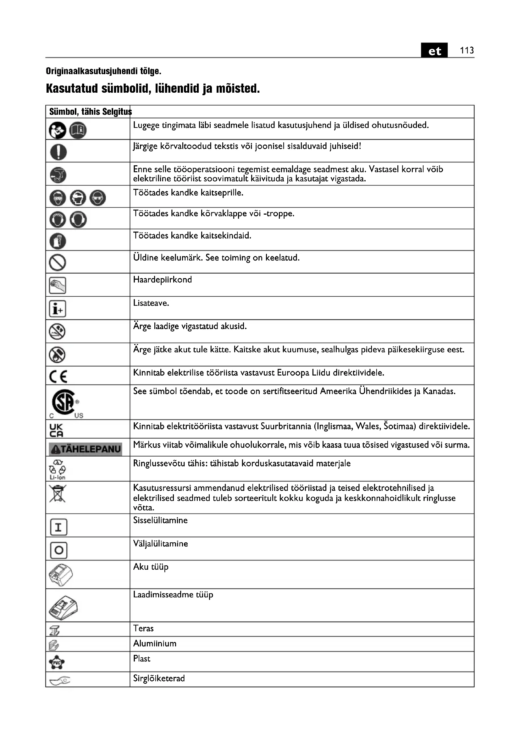 Originaalkasutusjuhendi tõlge. Kasutatud sümbolid, lühendid ja mõisted. Sümbol, tähis Selgitus Lugege tingimata läbi seadmele lisatud kasutusjuhend ja üldised ohutusnõuded. Järgige kõrvaltoodud tekstis või joonisel sisalduvaid juhiseid! Enne selle tööoperatsiooni tegemist eemaldage seadmest aku. Vastasel korral võib elektriline tööriist soovimatult käivituda ja kasutajat vigastada. Töötades kandke kaitseprille. Töötades kandke kõrvaklappe või -troppe. Töötades kandke kaitsekindaid. Üldine keelumärk. See toiming on keelatud. Haardepiirkond Lisateave. Ärge laadige vigastatud akusid. Ärge jätke akut tule kätte. Kaitske akut kuumuse, sealhulgas pideva päikesekiirguse eest. Kinnitab elektrilise tööriista vastavust Euroopa Liidu direktiividele. See sümbol tõendab, et toode on sertifitseeritud Ameerika Ühendriikides ja Kanadas. Kinnitab elektritööriista vastavust Suurbritannia (Inglismaa, Wales, Šotimaa) direktiividele. Märkus viitab võimalikule ohuolukorrale, mis võib kaasa tuua tõsised vigastused või surma. Ringlussevõtu tähis: tähistab korduskasutatavaid materjale Kasutusressursi ammendanud elektrilised tööriistad ja teised elektrotehnilised ja elektrilised seadmed tuleb sorteeritult kokku koguda ja keskkonnahoidlikult ringlusse võtta. Sisselülitamine Väljalülitamine Aku tüüp Laadimisseadme tüüp Teras Alumiinium Plast Sirglõiketerad114