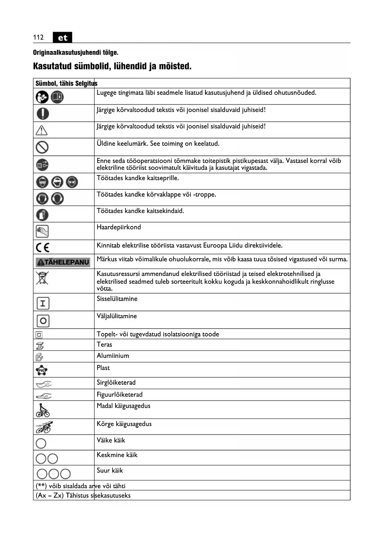 Originaalkasutusjuhendi tõlge. Kasutatud sümbolid, lühendid ja mõisted. Sümbol, tähis Selgitus Lugege tingimata läbi seadmele lisatud kasutusjuhend ja üldised ohutusnõuded. Järgige kõrvaltoodud tekstis või joonisel sisalduvaid juhiseid! Järgige kõrvaltoodud tekstis või joonisel sisalduvaid juhiseid! Üldine keelumärk. See toiming on keelatud. Enne seda tööoperatsiooni tõmmake toitepistik pistikupesast välja. Vastasel korral võib elektriline tööriist soovimatult käivituda ja kasutajat vigastada. Töötades kandke kaitseprille. Töötades kandke kõrvaklappe või -troppe. Töötades kandke kaitsekindaid. Haardepiirkond Kinnitab elektrilise tööriista vastavust Euroopa Liidu direktiividele. Märkus viitab võimalikule ohuolukorrale, mis võib kaasa tuua tõsised vigastused või surma. Kasutusressursi ammendanud elektrilised tööriistad ja teised elektrotehnilised ja elektrilised seadmed tuleb sorteeritult kokku koguda ja keskkonnahoidlikult ringlusse võtta. Sisselülitamine Väljalülitamine Topelt- või tugevdatud isolatsiooniga toode Teras Alumiinium Plast Sirglõiketerad Figuurlõiketerad Madal käigusagedus Kõrge käigusagedus Väike käik Keskmine käik Suur käik (**) võib sisaldada arve või tähti (Ax – Zx) Tähistus sisekasutuseks113