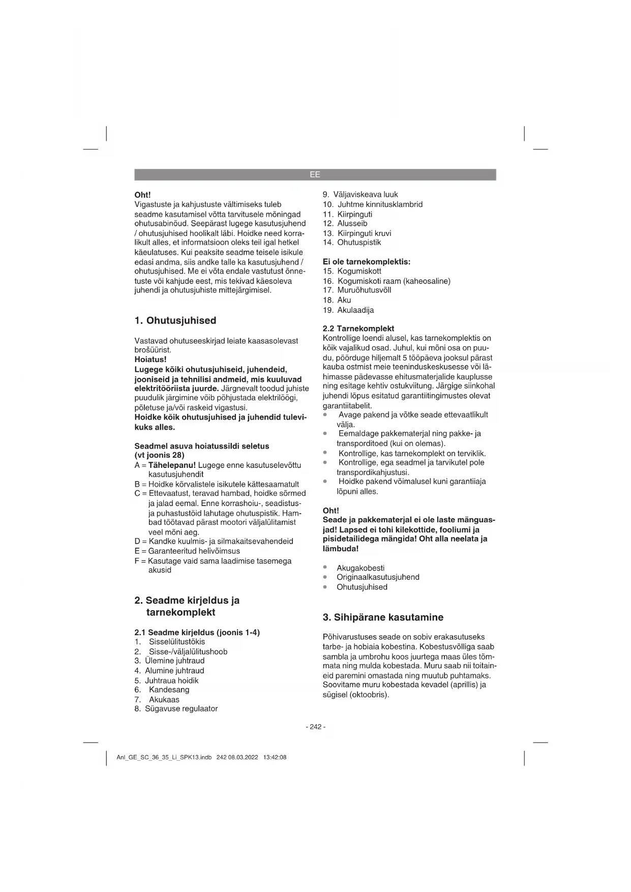 vibreerimisest juhul, kui seadet kasutatakse pikema aja jooksul või seda ei kasutata ega hooldata nõuetele vastavalt. Anl_GE_SC_36_35_Li_SPK13.indb 243 08.03.2022 13:42:08EE