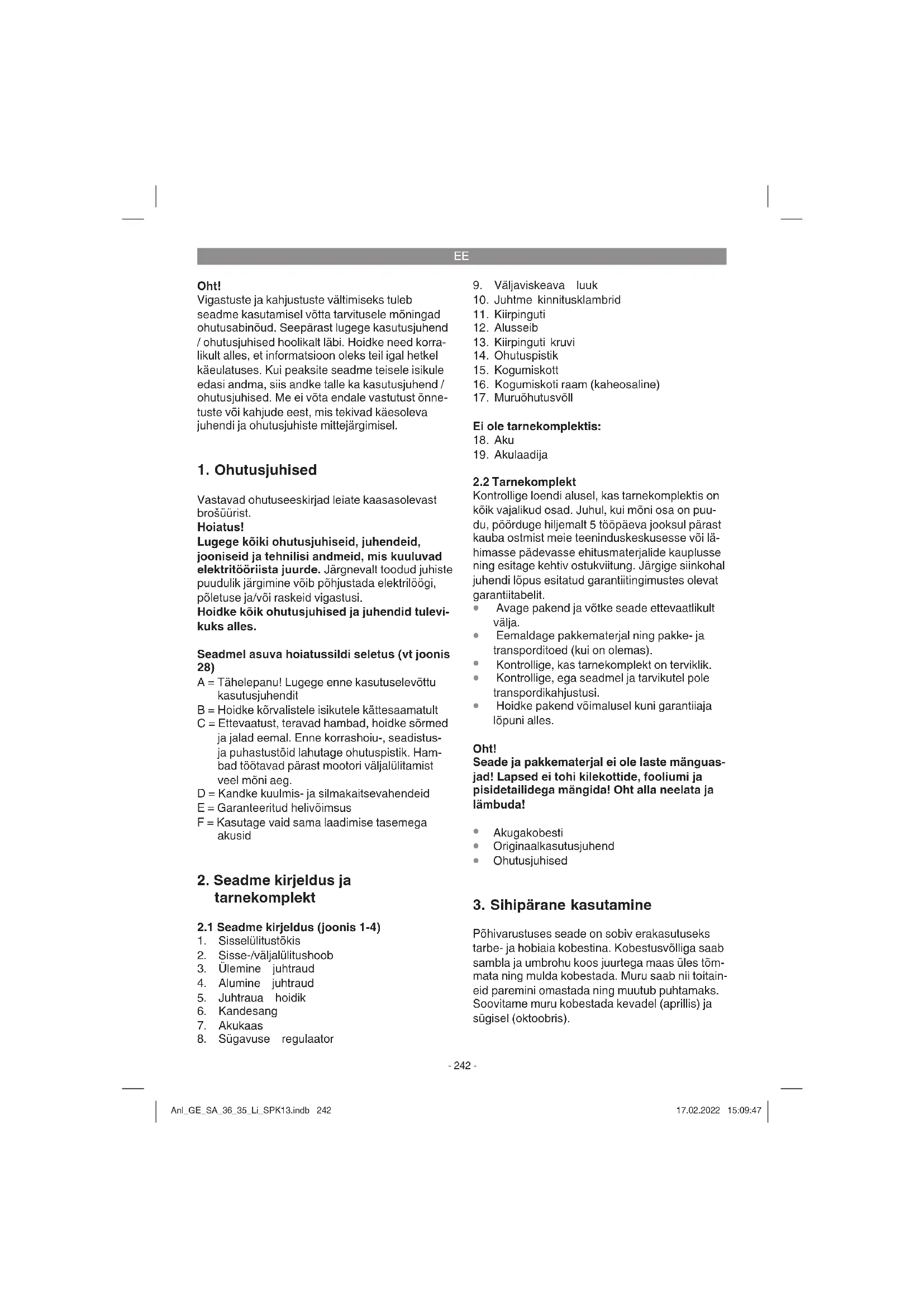 Ettevaatust! Kobesti on varustatud turvalülitiga, et vältida soovimatut kasutamist. Vahetult enne kobesti kasutuselevõttu ühendage ohutuspistik (joonis 21 / asend 14) ja töö igakordsel katkestamisel või lõpetamisel lahutage ohutuspistik. Kobesti soovimatu sisselülitamise vältimiseks on juhtraud (joonis 22 / asend 3) varustatud sisselü- litustõkisega (joonis 22 / asend 1), mida tuleb va- jutada, enne kui on võimalik lülitushooba (joonis 22 / asend 2) vajutada. Seadme käivitusaeg võib kesta mõned sekundid. Kui lülitushoob vabasta- takse, lülitub kobesti välja. Tehke see toiming mitu korda läbi, et võiksite kindel olla seadme õiges töötamises. Enne seadmel seadistuste, remont-, hooldus- ja puhastustööde tegemist lahutage alati ohutuspistik. Veenduge, et teravõll ei pöörle. Oht! Ärge avage kunagi väljaviskeava luuki, kui moo- tor veel töötab. Liikuv teraplokk võib põhjustada vigastusi. Kinnitage väljaviskeava luuk alati hooli- kalt. Tõmbevedru keerab selle suletud asendisse tagasi! Pidage alati kinni juhtraua pikkusest ohu- tust kaugusest korpuse ja kasutaja vahel. Nõlva- kutel ja mäekülgedel kobestades ja sõidusuunda Anl_GE_SA_36_35_Li_SPK13.indb 245Anl_GE_SA_36_35_Li_SPK13.indb 245 17.02.2022 15:09:4717.02.2022 15:09:47EE