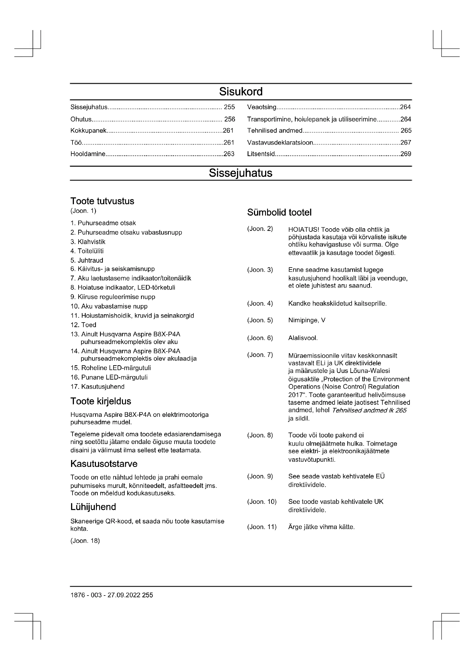 Toote kirjeldus Husqvarna Aspire B8X-P4A on elektrimootoriga puhurseadme mudel. Tegeleme pidevalt oma toodete edasiarendamisega ning seetõttu jätame endale õiguse muuta toodete disaini ja välimust ilma sellest ette teatamata. Kasutusotstarve Toode on ette nähtud lehtede ja prahi eemale puhumiseks murult, kõnniteedelt, asfaltteedelt jms. Toode on mõeldud kodukasutuseks. Lühijuhend Skaneerige QR-kood, et saada nõu toote kasutamise kohta. (Joon. 18) Sümbolid tootel (Joon. 2) HOIATUS! Toode võib olla ohtlik ja põhjustada kasutaja või kõrvaliste isikute ohtliku kehavigastuse või surma. Olge ettevaatlik ja kasutage toodet õigesti. (Joon. 3) Enne seadme kasutamist lugege kasutusjuhend hoolikalt läbi ja veenduge, et olete juhistest aru saanud. (Joon. 4) Kandke heakskiidetud kaitseprille. (Joon. 5) Nimipinge, V (Joon. 6) Alalisvool. (Joon. 7) Müraemissioonile viitav keskkonnasilt vastavalt ELi ja UK direktiividele ja määrustele ja Uus Lõuna-Walesi õigusaktile „Protection of the Environment Operations (Noise Control) Regulation 2017“. Toote garanteeritud helivõimsuse taseme andmed leiate jaotisest Tehnilised andmed, lehel Tehnilised andmed lk 265 ja sildil. (Joon. 8) Toode või toote pakend ei kuulu olmejäätmete hulka. Toimetage see elektri- ja elektroonikajäätmete vastuvõtupunkti. (Joon. 9) See seade vastab kehtivatele EÜ direktiividele. (Joon. 10) See toode vastab kehtivatele UK direktiividele. (Joon. 11) Ärge jätke vihma kätte. 1876 - 003 - 27.09.2022 255(Joon. 15) Puhurseadme kasutaja on kohustatud tagama, et inimesed ja loomad ei tu- leks töö ajal lähemale kui 15 m. Kui samas kohas töötab mitu seadmeka- sutajat, peab ohutusvahemaa olema vähemalt 15 meetrit. Puhurseade võib jõuliselt liigutada objekte, mis võivad tagasi põrkuda. Soovitusliku ohutusva- rustuse mittekasutamisel võib see põh- justada tõsiseid silmavigastusi. aaaa nnxxxxx Andmesildile on märgitud seerianum- ber. aaaa on tootmisaasta, nn on toot- misnädal. Märkus: Ülejäänud tootel toodud sümbolid/ tähised vastavad erinevates riikides kehtivatele sertifitseerimisnõuetele. Akul ja/või akulaadijal olevad sümbolid (Joon. 16) Toimetage seade elektri- ja elektroo- nikajäätmete ringlus- sevõtukeskusesse. (Kehtib vaid Euroo- pas) (Joon. 17) Kasutage akut ainult