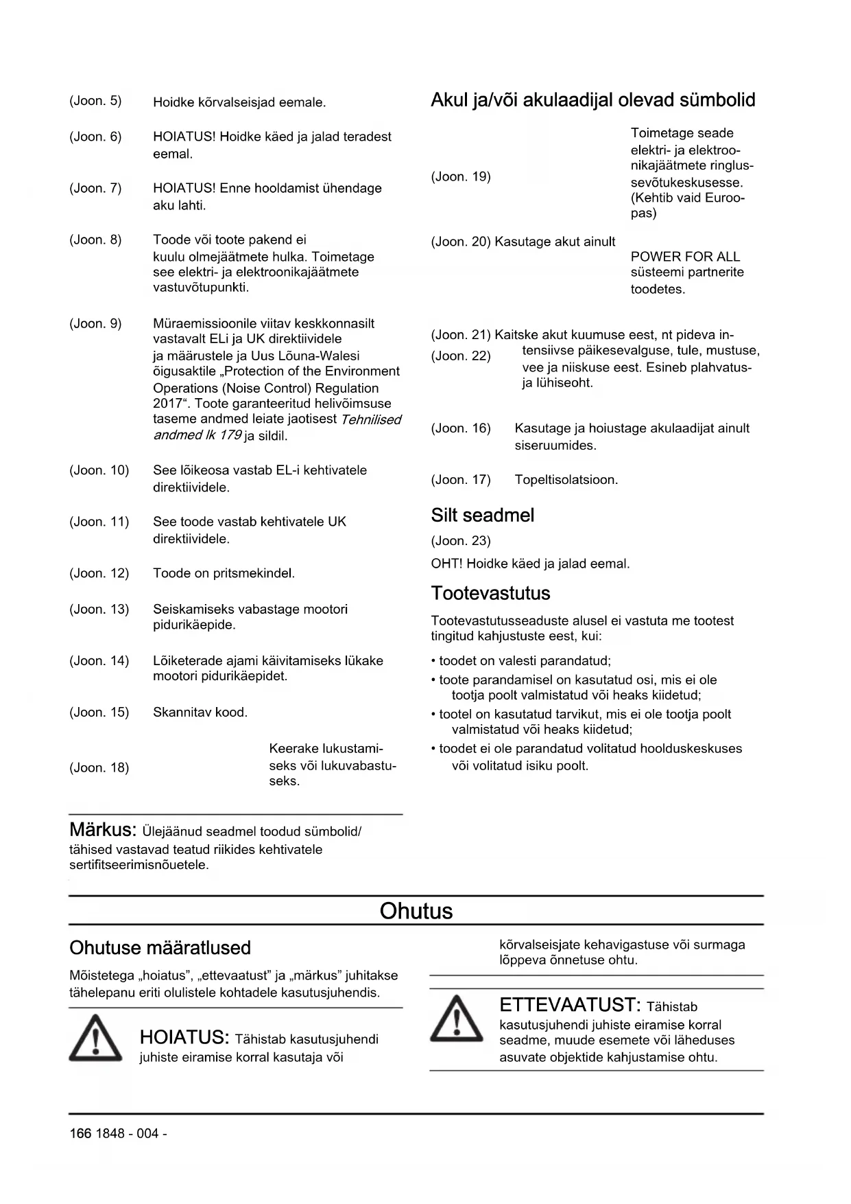 Sümbolid tootel (Joon. 2) HOIATUS! (Joon. 3) Lugege läbi juhised. (Joon. 4) HOIATUS! Olge tähelepanelik paiskuvate esemete suhtes. 1848 - 004 - 165(Joon. 5) Hoidke kõrvalseisjad eemale. (Joon. 6) HOIATUS! Hoidke käed ja jalad teradest eemal. (Joon. 7) HOIATUS! Enne hooldamist ühendage aku lahti. (Joon. 8) Toode või toote pakend ei kuulu olmejäätmete hulka. Toimetage see elektri- ja elektroonikajäätmete vastuvõtupunkti. (Joon. 9) Müraemissioonile viitav keskkonnasilt vastavalt ELi ja UK direktiividele ja määrustele ja Uus Lõuna-Walesi õigusaktile „Protection of the Environment Operations (Noise Control) Regulation 2017“. Toote garanteeritud helivõimsuse taseme andmed leiate jaotisest Tehnilised andmed lk 179 ja sildil. (Joon. 10) See lõikeosa vastab EL-i kehtivatele direktiividele. (Joon. 11) See toode vastab kehtivatele UK direktiividele. (Joon. 12) Toode on pritsmekindel. (Joon. 13) Seiskamiseks vabastage mootori pidurikäepide. (Joon. 14) Lõiketerade ajami käivitamiseks lükake mootori pidurikäepidet. (Joon. 15) Skannitav kood. (Joon. 18) Keerake lukustami- seks või lukuvabastu- seks. Märkus: Ülejäänud seadmel toodud sümbolid/ tähised vastavad teatud riikides kehtivatele sertifitseerimisnõuetele. Akul ja/või akulaadijal olevad sümbolid (Joon. 19) Toimetage seade elektri- ja elektroo- nikajäätmete ringlus- sevõtukeskusesse. (Kehtib vaid Euroo- pas) (Joon. 20) Kasutage akut ainult