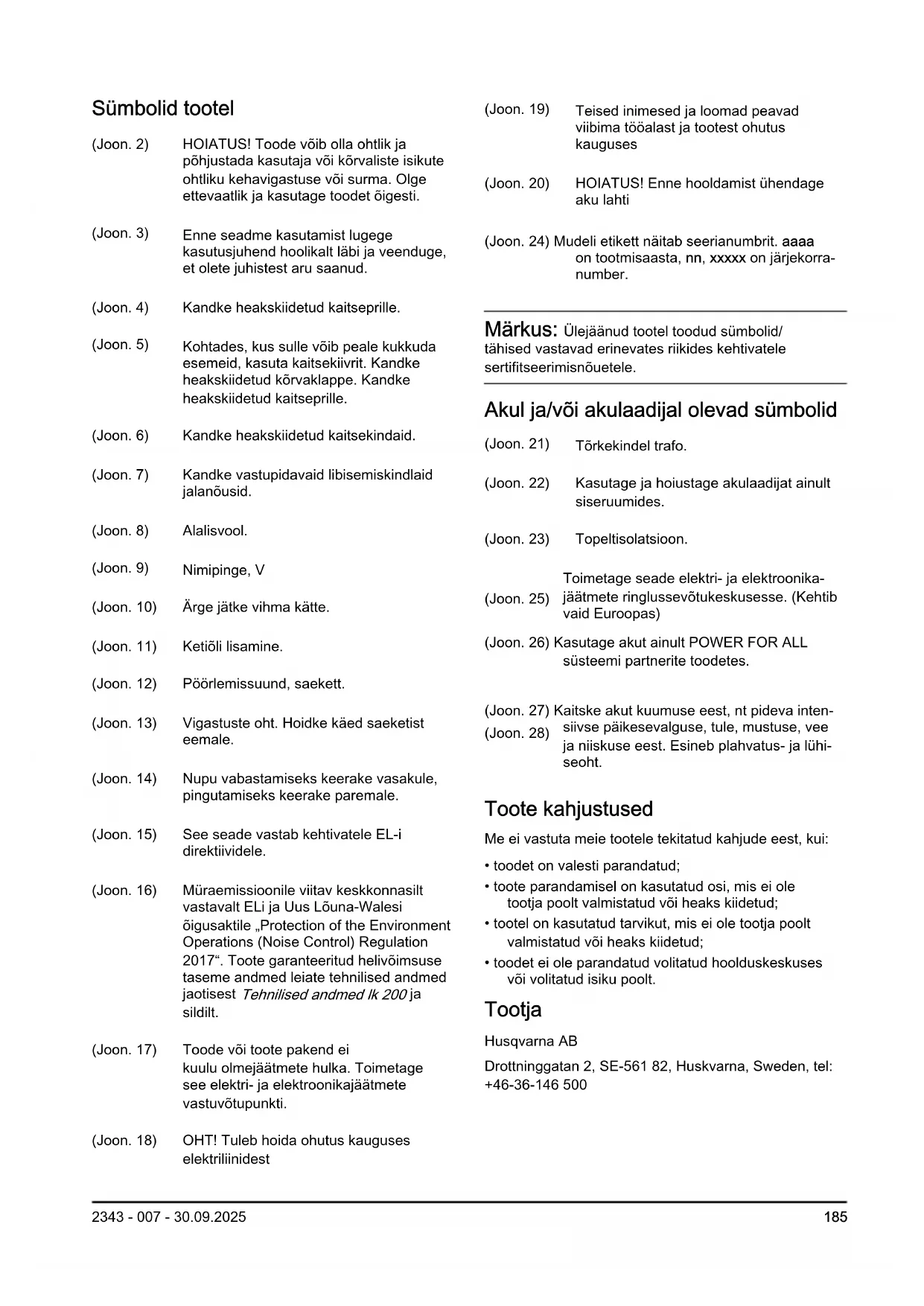 - toodet ei ole parandatud volitatud hoolduskeskuses või volitatud isiku poolt. Tootja Husqvarna AB Drottninggatan 2, SE-561 82, Huskvarna, Sweden, tel: +46-36-146 500 2343 - 007 - 30.09.2025 185Ohutus Ohutuse määratlused Mõistetega „hoiatus”, „ettevaatust” ja „märkus” juhitakse tähelepanu eriti olulistele kohtadele kasutusjuhendis. HOIATUS: Tähistab kasutusjuhendi juhiste eiramise korral kasutaja või kõrvalseisjate kehavigastuse või surmaga lõppeva õnnetuse ohtu. ETTEVAATUST: Tähistab kasutusjuhendi juhiste eiramise korral seadme, muude esemete või läheduses asuvate objektide kahjustamise ohtu. Märkus: Tähistab antud olukorras vajalikku lisateavet. Üldised ohutusjuhised elektritööriistadele HOIATUS: Lugege läbi kõik masinaga kaasas olevad hoiatused, juhised, tehnilised andmed ning tutvuge joonistega. Alltoodud juhiste eiramine võib põhjustada elektrilöögi, tulekahju ja/või ohtliku kehavigastuse. Säilitage kõik ohutusjuhised ja instruktsioonid tulevikus kasutamiseks. Märkus: Hoiatustes kasutatud mõiste „masin“ tähistab võrgutoitel (juhtmega) masinat või akutoitel (juhtmeta) masinat. Tööala ohutus