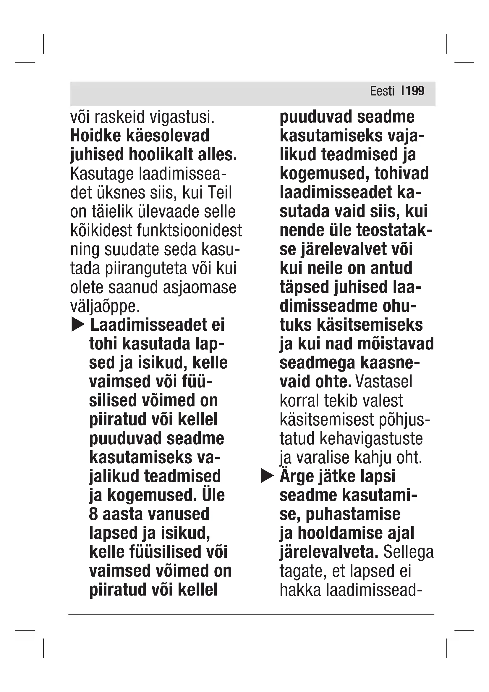 oleneb temperatuurist ja aku tüübist Laadimistoiming u Järgige võrgupinget! Võrgu- pinge peab vastama tööriista andmesildil märgitud pingele. Veenduge, et laadimi- spesa (3) ja aku kontaktid on vabad jämedat mustusest. Veenduge, et aku on täielikult kohale asetatud. Laadimistoiming algab, kui laadi- misseadme võrgupistik on pistikupesaga ühendatud ja aku laadimispessa (3) asetatud. Laadimistoiming on võimalik ainult siis, kui aku temperatuur on lubatud laadimistemperatuuripiir- konnas (0–45 °C). Intelligentne laadimisprotseduur tuvastab automaatselt aku laadimisoleku ja laeb akut aku temperatuurile ja pingele vastava optimaalse laadimisvooluga. See säästab akut ja aku jääb laadimisseadmes hoidmisel alati täielikult laetuks. Oluliselt lühenenud kasutusaeg pärast laadimist näitab, et aku on muutunud kasutuskõlbmatuks ja tuleb välja vahetada. Pideva või mitme üksteisele järg- neva laadimistsükli puhul võib laadimisseade soojeneda. See ei ole problemaatiline ega viita laadimisseadme tehnilisele defektile. Eesti| 203 Laadimisajad Järgnevast tabelist leiate olene- valt aku tüübist soovitud laetusetaseme saavutamiseks vajaliku ligikaudse aja minutites. Laadimisaeg oleneb aku tüübist ja temperatuurist. P4A 18-C70 Taaslaetavad 18V POWER FOR ALL süs- teemi akud 1,5 Ah ≈24 ≈33 2,0 Ah ≈32 ≈45 2,5 Ah ≈40 ≈60 3,0 Ah ≈48 ≈72 4,0 Ah ≈64 ≈95 4,0 Ah Power Plus ≈69 ≈88 5,0 Ah ≈80 ≈105 6,0 Ah ≈96 ≈130 vastab laetusetasemele ≈ 80% vastab täis laadimisolekule Näitude tähendus Roheline (kiiresti) vilkuva valgusega laetusetaseme näit Kiirlaadimistoimin- gust signaliseeri- takse rohelise laadimisoleku näidu (2) kiire vilkumisega. Akut saab mis tahes ajal välja võtta ja kasutada. Kui on saavutatud 80% aku mahtuvusest, aeglustub rohelise laadimisoleku näidu vilkumine. Kiirlaadimine on nüüd lõppenud. Kui aku jääb laadimisseadmesse, viiakse laadimistoiming väiksema kiirusega lõpuni. Roheline (aeglaselt) vilku- va valgusega laetusetase- me näit Aku laetusetasemel u 80% vilgub roheline laetuseta- seme näit (2) aeglaselt. Aku võib koheseks kasutamiseks välja võtta. Eesti204 | Aku laadimisseisundi näidu pidev valgus Rohelise laadimi- soleku näidu (2) pidev põlemine siganaliseerib, et aku on täielikult laetud. Seejärel võib aku laadi- misseadmest välja võtta ja seadmega ühendada. Ilma sisseasetatud akuta signa- liseerib laadimisoleku näidu (2), pidev põlemine, et võrgupistik on ühendatud pistikupesaga ja laadi- misseade on töövalmis. Temperatuurikontrolli näi- du pidev punane põlemine Punase näidu (1) pidev põlemine signaliseerib, et aku temperatuur on väljaspool lubatud laadimistemperatuuri piirkonda (0–45 °C). Laadimine algab nii- pea, kui aku temperatuur on ettenähtud vahemikus. Punase veanäidu vilkuv valgus Punase näidu (1) vilkuv valgus signaliseerib muust laadimistoimingu tõrkest (vaadake „Akut ei laeta“, Lehekülg 204). Veaotsing Akut ei laeta Akut ei laeta; punane näit (1) vilgub ja roheline laetusetase- me näit (2) põleb pidevalt. Põhjus: laadimisseade tuvastas sisemise vea Kõrvaldamine: veenduge, et kõik akud on täielikult sisse asetatud. TEemaldage toitepistik ja sises- tage see uuesti. Kui tõrge ilmneb uuesti, laske laadijat Husqvarna toodete volitatud müügijärgses teeninduskeskuses kontrollida. Eesti| 205 Põhjus: aku ei ole sisse asetatud Kõrvaldamine: asetage aku kor- rektselt laadimisseadmesse. Põhjus: aku- ja laadimiskontaktid on määrdunud Kõrvaldamine: puhastage aku- ja laadimiskontaktid; nt aku korduva sisseasetamise ja väl- javõtmisega. Põhjus: aku on defektne Kõrvaldamine: asendage aku. Akut ei laeta ja näit (1) põleb punaselt. Põhjus: aku temperatuur on lubatud laadimistemperatuuriva- hemikust väljas. Kõrvaldamine: oodake, kuni aku temperatuur on jälle lubatud laadimistemperatuurivahemikus (0–45 °C). Näidud ei põle Ükski näit ei põle, akut ei laeta. Põhjus: pistikupesa, võrgukaabel või laadimisseade on defektne Kõrvaldamine: kontrollige võrgu- pinget. Laske laadimisseadet vajadusel volitatud klienditeenin- duskohas kontrollida. Põhjus: laadimisseadme võrgu- pistik ei ole (õigesti) ühendatud Kõrvaldamine: asetage võrgupis- tik (täielikult) pistikupessa. Kasutuskõlbmatuks muutunud seadmete käitlus Akulaadimisseadmed, lisatarvikud ja pakendid tuleb keskkonnasä- ästlikult utiliseerida. Ärge visake kasutusressursi ammendanud elektrilisi tööriistu olmejäätmete hulka! Eesti206 | Üksnes EL liikmesriikidele: Vastavalt Euroopa Parlamendi ja nõukogu direktiivile 2012/19/EL elektri- ja elektroonikaseadmete jäätmete kohta ning direktiivi ülevõtvatele riiklikele õigusak- tidele tuleb kasutuskõlbmatuks muutunud elektrilised tööriistad eraldi kokku koguda ja keskkon- nasäästlikult korduskasutada või ringlusse võtta. Vale jäätmekäitluse korral võivad vanad elektri- ja elektroonikase- admed, milles sisaldub kahjulikke aineid, kahjustada keskkonda ja inimeste tervist. Latviešu Drošības noteikumi Izlasiet drošības notei- kumus un norādījumus lietošanai. Drošības noteikumu un norādījumu neievērošana var izraisīt aizdegšanos un būt par cēloni elek- triskajam triecienam vai nopietnam savainoju- mam. Pēc izlasīšanas saglabājiet šo lie- tošanas pamācību turpmākai izman- tošanai. Lietojiet uzlādes ierīci tikai tad, ja esat pilnībā iepazinies ar visām tās funkcijām un spējat tās pielietot bez ie- robežojumiem vai arī esat pienācīgi apmācīts darbam ar to. u Šī uzlādes ierīce nav paredzēta, lai to lie- totu bērni un perso- nas ar ierobežotām fiziskajām, Latviešu| 207 sensorajām vai garīgajām spējām vai ar nepietie- košu pieredzi un zināšanām. Šo uzlādes ierīci var lie- tot bērni no 8 gadu vecuma un perso- nas ar ierobežotām fiziskajām, sensorajām vai garīgajām spējām, kā arī personas ar nepietiekošu pie- redzi un zināšanām pie nosacījuma, ka darbs notiek pa