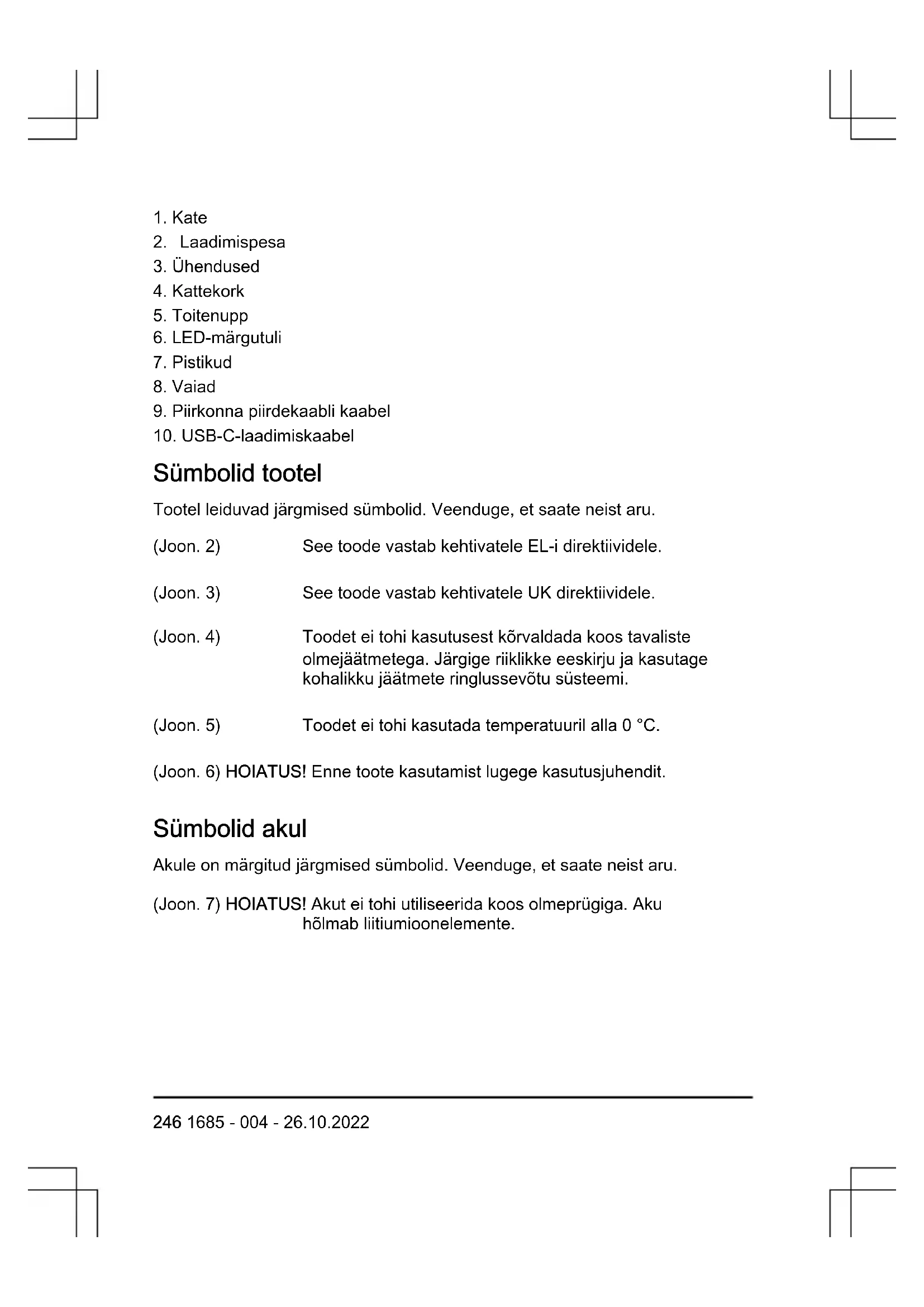 Sümbolid tootel Tootel leiduvad järgmised sümbolid. Veenduge, et saate neist aru. (Joon. 2) See toode vastab kehtivatele EL-i direktiividele. (Joon. 3) See toode vastab kehtivatele UK direktiividele. (Joon. 4) Toodet ei tohi kasutusest kõrvaldada koos tavaliste olmejäätmetega. Järgige riiklikke eeskirju ja kasutage kohalikku jäätmete ringlussevõtu süsteemi. (Joon. 5) Toodet ei tohi kasutada temperatuuril alla 0°C. (Joon. 6) HOIATUS! Enne toote kasutamist lugege kasutusjuhendit. Sümbolid akul Akule on märgitud järgmised sümbolid. Veenduge, et saate neist aru. (Joon. 7) HOIATUS! Akut ei tohi utiliseerida koos olmeprügiga. Aku hõlmab liitiumioonelemente. 246 1685 - 004 - 26.10.2022Ohutus Ohutuse määratlused Mõistetega „hoiatus”, „ettevaatust” ja „märkus” juhitakse tähelepanu eriti olulistele kohtadele kasutusjuhendis. HOIATUS: Tähistab kasutusjuhendi juhiste eiramise korral kasutaja või kõrvalseisjate kehavigastuse või surmaga lõppeva õnnetuse ohtu. ETTEVAATUST: Tähistab kasutusjuhendi juhiste eiramise korral seadme, muude esemete või läheduses asuvate objektide kahjustamise ohtu. Märkus: Tähistab antud olukorras vajalikku lisateavet. Ohutusjuhised kasutamisel HOIATUS: Enne toote kasutamist lugege läbi järgmised hoiatused.