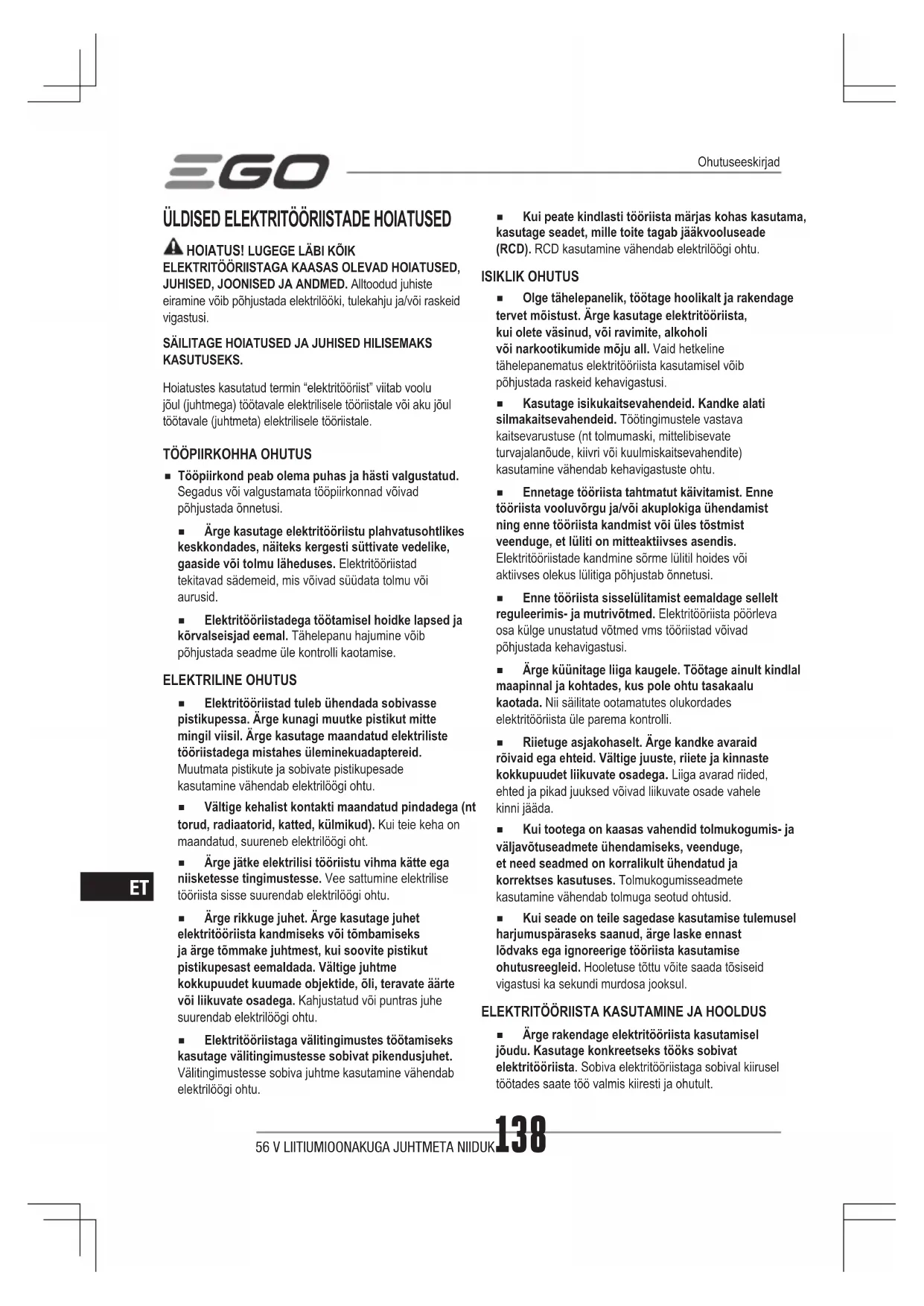 KASUTAMISEL OHT: Selle masina kasutamisel tuleb järgida käesolevas juhendis kirjeldatud ohutusreegleid. Nagu kõigi elektriliste tööriistade puhul, võib ka antud seadmega hooletult ringi käies põhjustada raskeid vigastusi. Seade võib vigastada jalgu või käsi ja lennutada objekte. Turvanõuete eiramisel võite põhjustada raskeid või surmavaid vigastusi. HOIATUS: Juhtmeta muruniidukite kasutamisel tuleb alati järgida järgnevaid elementaarseid ohutusnõudeid. Sedasi vähendate tulekahju, elektrilöögi ja vigastuste ohtu.OLULINEENNE KASUTAMIST LUGEGE TÄHELEPANELIKULT. HOIDKE EDASISEKS KASUTAMISEKS ALLES.OHUTUSREEGLID JUHTMETA MURUNIIDUKI KASUTA-MISELETTEVAATUST - ÄRGE PUUDUTAGE PÖÖRLEVAID TERI!56 V LIITIUMIOONAKUGA JUHTMETA NIIDUK140