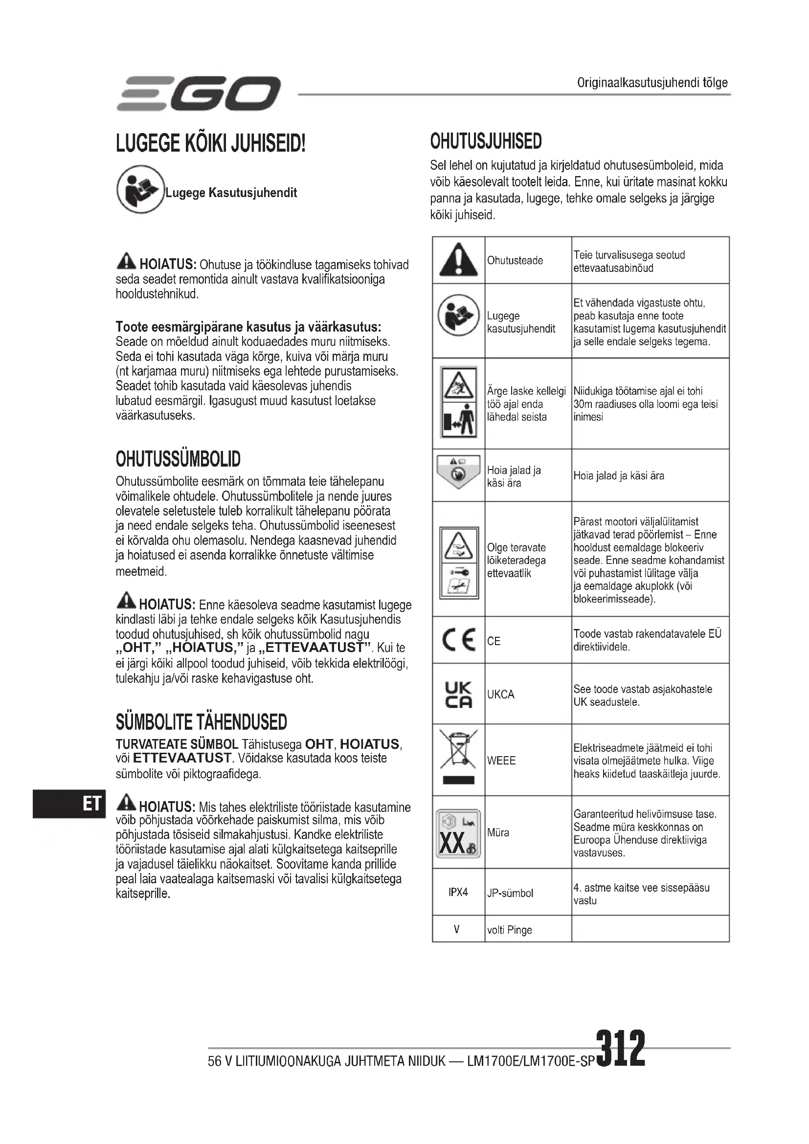 KASUTAMISEL OHT: Selle masina kasutamisel tuleb järgida käesolevas juhendis kirjeldatud ohutusreegleid. Nagu kõigi elektriliste tööriistade puhul, võib ka antud seadmega hooletult ringi käies põhjustada raskeid vigastusi. Seade võib vigastada jalgu või käsi ja lennutada objekte. Turvanõuete eiramisel võite põhjustada raskeid või surmavaid vigastusi. HOIATUS: Juhtmeta muruniidukite kasutamisel tuleb alati järgida järgnevaid elementaarseid ohutusnõudeid. Sedasi vähendate tulekahju, elektrilöögi ja vigastuste ohtu.OLULINEENNE KASUTAMIST LUGEGE TÄHELEPANELIKULT. HOIDKE EDASISEKS KASUTAMISEKS ALLES.56 V LIITIUMIOONAKUGA JUHTMETA NIIDUK — LM1700E/LM1700E-SP 315