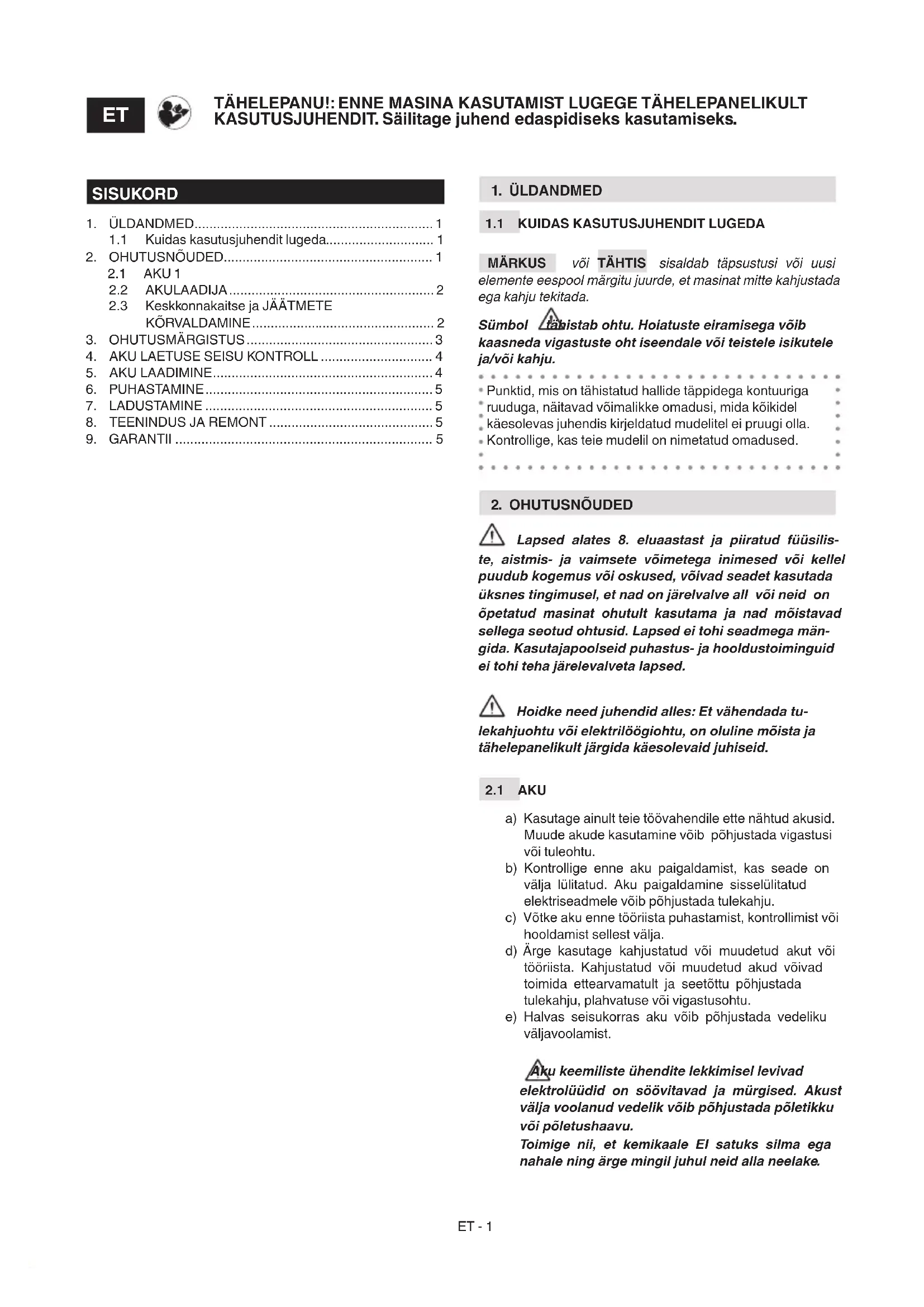 a) Kasutage ainult teie töövahendile ette nähtud akusid. Muude akude kasutamine võib põhjustada vigastusi või tuleohtu. b) Kontrollige enne aku paigaldamist, kas seade on välja lülitatud. Aku paigaldamine sisselülitatud elektriseadmele võib põhjustada tulekahju. c) Võtke aku enne tööriista puhastamist, kontrollimist või hooldamist sellest välja. d) Ärge kasutage kahjustatud või muudetud akut või tööriista. Kahjustatud või muudetud akud võivad toimida ettearvamatult ja seetõttu põhjustada tulekahju, plahvatuse või vigastusohtu. e) Halvas seisukorras aku võib põhjustada vedeliku väljavoolamist. Aku keemiliste ühendite lekkimisel levivad elektrolüüdid on söövitavad ja mürgised. Akust välja voolanud vedelik võib põhjustada põletikku või põletushaavu. Toimige nii, et kemikaale EI satuks silma ega nahale ning ärge mingil juhul neid alla neelake. TÄHELEPANU!: ENNE MASINA KASUTAMIST LUGEGE TÄHELEPANELIKULT KASUTUSJUHENDIT. Säilitage juhend edaspidiseks kasutamiseks.