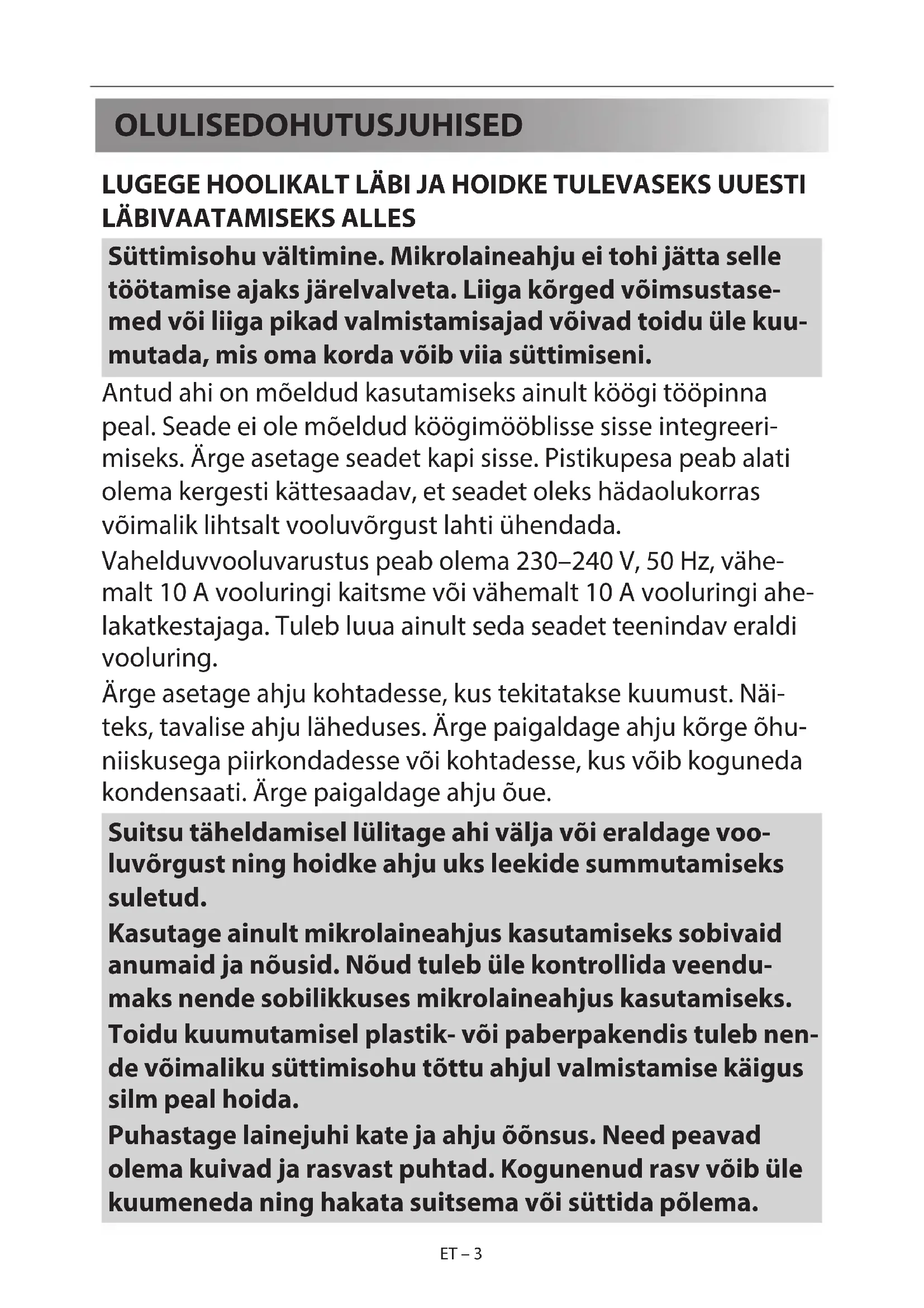 ahju seista, et vältida viivitusega keema paiskumist. Ärge valmistage koorega mune ega kuumutage kõvaks keedetud mune mikrolaineahjus, kuna nad võivad plahva- tada isegi peale mikrolaineahju välja lülitamist. Purusta- mata või segamata munade valmistamiseks või taaskuu- mutamiseks läbistage munakollased ja -valged. Koorige ET – 5 ET – 5 muutke. Kõikidele teistele, peale asjatundjatest isikute, on igasugused hooldus- ja remonditööd, millised hõlma- vad mikrolainete eest kaitset pakkuva katte eemaldamist, ohtlikud. Ärge kasutage ahju, kui selle uks on avatud ega muutke ahjuuk- se turvalukke mingilgi moel. Ärge kasutage ahju, kui uksetihen- di ja tihenduspindade vahel on mõni ese. Ärge laske uksetihenditele ja ukse ümber asuvatele pinda- dele koguneda rasval või mustusel. Puhastage ahju regu- laarselt ning eemaldage kõik kogunenud toidujäägid. Järgige peatükis „Hooldamine ja puhastamine“ toodud juhiseid. Ahju puhtana mitte hoidmine võib viia pindade kahjustumiseni, mis võib omakorda mõjuda negatiivselt seadme elueale ning tuua kaasa ohuolukorra. Südamestimulaatoriga kasutajad peaksid pidama nõu oma arsti või südamestimulaatori tootjaga võimalike ettevaatusabinõude suhtes seoses mikrolaineahjudega. Elektrilöögi vältimine