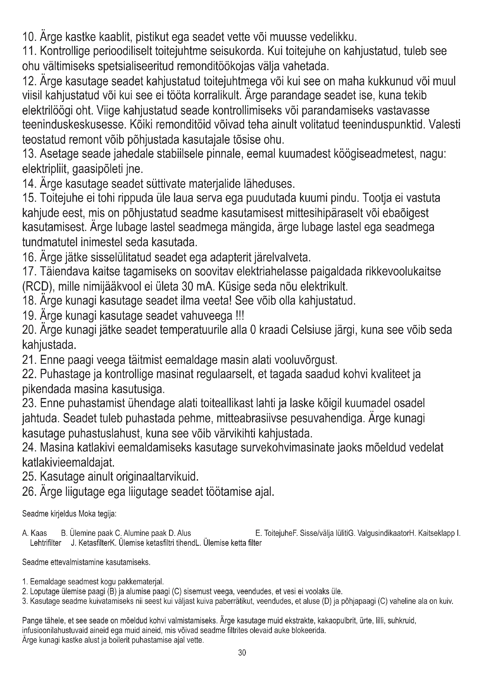 Seadme kirjeldus Moka tegija: A. Kaas B. Ülemine paak C. Alumine paak D. Alus E. ToitejuheF. Sisse/välja lülitiG. ValgusindikaatorH. Kaitseklapp I. Lehtrifilter J. KetasfilterK. Ülemise ketasfiltri tihendL. Ülemise ketta filter Seadme ettevalmistamine kasutamiseks.