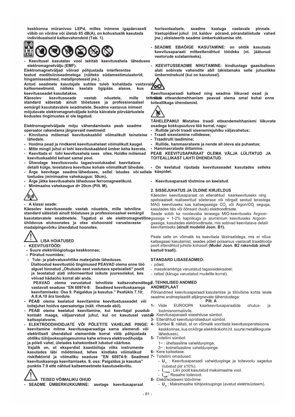 Keevitusaparaadikasutajapeabolemapiisavaltteadlikseadme ohutust kasutamisest ning informeeritud kaarkeevitusega kaasnevatest riskidest, nendele vastavatest kaitsejuhistest ja hädaabi protseduuridest. (Viidata samuti seadusele “EN 60974-9: Seadmed keevituskaarega keevitamiseks. Osa 9: Paigaldus ja kasutamine”). - Vältige otsest kontakti keevitussfääriga; generaatori poolt toodetudtühijooksupingevõibollaohtlikmõningateljuhtudel. - Keevituskaablite ühendust, kontrolli ja parandust teostades peabseadeolemaväljalülitatudjatoiteallikastlahutatud. - Enne põleti kulunud osade väljavahetamist lülitage keevitusaparaatväljajalahutagevooluvõrgust. - Teostage paigaldamisega kaasnevad elektritööd ohutusnormide ja seaduste kohaselt. - Keevitusaparaat peab olema ühendatud ainult vastava neutraalsetmaandussüsteemiomavatoiteallikaga. - Kontrollige, et toitepistik on korrektselt maandatud. - Ärge kasutage keevitusaparaati märjas või niiskes keskkonnasjavihmakäes. - Ärge kasutage vigastatud isolatsiooniga või lõdvestunud ühendustegakaableid. - Ärge keevitage paakide, mahutite või torude peal, mis sisaldavad või milles on eelnevalt olnud tuleohtlikud vedelikudvõigaasid. - Vältigetöötamistkloorilahustigapuhastatudpindadepealvõi sarnaste kemikaalide läheduses. - Ärgekeevitagesurveallolevatemahutitepeal. - Eemaldage tööpiirkonnast kõik tuleohtlikud materjalid (nt. puit, paber, riidelapid). - Tagage piisav ventilatsioon või kasutage suitsu äratõmbeventilaatoreid keevituskaare läheduses. On tähtis kontrollida regulaarselt keevitusel eralduva suitsu koostist, konsistentsijaekspositsioonikestvust. - Hoidke gaasiballoon kaugel soojusallikatest, kaasaarvatud päiksekiirgusest (kui kasutusel). - Kasutage keevituskäpa, töödeldava eseme ja võimalike lähedusesasuvatemaandatudmetallistosade(ligipääsetavad) puhuladekvaatsetelektrilistisolatsiooni. Seeontavaliseltsaavutatavkandestööksettenähtuidkindaid, jalatseid, peakatet ja riietusesemeid ning seistes vastava platvormivõiisoleeritudmatipeal. - Kaitske alati silmi eeskirja EN 175 kohaselt maskitele või kiivritele monteeritud ltritega, mis vastavad eeskirjale UNI EN169võiUNIEN379. Kasutagealatitulekindlatkaitseriietust(vastavuseseeskirjaga UNI EN 11611) ja keevituskindaid (vastavuses eeskirjaga UNI EN 12477) vältimaks naha kokkupuudet keevituskaare poolt tekitatava ultraviolett või infrapunase kiirgusega; keevituskaare läheduses viibivad isikud peavad olema kaitstudmittepeegeldavatekaitsevarjestevõikaitseeesriiete abil. - Müra:Juhul,kuieritiintensiivsekeevitustegevusetulemusena- 81 - keskkonna müranivoo LEPd, milles inimene igapäevaselt viibibonvõrdnevõiületab85dB(A),onkohustuslikkasutada individuaalseidkaitsevahendeid(Tab.1). - Keevitusel kasutatav vool tekitab keevitusahela läheduses elektromagnetvälju(EMF). Elektromagnetväljad võivad põhjustada interferentse teatud meditsiiniseadmetega (näiteks südamestimulaatorid, hingamisseadmed, metallproteesid jne.). Antud seadmete kasutajate suhtes tuleb kohaldada vastavaid kaitsemeetmeid, näiteks keelata ligipääs alasse, kus keevitusseadetkasutatakse. Käesolev keevitusseade vastab nõuetele, mille tehniline standard sätestab ainult tööstuses ja professionaalsel eemärgilkasutatavateleseadmetele.Seadmevastavusinimest mõjutavateelektromagnetväljadekohtakäivatelepiirväärtustele kodustes tingimustes ei ole tagatud. Elektromagnetväljade mõju vähendamiseks peab seadme operaatorrakendamajärgnevaidmeetmeid: - Kinnitama mõlemad keevituskaablid võimalikult teineteise lähedale. - Hoidmapeadjarindkeretkeevitusahelastvõimalikultkaugel. - Mittemingiljuhuleitohikeevituskaableidümberkehakeerata. - Keevitadaei tohikeevitusahelasees olles.Hoidkemõlemad keevituskaablidkehastsamalpool. - Ühendage keevitusvoolu tagasivoolukaabel keevitatava detailikülge,teostatavakeevitusekohalevõimalikultlähedale. - Ärge keevitage seadmeläheduses, sellel istudes võisellele toetudes(minimaalnevahekaugus:50cm). - Ärgejätkekeevitusahelalähedusseferromagneetikuid. - Minimaalnevahekaugusd=20cm(Pilt.M). - Aklassiseade: Käesolev keevitusseade vastab nõuetele, mille tehniline standard sätestab ainult tööstuses ja professionaalsel eemärgil kasutatavatele seadmetele. Tagatud ei ole elektromagnetiline ühilduvus eluhoonetes ja otse eluhooneid varustavasse madalpingevõrkuühendatudhoonetes. LISA HOIATUSED - KEEVITUSTÖÖD: - Suure elektrilöögiohuga keskkonnas; - Piiratud ruumides; - Tule-japlahvatusohtlikematerjalideläheduses. ÜlaltoodudkeevitustöötingimusedPEAVADolemaennetöö algusthinnatud„Ohutusteeestvastutavaspetsialisti“poolt ja teostatud alati informeeritud isikute juuresolekul, kes võivadhädaohukorralabianda. PEAVAD olema varustatud tehniliste kaitsevahenditega vastavaltseaduse”EN60974-9: Seadmedkeevituskaarega keevitamiseks:Osa9.Paigaldusjakasutus.”Peatükis7.10; A.8;A.10 ära toodule. - PEAB olema keelatud keevitamine keevitustusseadet või toitejuhethoidvaoperaatoriga(näit.rihmadeabil). - PEAB olema keelatud keevitamine, kui keevitajal puudub kontakt maaga, väljaarvatud juhul, kui on kasutusel vastav kaitseplatvorm. - ELEKTROODIHOIDJATE VÕI PÕLETITE VAHELINE PINGE: keevitamine mitme keevitusaparaadiga sama elemendi või elektriliselt ühendatud elementide korral võib põhjustada ohtlikutühijooksupingesummakaheerinevaelektroodihoidja japõletivahel,ületadeskahekordseltlubatudväärtuse. Vajalik on, et eksperdist kaastöötaja viiks instrumente kasutades läbi mõõtmised, tehes kindlaks võimalikud riskifaktorid ja võimaliku seaduse ”EN 60974-9: Seadmed keevituskaaregakeevitamiseks.9.osa:Paigaldusjakasutus” punktis7.9ettenähtudkaitsemeetmetekasutuselevõtu.
