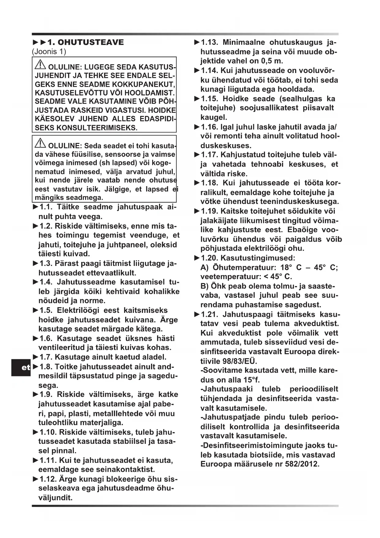 SEKS KONSULTEERIMISEKS. OLULINE: Seda seadet ei tohi kasuta- da vähese füüsilise, sensoorse ja vaimse võimega inimesed (sh lapsed) või koge- nematud inimesed, välja arvatud juhul, kui nende järele vaatab nende ohutuse eest vastutav isik. Jälgige, et lapsed ei mängiks seadmega. ►1.1. Täitke seadme jahutuspaak ai- nult puhta veega. ►1.2. Riskide vältimiseks, enne mis ta- hes toimingu tegemist veenduge, et jahuti, toitejuhe ja juhtpaneel, oleksid täiesti kuivad. ►1.3. Pärast paagi täitmist liigutage ja- hutusseadet ettevaatlikult. ►1.4. Jahutusseadme kasutamisel tu- leb järgida kõiki kehtivaid kohalikke nõudeid ja norme. ►1.5. Elektrilöögi eest kaitsmiseks hoidke jahutusseadet kuivana. Ärge kasutage seadet märgade kätega. ►1.6. Kasutage seadet üksnes hästi ventileeritud ja täiesti kuivas kohas. ►1.7. Kasutage ainult kaetud aladel. ►1.8. Toitke jahutusseadet ainult and- mesildil täpsustatud pinge ja sagedu- sega. ►1.9. Riskide vältimiseks, ärge katke jahutusseadet kasutamise ajal pabe- ri, papi, plasti, metalllehtede või muu tuleohtliku materjaliga. ►1.10. Riskide vältimiseks, tuleb jahu- tusseadet kasutada stabiilsel ja tasa- sel pinnal. ►1.11. Kui te jahutusseadet ei kasuta, eemaldage see seinakontaktist. ►1.12. Ärge kunagi blokeerige õhu sis- selaskeava ega jahutusdeadme õhu- väljundit. ►1.13. Minimaalne ohutuskaugus ja- hutusseadme ja seina või muude ob- jektide vahel on 0,5 m. ►1.14. Kui jahutusseade on vooluvõr- ku ühendatud või töötab, ei tohi seda kunagi liigutada ega hooldada. ►1.15. Hoidke seade (sealhulgas ka toitejuhe) soojusallikatest piisavalt kaugel. ►1.16. Igal juhul laske jahutil avada ja/ või remonti teha ainult volitatud hool- duskeskuses. ►1.17. Kahjustatud toitejuhe tuleb väl- ja vahetada tehnoabi keskuses, et vältida riske. ►1.18. Kui jahutusseade ei tööta kor- ralikult, eemaldage kohe toitejuhe ja võtke ühendust teeninduskeskusega. ►1.19. Kaitske toitejuhet sõidukite või jalakäijate liikumisest tingitud võima- like kahjustuste eest. Ebaõige voo- luvõrku ühendus või paigaldus võib põhjustada elektrilöögi ohu. ►1.20. Kasutustingimused: A) Õhutemperatuur: 18° C – 45° C; veetemperatuur: < 45° C. B) Õhk peab olema tolmu- ja saaste- vaba, vastasel juhul peab see suu- rendama puhastamise sagedust. ►1.21. Jahutuspaagi täitmiseks kasu- tatav vesi peab tulema akveduktist. Kui akveduktist pole võimalik vett ammutada, tuleb sisseviidud vesi de- sintseerida vastavalt Euroopa direk- tiivile 98/83/EÜ. -Soovitame kasutada vett, mille kare- dus on alla 15°f. -Jahutuspaaki tuleb perioodiliselt tühjendada ja desintseerida vasta- valt kasutamisele. -Jahutuspatjade pindu tuleb perioo- diliselt kontrollida ja desintseerida vastavalt kasutamisele. -Desintseerimistoimingute jaoks tu- leb kasutada biotsiide, mis vastavad Euroopa määrusele nr 582/2012.et ►►2. LAHTIPAKIMINE ►2.1. Eemaldage kõik jahutusseadme pakkimiseks ja saatmiseks kasutatavad pakkematerjalid ning kõrvaldage need vastavalt kehtivatele eeskirjadele. ►2.2. Eemaldage kõik kaubad pakendilt. ►2.3. Kontrollige, kas transportimisel on tekkinud kahjustusi. Kui jahutusseade tundub olevat kahjustatud, teatage sel- lest kohe edasimüüjale, kellelt see os- teti. ►►3. KOKKUPANEK Jahutusseade on varustatud õhukanali- te komplekti ja ratastega, mis hõlbustavad seadme käitlemist. Sõltuvalt mudelist kõik komponendid on juba paigaldatud või tuleb need paigaldada. Seadme komponendid koos vastavate kinnitusvahenditega asuvad pakendis (Joonis 2).