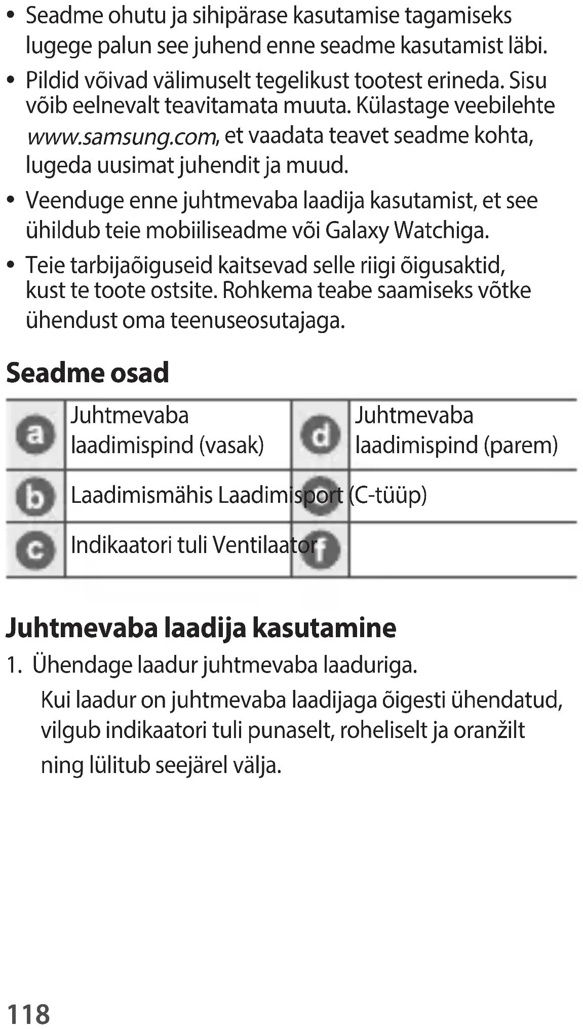 Teie tarbijaõiguseid kaitsevad selle riigi õigusaktid, kust te toote ostsite. Rohkema teabe saamiseks võtke ühendust oma teenuseosutajaga. Seadme osad Juhtmevaba laadimispind (vasak) Juhtmevaba laadimispind (parem) Laadimismähis Laadimisport (C-tüüp) Indikaatori tuli Ventilaator Juhtmevaba laadija kasutamine