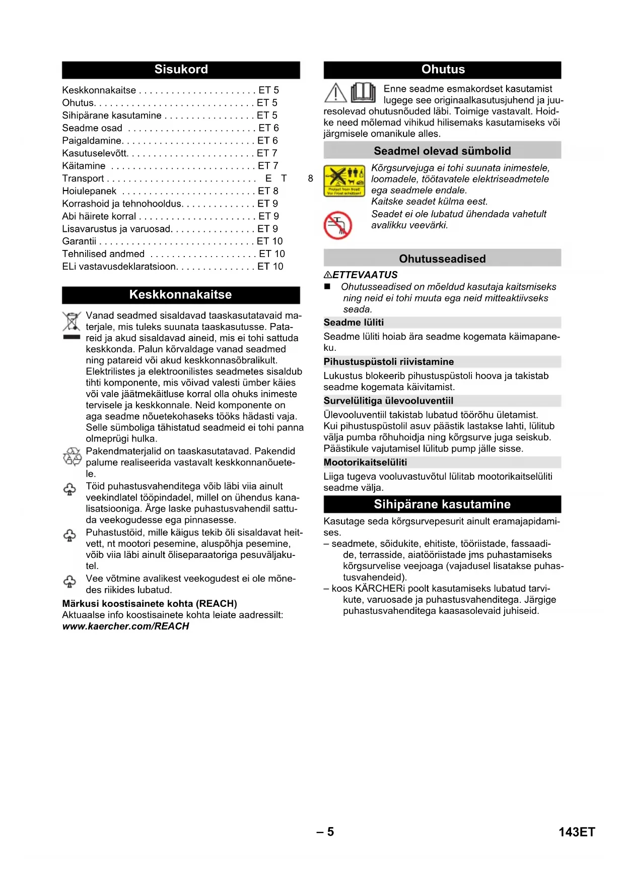 90 dB(A) Запазваме си правото на технически промени. EC Декларация за съответствие Продукт: Парочистачка/пароструйка за работа под налягане Тип: 1.324-xxx Намиращи приложение Директиви на ЕC: 2006/42/EO (+2009/127/EO) 2014/30/ЕC 2011/65/ЕC 2000/14/ЕО Намерили приложение хармонизирани стандарти: EN 50581 EN 55014–1: 2006+A1: 2009+A2: 2011 EN 55014–2: 2015 EN 60335–1 EN 60335–2–79 EN 61000–3–2: 2014 EN 61000–3–3: 2013 EN 62233: 2008 Приложен метод за оценка на съответствието: 2000/14/ЕО: Приложение V ниво на шум dB(A) Измерено: 88 Гарантирано: 90 Winnenden, 2018/10/01 Chairman of the Board of Management Director Regulatory Affairs & Certification 142 BG– 5 Märkusi koostisainete kohta (REACH) Aktuaalse info koostisainete kohta leiate aadressilt: www.kaercher.com/REACH Enne seadme esmakordset kasutamist lugege see originaalkasutusjuhend ja juu- resolevad ohutusnõuded läbi. Toimige vastavalt. Hoid- ke need mõlemad vihikud hilisemaks kasutamiseks või järgmisele omanikule alles. 몇 ETTEVAATUS Ohutusseadised on mõeldud kasutaja kaitsmiseks ning neid ei tohi muuta ega neid mitteaktiivseks seada. Seadme lüliti hoiab ära seadme kogemata käimapane- ku. Lukustus blokeerib pihustuspüstoli hoova ja takistab seadme kogemata käivitamist. Ülevooluventiil takistab lubatud töörõhu ületamist. Kui pihustuspüstolil asuv päästik lastakse lahti, lülitub välja pumba rõhuhoidja ning kõrgsurve juga seiskub. Päästikule vajutamisel lülitub pump jälle sisse. Liiga tugeva vooluvastuvõtul lülitab mootorikaitselüliti seadme välja. Kasutage seda kõrgsurvepesurit ainult eramajapidami- ses. – seadmete, sõidukite, ehitiste, tööriistade, fassaadi- de, terrasside, aiatööriistade jms puhastamiseks kõrgsurvelise veejoaga (vajadusel lisatakse puhas- tusvahendeid). – koos KÄRCHERi poolt kasutamiseks lubatud tarvi- kute, varuosade ja puhastusvahenditega. Järgige puhastusvahenditega kaasasolevaid juhiseid. Sisukord Keskkonnakaitse . . . . . . . . . . . . . . . . . . . . . . ET 5 Ohutus. . . . . . . . . . . . . . . . . . . . . . . . . . . . . . ET 5 Sihipärane kasutamine . . . . . . . . . . . . . . . . . ET 5 Seadme osad . . . . . . . . . . . . . . . . . . . . . . . . ET 6 Paigaldamine. . . . . . . . . . . . . . . . . . . . . . . . . ET 6 Kasutuselevõtt. . . . . . . . . . . . . . . . . . . . . . . . ET 7 Käitamine . . . . . . . . . . . . . . . . . . . . . . . . . . . ET 7 Transport . . . . . . . . . . . . . . . . . . . . . . . . . . . .ET 8 Hoiulepanek . . . . . . . . . . . . . . . . . . . . . . . . . ET 8 Korrashoid ja tehnohooldus. . . . . . . . . . . . . . ET 9 Abi häirete korral . . . . . . . . . . . . . . . . . . . . . . ET 9 Lisavarustus ja varuosad. . . . . . . . . . . . . . . . ET 9 Garantii . . . . . . . . . . . . . . . . . . . . . . . . . . . . . ET 10 Tehnilised andmed . . . . . . . . . . . . . . . . . . . . ET 10 ELi vastavusdeklaratsioon. . . . . . . . . . . . . . . ET 10 Keskkonnakaitse Vanad seadmed sisaldavad taaskasutatavaid ma- terjale, mis tuleks suunata taaskasutusse. Pata- reid ja akud sisaldavad aineid, mis ei tohi sattuda keskkonda. Palun kõrvaldage vanad seadmed ning patareid või akud keskkonnasõbralikult. Elektrilistes ja elektroonilistes seadmetes sisaldub tihti komponente, mis võivad valesti ümber käies või vale jäätmekäitluse korral olla ohuks inimeste tervisele ja keskkonnale. Neid komponente on aga seadme nõuetekohaseks tööks hädasti vaja. Selle sümboliga tähistatud seadmeid ei tohi panna olmeprügi hulka. Pakendmaterjalid on taaskasutatavad. Pakendid palume realiseerida vastavalt keskkonnanõuete- le. Töid puhastusvahenditega võib läbi viia ainult veekindlatel tööpindadel, millel on ühendus kana- lisatsiooniga. Ärge laske puhastusvahendil sattu- da veekogudesse ega pinnasesse. Puhastustöid, mille käigus tekib õli sisaldavat heit- vett, nt mootori pesemine, aluspõhja pesemine, võib viia läbi ainult õliseparaatoriga pesuväljaku- tel. Vee võtmine avalikest veekogudest ei ole mõne- des riikides lubatud. Ohutus Seadmel olevad sümbolid Kõrgsurvejuga ei tohi suunata inimestele, loomadele, töötavatele elektriseadmetele ega seadmele endale. Kaitske seadet külma eest. Seadet ei ole lubatud ühendada vahetult avalikku veevärki. Ohutusseadised Seadme lüliti Pihustuspüstoli riivistamine Survelülitiga ülevooluventiil Mootorikaitselüliti Sihipärane kasutamine 143ET– 6 Selle seadme tarnekomplekt (sõltuvalt mudelist) on ku- jutatud pakendil. See kasutusjuhend kirjeldab kõiki või- malikke variante. Kui tarvikuid on puudu või transpordikahjustuste korral teatage palun kaupmehele. Jooniseid vt volditavalt leheküljelt 3 1 Ühendusdetail veevõtuliitmikule 2 Veevõtuliitmik, sisseehitatud sõelaga 3 Kõrgsurvevoolik 4 Vooliku juhik 5 Joatorude hoiukoht 6 Pihustuspüstoli hoiustamine / parkimisasend 7 Plug 'n' Clean puhastusvahendi ühendus 8 Kandekäepide 9 Transpordikäepide, väljatõmmatav 10 Voolikuhoidja 11 Kõrgsurveühendus 12 Seadme lüliti „0/VÄLJAS“ / „I/SEES“ 13 Toitepistikuga toitekaabel 14 Tüübisilt 15 Tarvikute sahtel 16 Konksud võrgukinnituse jaoks 17 Võrk tarvikute sahtlile 18 Transpordiratas 19 Seisujalg kandesangaga 20 Full Control pihustuspüstol 21 Akupesa 22 LED rõhunäidik MIX / 1 - SOFT / 2 - MEDIUM / 3 - HARD 23 Akusahtli riivistus 24 Pihustuspüstoli riivistamine 25 Klahv kõrgsurvevooliku lahutamiseks pihustuspüs- tolist 26 Full Control joatoru Vario Power Kõige tavalisemateks puhastustöödeks Rõhuastmed: KÕVA / KESKMINE / PEHME / SEGU 27 Full Control mustusefreesiga joatoru tugeva mustuse jaoks Rõhuaste: KÕVA Jooniseid vt volditavalt leheküljelt 4 Paigaldage enne kasutuselevõttu seadmega kaasas ol