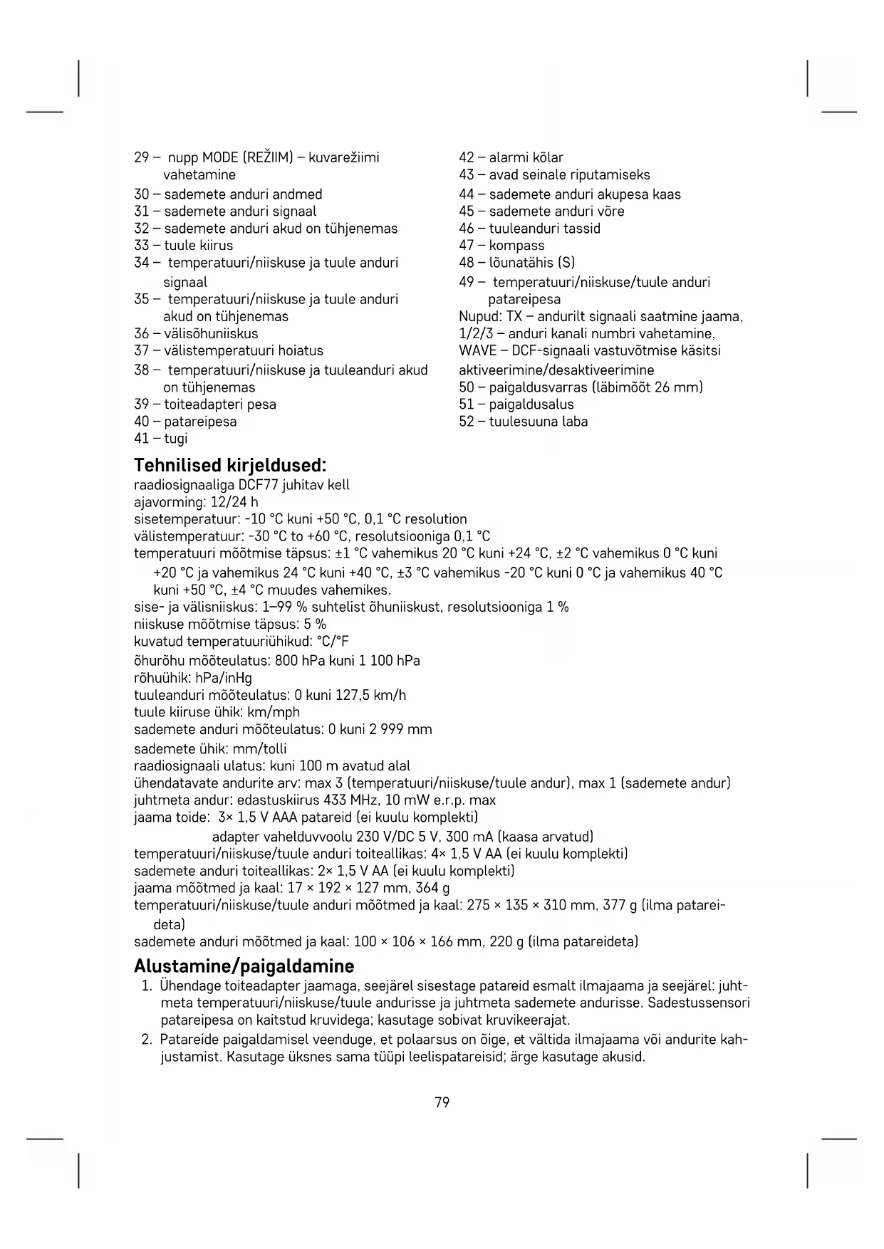 andur asetada maapinnast (vähemalt 1,5 m) kõrgusele horisontaalpinnale ja hoonetest ja konstruktsioonidest eemale. Mõlemad andurid peavad olema kindlalt kinni kruvitud, et vältida nende kahjustamist. Kõigepealt keerake kinnitusplaat tasasele pinnale, seejärel kinnitage sellele paigaldusvarras. Keerake temperatuuri/niiskuse/tuule andur vardale. Tuul peab saama tuulean- duri ümber kõigist külgedest vabalt puhuda. Veenduge, et tuule kiiruse mõõtmiseks kasutatavad tuulesuuna näidik ja labad saavad vabalt pöörelda. Põhjanool (N) sisseehitatud kompassil peab osutama põhja suunas. Lõunatähis (S) peab reaalsuses lõunasuunda osutama. Vastasel juhul kuvatakse tuule suund alati valesti. Anduri paigaldamiseks sobiva koha valimisel kontrollige enne paigaldamist, et põhijaam asuks andurite ulatuses. Andurite vahemik võib mitmete takistustega piirkondades märkimisväärselt väheneda.