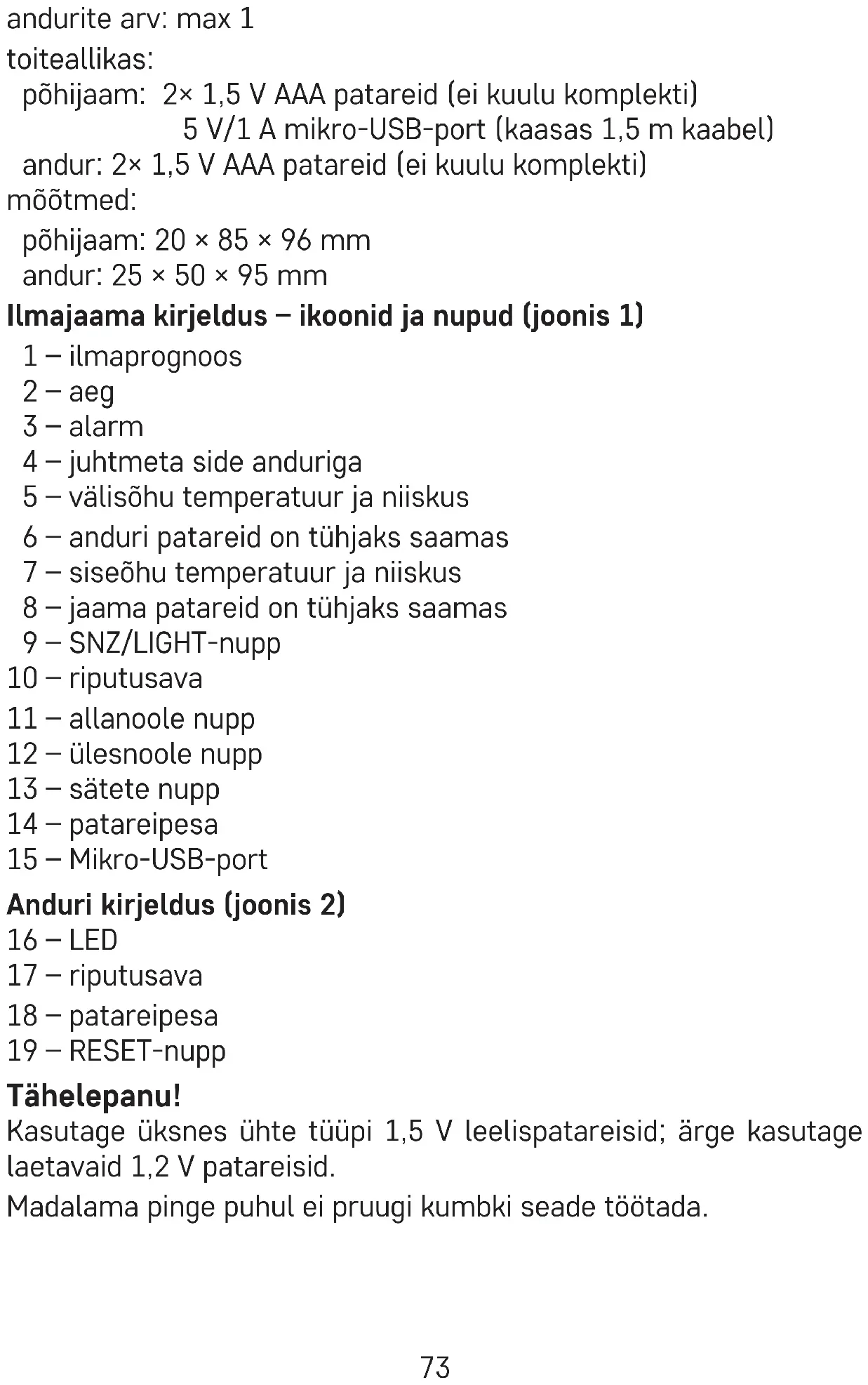 Patareide sisestamisel veenduge, et polaarsus oleks õige, et vältida ilmajaama ja anduri kahjustumist.