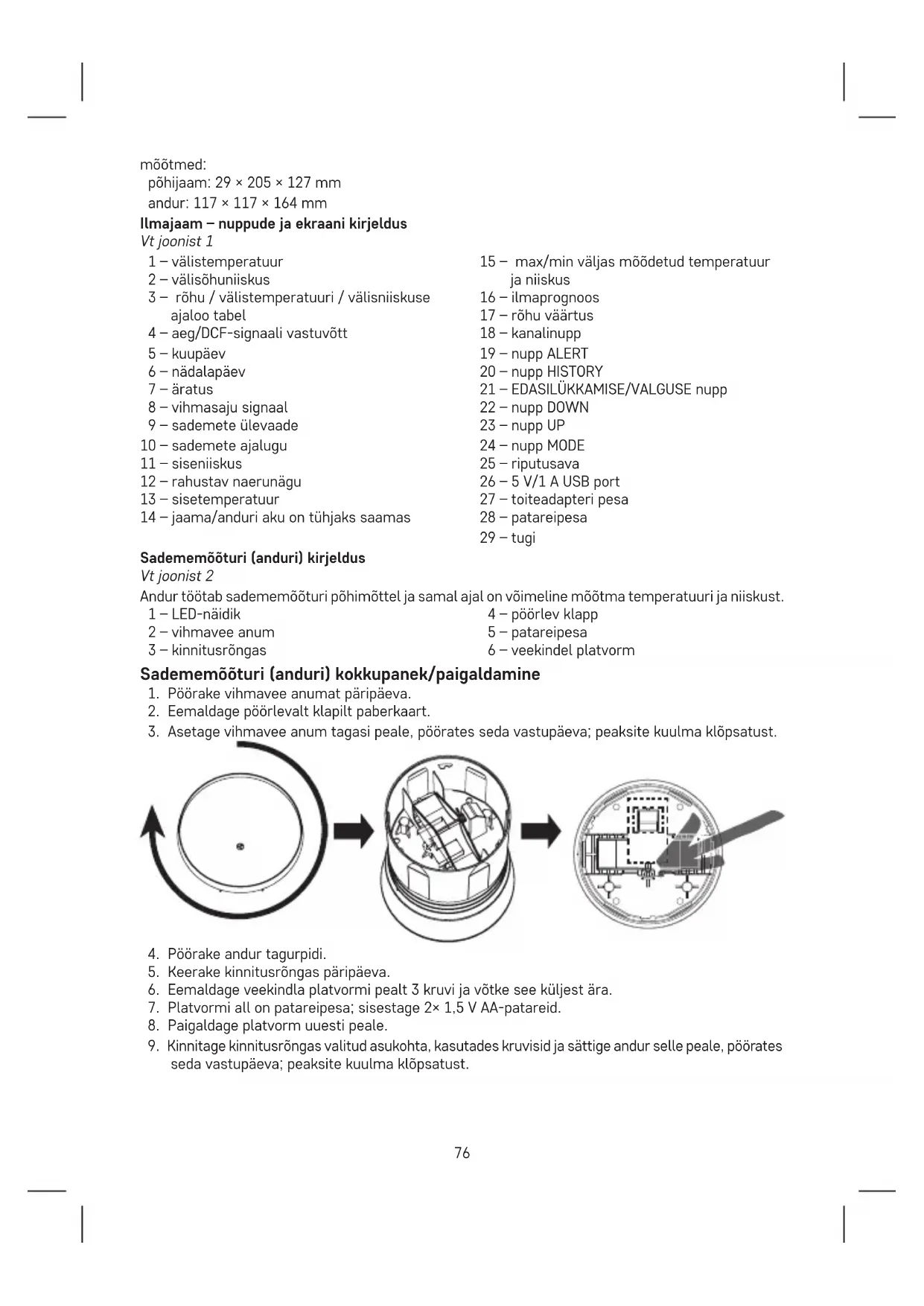 2. Patareide sisestamisel veenduge, et polaarsus on õige, et ilmajaama ega andurit mitte kahjustada.