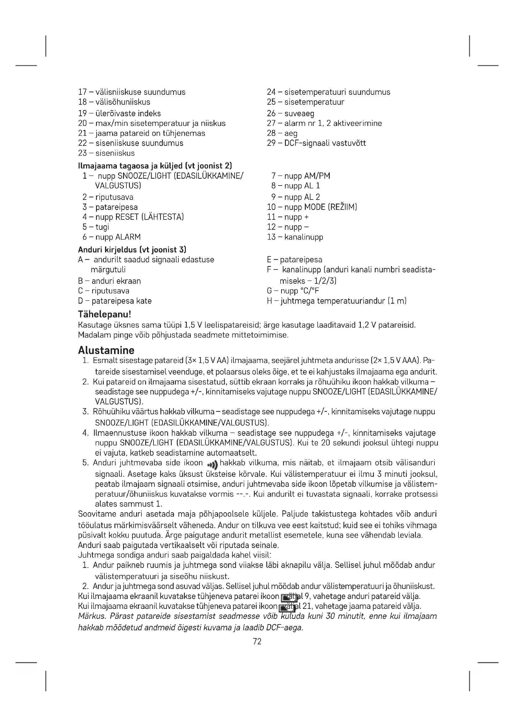 kuvatakse anduri ekraani niiskusnäidu kõrval. Anduri andmed laaditakse jaama 3 minuti jooksul. Kui anduri signaali ei tuvastata, korrake kogu toimingut. Valige soovitud anduri kanali number (1, 2, or 3), milleks vajutage korduvalt kanalinuppu. Number kuvatakse jaama ekraanil väljal 13. Jaama seadistamine mitme anduri andmete kuvamiseks Vajutage korduvalt ilmajaama kanalinuppu ja kuvage iga ühendatud anduri andmed üks haaval. Raadiojuhtimisega kell (DCF77) Pärast juhtmevaba anduri registreerimist otsib ilmajaam automaatselt DCF77 signaali (edaspidi „DCF“) 7 minutit; olenevalt DCF-signaali tugevusest hakkab ikoon vilkuma. Otsingu ajal ekraanil muid andmeid ei uuendata ja nupud on blokeeritud (v.a nupp SNOOZE•LIGHT (EDASILÜKKAMINE/VALGUSTUS). Kui hoiate nuppu AM/PM kolm sekundit all, DCF-signaali otsimine katkestatakse. Signaal tuvastatud – ikoon lõpetab vilkumise ja kuvab ikooniga praeguse kellaaja ja kuupäeva. Signaali ei tuvastatud – DCF-i ikooni ei kuvata. DCF-signaali otsimise kordamiseks seitsme minuti jooksul hoidke nuppu AM/PM kolm sekundit all. DCF-signaali otsimise tühistamiseks hoidke nuppu AM/PM uuesti kolm sekundit all. DCF-signaali sünkroonitakse regulaarselt iga päev kella 01:00 ja 05:00 vahel. Suveajal kuvatakse ikooni ajaväärtuse all. Standardtingimustes (ohutul kaugusel häireallikatest, nagu telerid või arvutimonitorid), võtab signaali vastuvõtt aega mitu minutit. Kui ilmajaam signaali ei tuvasta, toimige järgmiselt.