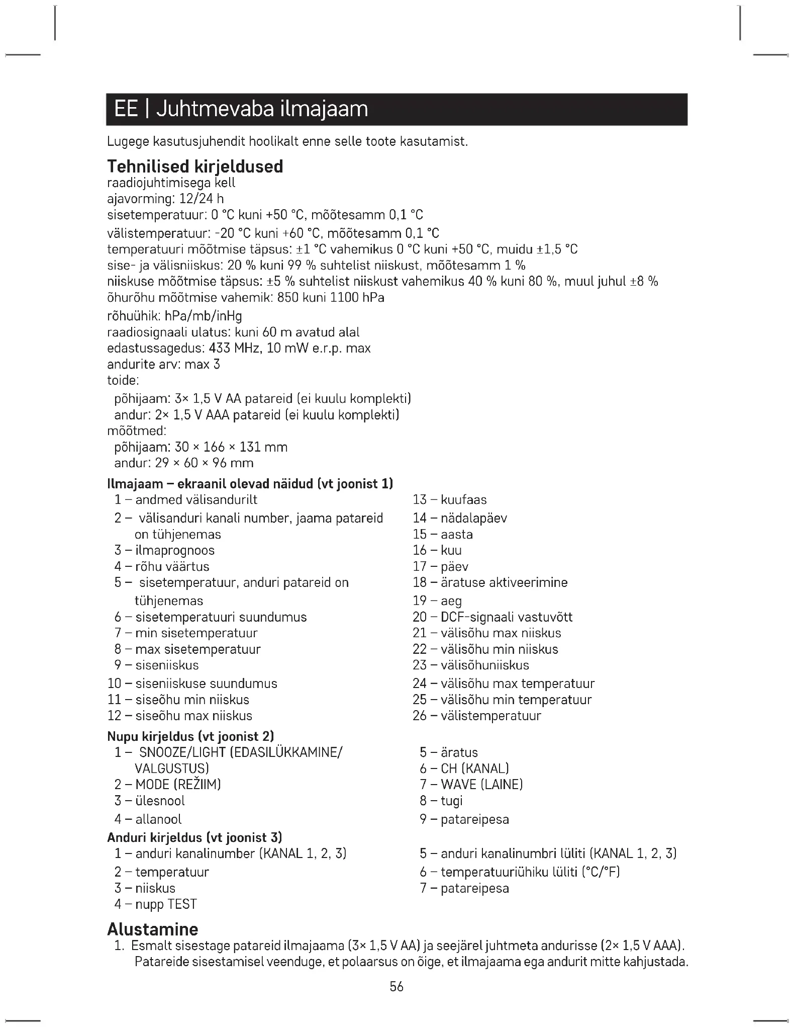 ta – kuupäevavorming – kuu – päev – kalendri keel – ajavöönd. Väärtuste vahel saate liikuda REŽIIMINUPPU vajutades; seadistage väärtused üles- ja allanoolega . Kalendri keeled on järgmised: (ENG – inglise, FR – prantsuse, IT – itaalia, ES – hispaania, NE – hollandi, DA – taani, GE – saksa) 12/24 h ajavormingu, °C/°F temperatuuriühiku seadistamine REŽIIMINUPU korduv vajutamine vahetab 12/24-tunnist ajavormingut. Nupu korduv vajutamine lülitab °C/°F temperatuuriühikut. Atmosfäärirõhk – ajalugu Rõhuväärtus kuvatakse väljal 4. Allpool on toodud õhurõhu ajaloo graak viimase kuni 12 tunni jooksul. Nupu korduv pikalt vajutamine lülitab inHg ja hPa/mb rõhuühikuid. Ilmajaama teisaldamine mõjutab mõõtmistulemusi. Mõõtmine stabiliseerub 12 tunni jooksul pärast aku sisestamist või ilmajaama ümberpaigutamist. Temperatuuri ja niiskuse suundumus temperatuuri ja niiskuse suundumuse näitaja tõusev püsiv langev Kuufaasid (vt joonist 4) Kuufaase kuvatakse väljal nr 13. 1 – Täiskuu 2 – Kahanev kuu 3 – Poolkuu 4 – Vanakuu 5 – Kuuloomine 6 – Noorkuu 7 – Esimene veerand 8 – Kasvav kuu Maksimaalse ja minimaalse temperatuuri- ning niiskusenäitude kuvamine Mõõdetud välistemperatuuri väärtused kuvatakse väljadel 24 ja 25, sisetemperatuur kuvatakse väljadel 7 ja 8. Mõõdetud välisõhuniiskuse väärtused kuvatakse väljadel 21 ja 22, siseõhuniiskus kuvatakse väljadel 11 ja 12. Mõõdetud väärtuste mälu kustutatakse automaatselt iga päev kell 00.00. Mõõdetud väärtuste mälu käsitsi kustutamiseks hoidke all nuppu . Äratuse seadistamine Hoidke all nuppu ; ajaseadistus hakkab vilkuma. Kasutage äratuse kellaaja määramiseks nuppu ja . Vajutage kinnitamiseks ja menüüs liikumiseks nuppu . Vajutage äratuse aktiveerimiseks põgusalt nuppu ; ilmub ekraanile. Vajutage äratuse väljalülitamiseks uuesti nuppu ; ikoon kaob. Edasilükkamisfunktsioon Äratuse helinat saab viie minuti võrra edasi lükata, kasutades nuppu EDASILÜKKAMINE/VALGUSTUS, mis asub ilmajaama ülemises osas. Vajutage nuppu, kui äratus hakkab helisema. Ikoon hakkab vilkuma. Funktsiooni EDASILÜKKAMINE tühistamiseks vajutage mõnda muud nuppu – ikoon lõpetab vilkumise
