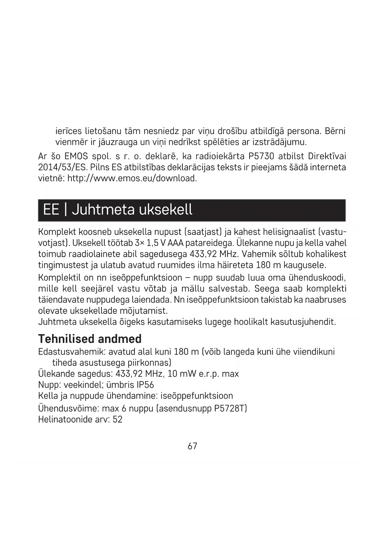 - Šī ierīce nav paredzēta izmantošanai personām (tostarp bērniem), kuru ziskā, uztveres vai garīgā nespēja vai pieredzes un zināšanu trūkums neļauj to droši lietot, ja vien šīs personas neuzrauga vai norādījumus par67 ierīces lietošanu tām nesniedz par viņu drošību atbildīgā persona. Bērni vienmēr ir jāuzrauga un viņi nedrīkst spēlēties ar izstrādājumu. Ar šo EMOS spol. s r. o. deklarē, ka radioiekārta P5730 atbilst Direktīvai 2014/53/ES. Pilns ES atbilstības deklarācijas teksts ir pieejams šādā interneta vietnē: http://www.emos.eu/download. EE | Juhtmeta uksekell Komplekt koosneb uksekella nupust (saatjast) ja kahest helisignaalist (vastu- votjast). Uksekell töötab 3× 1,5 V AAA patareidega. Ülekanne nupu ja kella vahel toimub raadiolainete abil sagedusega 433,92 MHz. Vahemik sõltub kohalikest tingimustest ja ulatub avatud ruumides ilma häireteta 180 m kaugusele. Komplektil on nn iseõppefunktsioon – nupp suudab luua oma ühenduskoodi, mille kell seejärel vastu võtab ja mällu salvestab. Seega saab komplekti täiendavate nuppudega laiendada. Nn iseõppefunktsioon takistab ka naabruses olevate uksekellade mõjutamist. Juhtmeta uksekella õigeks kasutamiseks lugege hoolikalt kasutusjuhendit. Tehnilised andmed Edastusvahemik: avatud alal kuni 180 m (võib langeda kuni ühe viiendikuni tiheda asustusega piirkonnas) Ülekande sagedus: 433,92 MHz, 10 mW e.r.p. max Nupp: veekindel; ümbris IP56 Kella ja nuppude ühendamine: iseõppefunktsioon Ühendusvõime: max 6 nuppu (asendusnupp P5728T) Helinatoonide arv: 5268 Kella toide: 3× 1,5 V patareid (AAA tüüpi) Nupu toide: 1× 12 V patarei (A23 tüüpi) Komplektis: kahepoolne kleeplint Kella kirjeldus (vt joonist 1) 1 – kella LED 2 – patareipesa 3 – riputusavad 4 – kõlar 5 – helinatooni muutmise nupp 6 – ühendamise/helitugevuse seadistamise nupp Nuppude kirjeldus (vt joonist 2) 1 – helinanupp 2 – nupu LED 3 – ava akukaane avamiseks 4 – patareipesa Nupu paigaldamine (vt joonist 3) Nupu ühendamine kellaga