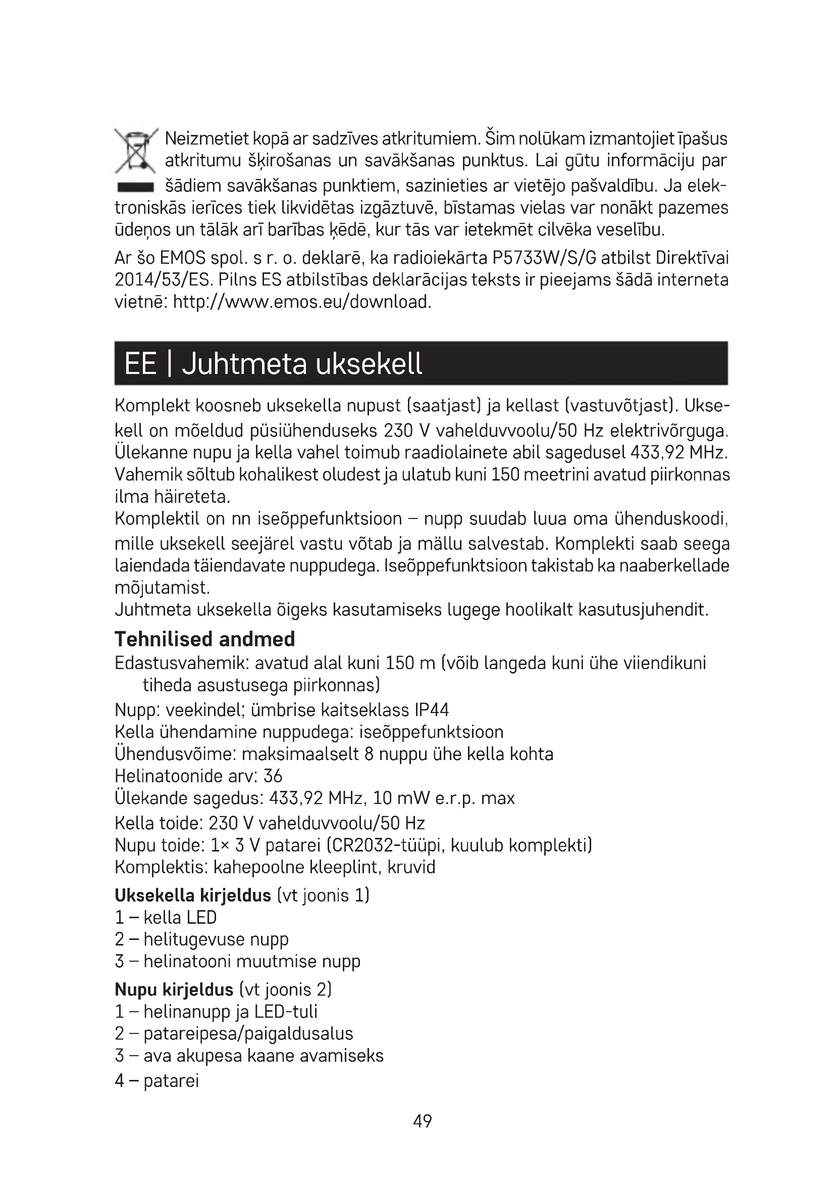 - Seadme puhastamiseks kasutage kergelt niisutatud lappi väikese koguse pesuvahendiga; ärge kasutage lahusteid ega puhastusvahendeid. See seade ei ole mõeldud kasutamiseks inimestele (sh lastele), kelle füüsiline, sensoorne või vaimne puue või kogemuste või teadmiste puudumine takistab neil seda ohutult kasutada. Neid tuleb juhendada seadme kasutamise kohta ning kasutamine peab toimuma nende ohutuse eest vastutava isiku järelevalve all. Lapsi tuleb alati jälgida, et nad ei saaks seadmega mängida. Ärge visake ära koos olmejäätmetega. Kasutage spetsiaalseid sortee- ritud jäätmete kogumispunkte. Teavet kogumispunktide kohta saate kohalikult omavalitsuselt. Elektroonikaseadmete prügimäele viskamisel võivad ohtlikud ained pääseda põhjavette ja seejärel toiduahelasse ning mõju- tada nii inimeste tervist. Käesolevaga deklareerib EMOS spol. s r. o. et käesolev raadioseadme tüüp P5733W/S/G vastab direktiivi 2014/53/EL nõuetele. ELi vastavus- deklaratsiooni täielik tekst on kättesaadav järgmisel internetiaadressil: http://www.emos.eu/download. BG | Безжичен звънец Комплектът се състои от бутон (предавател) и звънец (приемник). Звънецът трябва да е постоянно свързан към електрическа променливотокова мрежа 230 V AC/50 Hz. Предаването на сигнала между бутона и звънеца се извършва53 чрез радиовълни на честота 433,92 MHz. Обхватът на действие зависи от местните условия и достига 150 m на открито, когато няма източници на