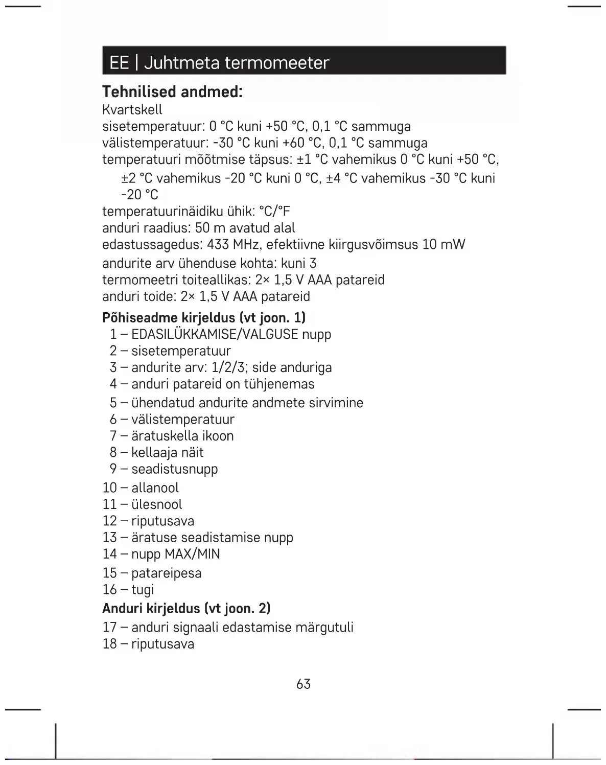 12-/24-tunnise ajavormingu seadistamine Nupu korduv vajutamine vahetab 12/24-tunnist ajavormingut. Temperatuuriühikute °C/°F vahetamine Allanoole korduval vajutamisel vahetub °C või °F ühik. Äratuse seadistamine Äratuse kellaaja seadistamiseks hoidke all nuppu ja vajutage nuppu / . Näitude vahetamiseks vajutage nuppu . Kui tunnid ja minutid on seadistatud, siis vajutage uuesti nuppu . Ekraanil olev äratuse ikoon näitab, et äratus on aktiivne. Äratuse väljalülitamiseks vajutage uuesti nuppu . Ikoon kaob. Kellaaja tavakuvale naasmiseks oodake 20 sekundit või vajutage nuppu . Edasilükkamise ja taustavalgustuse funktsioonid Äratuse ajal selle edasilükkamiseks 5 minutit vajutage EDASILÜK- KAMISE/VALGUSTUSE nuppu. ikoon vilgub ekraanil. Edasilük-66 kamisfunktsiooni tühistamiseks vajutage mis tahes nuppu peale EDASILÜKKAMISE/VALGUSTUSE nupu. Kui te ei soovi edasilükka- misfunktsiooni kasutada, vajutage äratuse ajal mis tahes nuppu peale EDASILÜKKAMISE/VALGUSTUSE nupu; äratus aktiveerub järgmisel päeval uuesti. Äratus on aktiivne kaks minutit, kui helisemise ajal ühtegi nuppu ei vajutata; järgmisel päeval aktiveerub see uuesti. Standardrežiimi kasutamisel vajutage EDASILÜKKAMISE/VALGUSTU- SE nuppu, et aktiveerida 5-sekundiline taustavalgustus. Mõõdetud väärtuste mälu Sise- ja välistemperatuuri maksimaalse ja minimaalse näidu kuva- miseks vajutage korduvalt nuppu . Mälu kustutamiseks hoidke all nuppu . Ohutusjuhised ja hoiatused Enne seadme kasutamist tutvuge kasutusjuhendiga. Järgige juhendis toodud ohutusjuhiseid. Toode on mõeldud nõuetekohasel kasutamisel töökindlalt toimima paljude aastate jooksul.