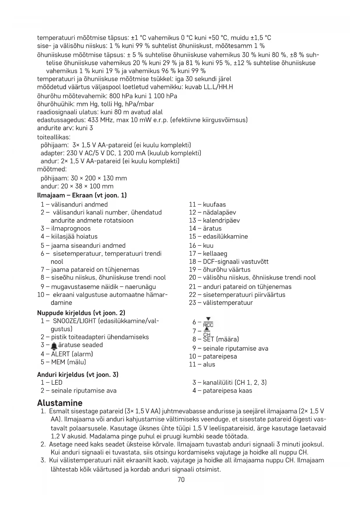 - Šī ierīce nav paredzēta lietošanai personām (tostarp bērniem), kuras ierobežotu zisko, maņu vai garīgo spēju vai arī pieredzes vai zināšanu trūkuma dēļ nevar to droši izmantot. Šādām personām ir jāiemāca, kā pareizi lietot šo ierīci, un tās ir jāuzrauga personai, kura ir atbildīga par to drošību. Neizmetiet kopā ar sadzīves atkritumiem. Šim nolūkam izmantojiet īpašus atkritumu šķiroša- nas un savākšanas punktus. Lai gūtu informāciju par šādiem savākšanas punktiem, sazinieties ar vietējo pašvaldību. Ja elektroniskās ierīces tiek likvidētas izgāztuvē, bīstamas vielas var nonākt pazemes ūdeņos un tālāk arī barības ķēdē, kur tās var ietekmēt cilvēka veselību. Ar šo EMOS spol. s r. o. deklarē, ka radioiekārta E0387 atbilst Direktīvai 2014/53/ES. Pilns ES atbilstības deklarācijas teksts ir pieejams šādā interneta vietnē: http://www.emos.eu/download. EE | Juhtmevaba ilmajaam Enne selle toote kasutamist lugege hoolikalt kasutusjuhendit. Tehnilised andmed raadiojuhtimisega kell ajavorming: 12/24 h sisetemperatuur: -10 °C kuni +50 °C, mõõtesamm 0,1 °C välistemperatuur: -40 °C kuni +60 °C, mõõtesamm 0,1 °C70 temperatuuri mõõtmise täpsus: ±1 °C vahemikus 0 °C kuni +50 °C, muidu ±1,5 °C sise- ja välisõhu niiskus: 1 % kuni 99 % suhtelist õhuniiskust, mõõtesamm 1 % õhuniiskuse mõõtmise täpsus: ± 5 % suhtelise õhuniiskuse vahemikus 30 % kuni 80 %, ±8 % suh- telise õhuniiskuse vahemikus 20 % kuni 29 % ja 81 % kuni 95 %, ±12 % suhtelise õhuniiskuse vahemikus 1 % kuni 19 % ja vahemikus 96 % kuni 99 % temperatuuri ja õhuniiskuse mõõtmise tsükkel: iga 30 sekundi järel mõõdetud väärtus väljaspool loetletud vahemikku: kuvab LL.L/HH.H õhurõhu mõõtevahemik: 800 hPa kuni 1 100 hPa õhurõhuühik: mm Hg, tolli Hg, hPa/mbar raadiosignaali ulatus: kuni 80 m avatud alal edastussagedus: 433 MHz, max 10 mW e.r.p. (efektiivne kiirgusvõimsus) andurite arv: kuni 3 toiteallikas: põhijaam: 3× 1,5 V AA-patareid (ei kuulu komplekti) adapter: 230 V AC/5 V DC, 1 200 mA (kuulub komplekti) andur: 2× 1,5 V AA-patareid (ei kuulu komplekti) mõõtmed: põhijaam: 30 × 200 × 130 mm andur: 20 × 38 × 100 mm Ilmajaam – Ekraan (vt joon. 1) 1 – välisanduri andmed 2 – välisanduri kanali number, ühendatud andurite andmete rotatsioon 3 – ilmaprognoos 4 – kiilasjää hoiatus 5 – jaama siseanduri andmed 6 – sisetemperatuur, temperatuuri trendi nool 7 – jaama patareid on tühjenemas 8 – siseõhu niiskus, õhuniiskuse trendi nool 9 – mugavustaseme näidik – naerunägu 10 – ekraani valgustuse automaatne hämar- damine 11 – kuufaas 12 – nädalapäev 13 – kalendripäev 14 – äratus 15 – edasilükkamine 16 – kuu 17 – kellaaeg 18 – DCF-signaali vastuvõtt 19 – õhurõhu väärtus 20 – välisõhu niiskus, õhniiskuse trendi nool 21 – anduri patareid on tühjenemas 22 – sisetemperatuuri piirväärtus 23 – välistemperatuur Nuppude kirjeldus (vt joon. 2) 1 – SNOOZE/LIGHT (edasilükkamine/val- gustus) 2 – pistik toiteadapteri ühendamiseks 3 – äratuse seaded 4 – ALERT (alarm) 5 – MEM (mälu) 6 – 7 – 8 – SET (määra) 9 – seinale riputamise ava 10 – patareipesa 11 – alus Anduri kirjeldus (vt joon. 3) 1 – LED 2 – seinale riputamise ava 3 – kanalilüliti (CH 1, 2, 3) 4 – patareipesa kaas Alustamine