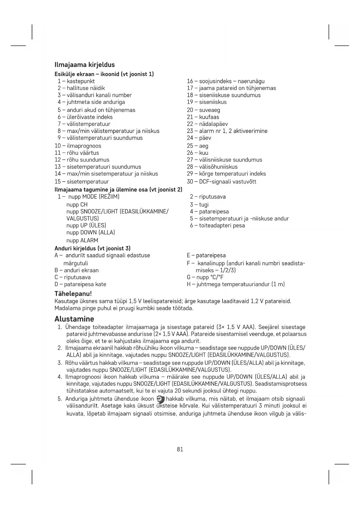 patareid juhtmevabasse andurisse (2× 1,5 V AAA). Patareide sisestamisel veenduge, et polaarsus oleks õige, et te ei kahjustaks ilmajaama ega andurit.