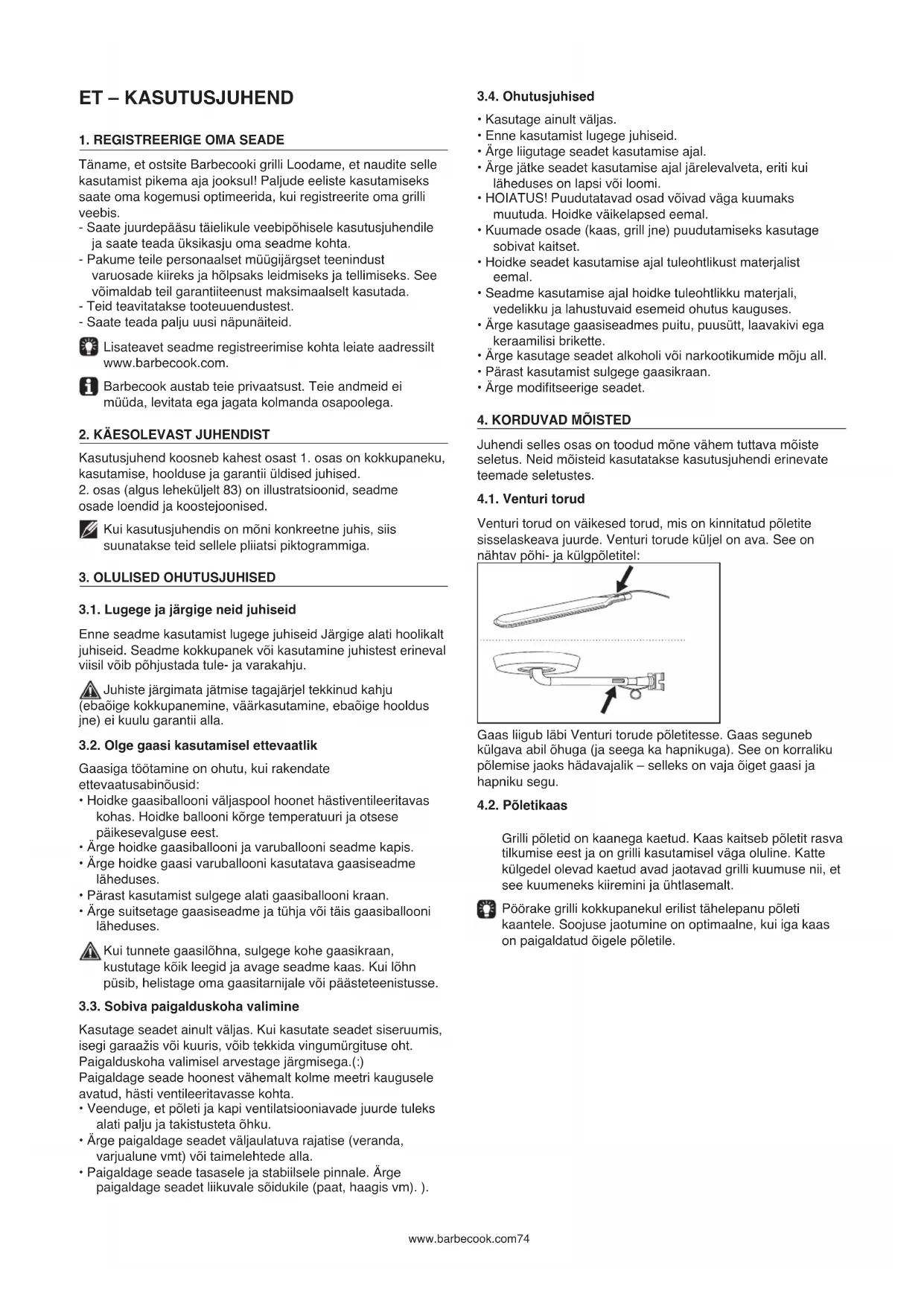 Täname, et ostsite Barbecooki grilli Loodame, et naudite selle kasutamist pikema aja jooksul! Paljude eeliste kasutamiseks saate oma kogemusi optimeerida, kui registreerite oma grilli veebis. - Saate juurdepääsu täielikule veebipõhisele kasutusjuhendile ja saate teada üksikasju oma seadme kohta. - Pakume teile personaalset müügijärgset teenindust varuosade kiireks ja hõlpsaks leidmiseks ja tellimiseks. See võimaldab teil garantiiteenust maksimaalselt kasutada. - Teid teavitatakse tooteuuendustest. - Saate teada palju uusi näpunäiteid. Lisateavet seadme registreerimise kohta leiate aadressilt www.barbecook.com. Barbecook austab teie privaatsust. Teie andmeid ei müüda, levitata ega jagata kolmanda osapoolega.