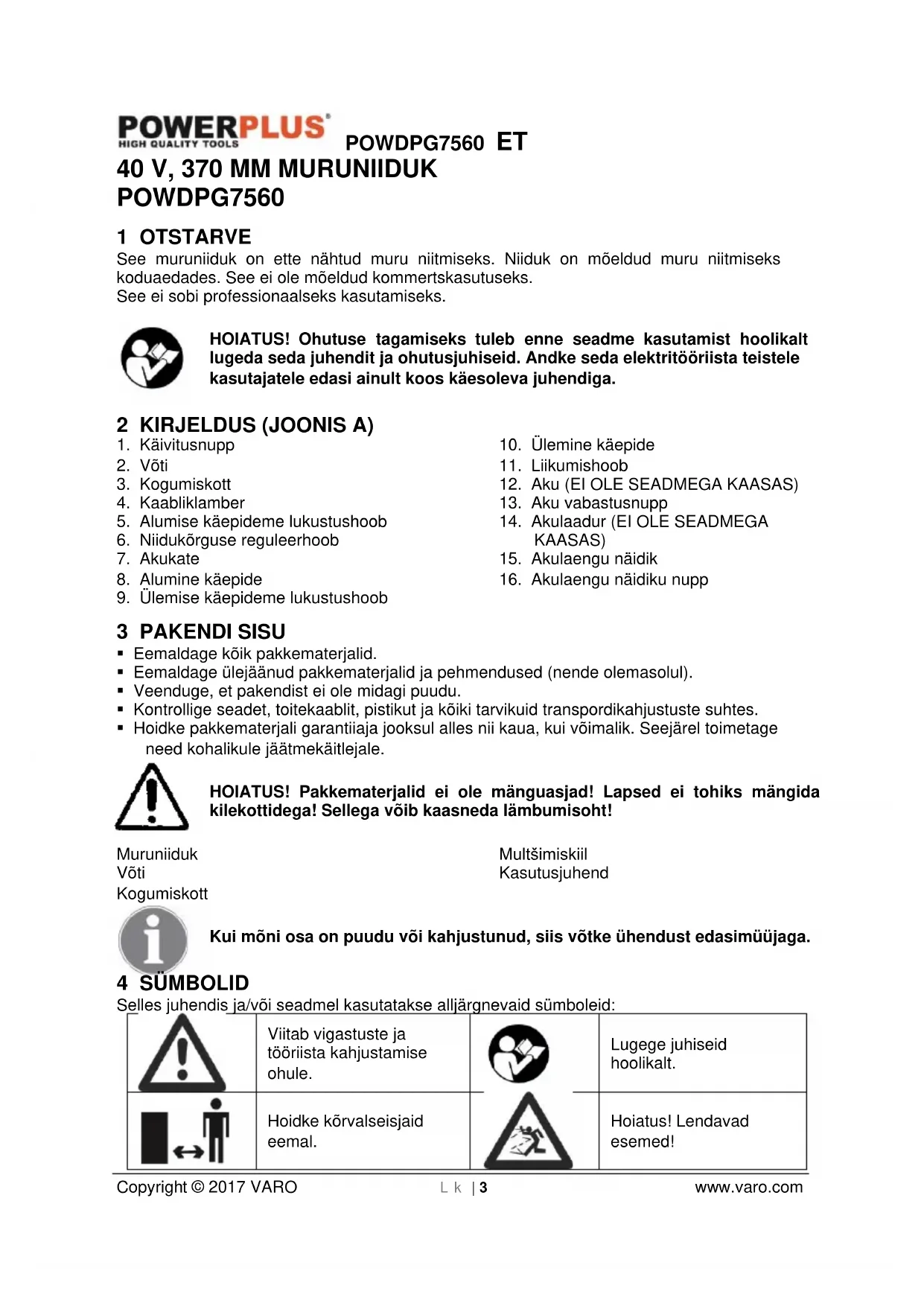 - Hoidke tööpiirkonda puhta ja hästi valgustatuna. Segamini ja hämarad kohad võivad põhjustada õnnestusi.POWDPG7560 ET Copyright © 2017 VARO Lk | 5 www.varo.com