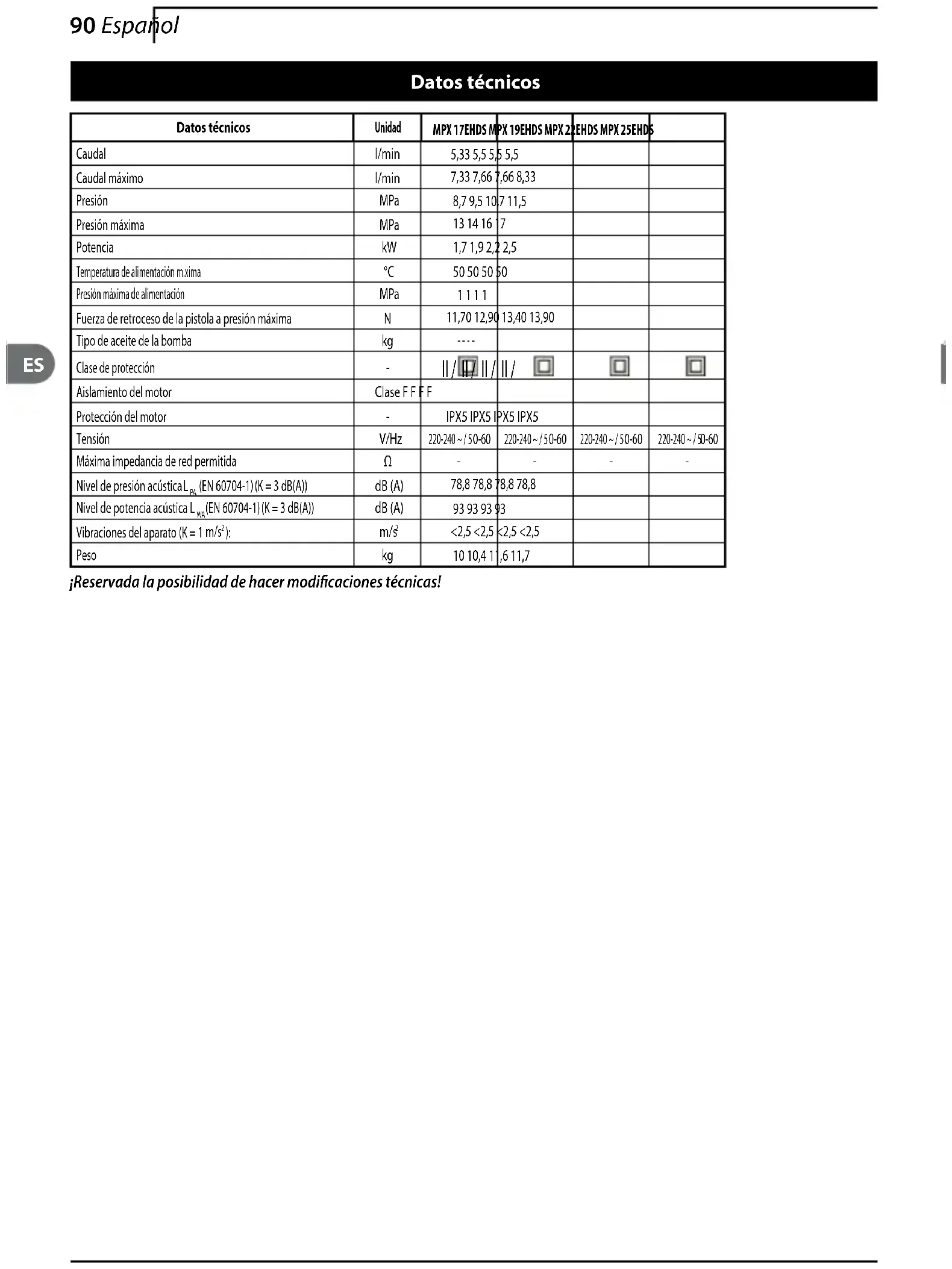 Maksimaalne sisendrõhk MPa 1 1 1 1Püstoli tõukejõud maksimumrõhu juures 11,70 12,90 13,40 13,90Pumbaõli tüüp - - - -Kaitse klass