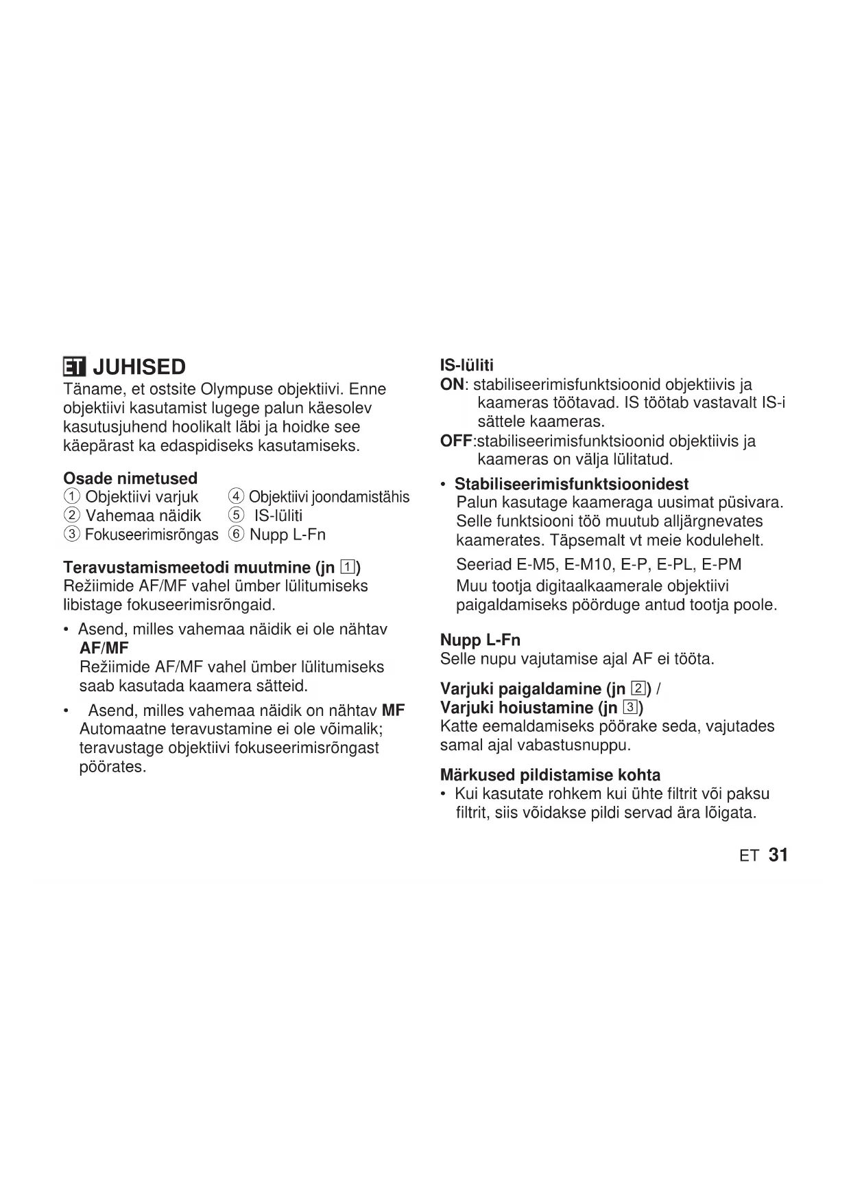- Stabiliseerimisfunktsioonidest Palun kasutage kaameraga uusimat püsivara. Selle funktsiooni töö muutub alljärgnevates kaamerates. Täpsemalt vt meie kodulehelt. Seeriad E-M5, E-M10, E-P, E-PL, E-PM Muu tootja digitaalkaamerale objektiivi paigaldamiseks pöörduge antud tootja poole. Nupp L-Fn Selle nupu vajutamise ajal AF ei tööta. Varjuki paigaldamine (jn 2) / Varjuki hoiustamine (jn 3) Katte eemaldamiseks pöörake seda, vajutades samal ajal vabastusnuppu. Märkused pildistamise kohta