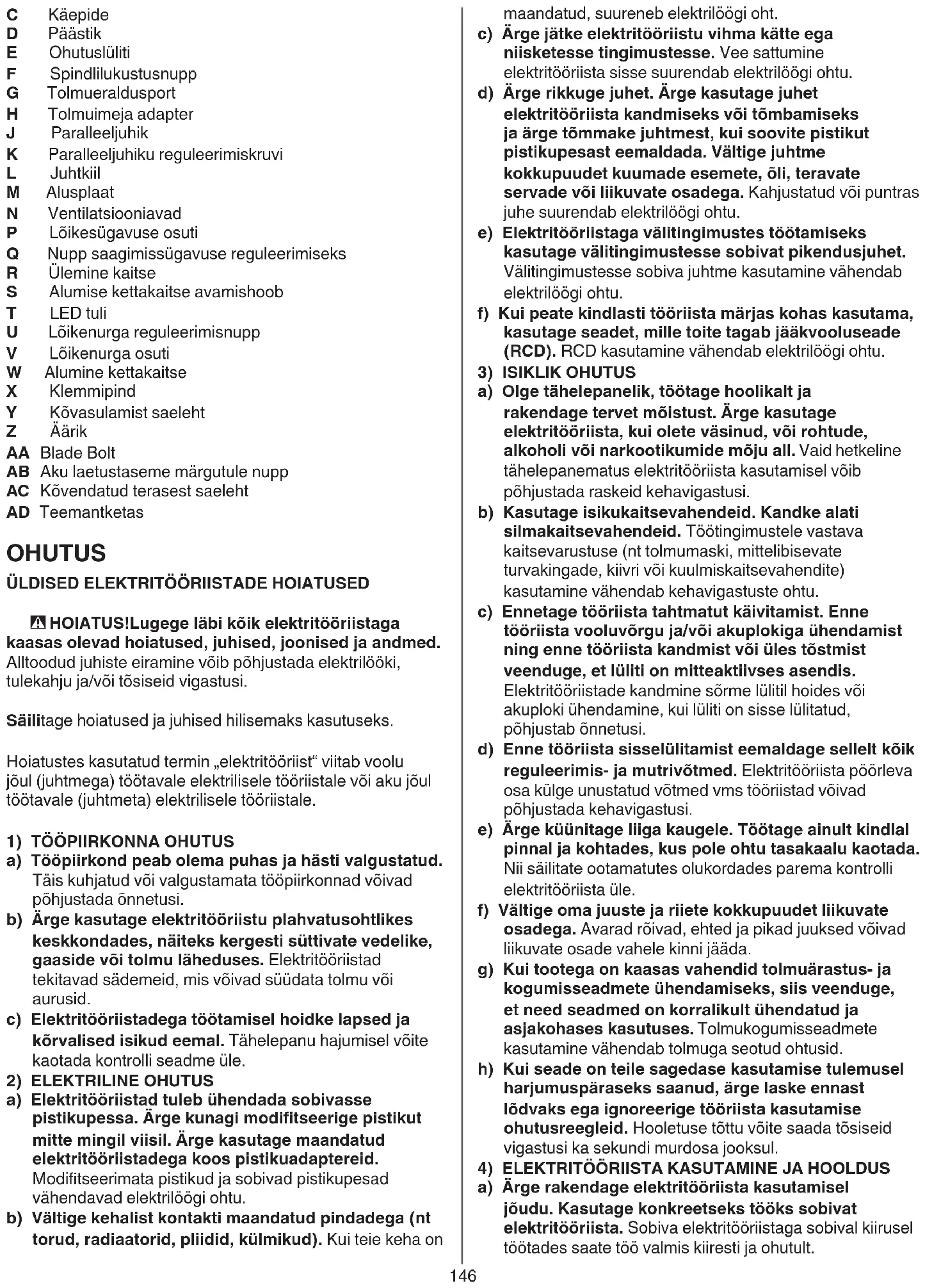 P Lõikesügavuse osuti Q Nupp saagimissügavuse reguleerimiseks R Ülemine kaitse S Alumise kettakaitse avamishoob T LED tuli U Lõikenurga reguleerimisnupp V Lõikenurga osuti W Alumine kettakaitse X Klemmipind Y Kõvasulamist saeleht Z Äärik AA Blade Bolt AB Aku laetustaseme märgutule nupp AC Kõvendatud terasest saeleht AD Teemantketas OHUTUS