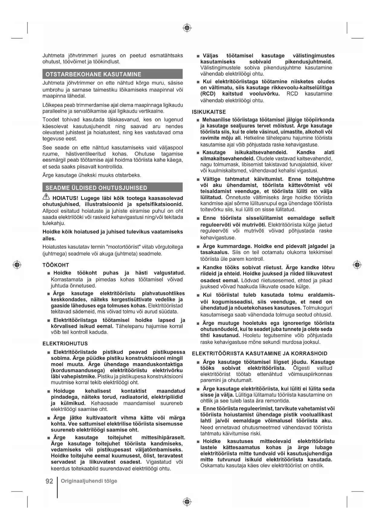 HOIATUS! Lugege läbi kõik tootega kaasasolevad ohutusjuhised, illustratsioonid ja spetsifikatsioonid. Allpool esitatud hoiatuste ja juhiste eiramise puhul on oht saada elektrilööki või raskeid kehavigastusi ning/või tekitada tulekahju. Hoidke kõik hoiatused ja juhised tulevikus vaatamiseks alles. Hoiatustes kasutatav termin "mootortööriist" viitab võrgutoitega (juhtmega) seadmele või akuga (juhtmeta) seadmele. TÖÖKOHT ■ Hoidke töökoht puhas ja hästi valgustatud. Korrastamata ja pimedas kohas töötamisel võivad juhtuda õnnetused. ■ Ärge kasutage elektritööriistu plahvatusohtlikes keskkondades, näiteks kergestisüttivate vedelike ja gaaside läheduses ega tolmuses kohas. Elektritööriistad tekitavad sädemeid, mis võivad tolmu või aurud süüdata. ■ Elektritööriistaga töötamisel hoidke lapsed ja kõrvalised isikud eemal. Tähelepanu hajumise korral võib teil kontroll kaduda. ELEKTRIOHUTUS ■ Elektritööriistade pistikud peavad pistikupessa sobima. Ärge püüdke pistiku konstruktsiooni mingil moel muuta. Ärge ühendage maanduskontaktiga (kordusmaandusega) elektritööriistu elektrivõrku läbi vahepistmike. Pistiku ja pistikupesa konstruktsiooni muutmise korral tekib elektrilöögi oht. ■ Hoiduge kehalisest kontaktist maandatud pindadega, näiteks torud, radiaatorid, elektripliidid ja külmikud. Kehaosade maandamisel suureneb elektrilöögi saamise oht. ■ Ärge jätke kultivaatorit vihma kätte või märga kohta. Vee sattumisel elektrilise tööriista sisemusse suureneb elektrilöögi saamise oht. ■ Ärge kasutage toitejuhet mittesihipäraselt. Ärge kasutage toitejuhet tööriista kandmiseks, vedamiseks või pistikupesast väljatõmbamiseks. Hoidke toitejuhe eemal kuumusest, õlist, teravatest servadest ja liikuvatest osadest. Vigastatud või keerdus toitekaablid suurendavad elektrilöögi ohtu. ■ Väljas töötamisel kasutage välistingimustes kasutamiseks sobivaid pikendusjuhtmeid. Välistingimustele sobiva pikendusjuhtme kasutamine vähendab elektrilöögi ohtu. ■ Kui elektritööriistaga töötamine niisketes oludes on vältimatu, siis kasutage rikkevoolu-kaitselülitiga (RCD) kaitstud vooluvõrku. RCD kasutamine vähendab elektrilöögi ohtu. ISIKUKAITSE ■ Mehaanilise tööriistaga töötamisel jälgige tööpiirkonda ja kasutage sealjuures tervet mõistust. Ärge kasutage tööriista siis, kui te olete väsinud, uimastite, alkoholi või ravimite mõju all. Hetkeline tähelepanu hajumine tööriista kasutamise ajal võib põhjustada raske kehavigastuse. ■ Kasutage isikukaitsevahendeid. Kandke alati silmakaitsevahendeid. Oludele vastavad kaitsevahendid, nagu tolmumask, libisemist takistavad turvajalatsid, kiiver või kuulmiskaitsmed, vähendavad kehalisi vigastusi. ■ Vältige tahtmatut käivitumist. Enne toitejuhtme või aku ühendamist, tööriista kättevõtmist või teisaldamist veenduge, et tööriista lüliti on välja lülitatud. Õnnetuste vältimiseks ärge hoidke tööriista kandmise ajal sõrme lülitusnupul ega ühendage tööriista toitevõrku siis, kui lüliti on sisse lülitatud. ■ Enne tööriista sisselülitamist eemaldage sellelt reguleervõti või mutrivõti. Elektritööriista külge jäetud reguleervõti või mutrivõti võivad põhjustada raske kehavigastuse. ■ Ärge kummardage. Hoidke end pidevalt jalgadel ja tasakaalus. Siis on teil ootamatu olukorra tekkimisel tööriista üle parem kontroll. ■ Kandke tööks sobivat riietust. Ärge kandke lõtvu riideid ja ehteid. Hoidke juuksed ja riided liikuvatest osadest eemal. Lõdvad riietusesemed, ehted ja pikad juuksed võivad haakuda liikuvate osade külge. ■ Kui tööriistal tuleb kasutada tolmu eraldamis- või kogumisseadisi, siis veenduge, et need on ühendatud ja nõuetekohases kasutuses. Tolmukoguri kasutamisega saab vähendada tolmuga seotud ohtusid. ■ Ärge muutuge hooletuks ega ignoreerige tööriista ohutusnõudeid, kui te seadet juba tunnete ja olete seda tihti kasutanud. Hooletu tegutsemine võib põhjustada raske kehavigastuse mõne sekundi murdosa jooksul.