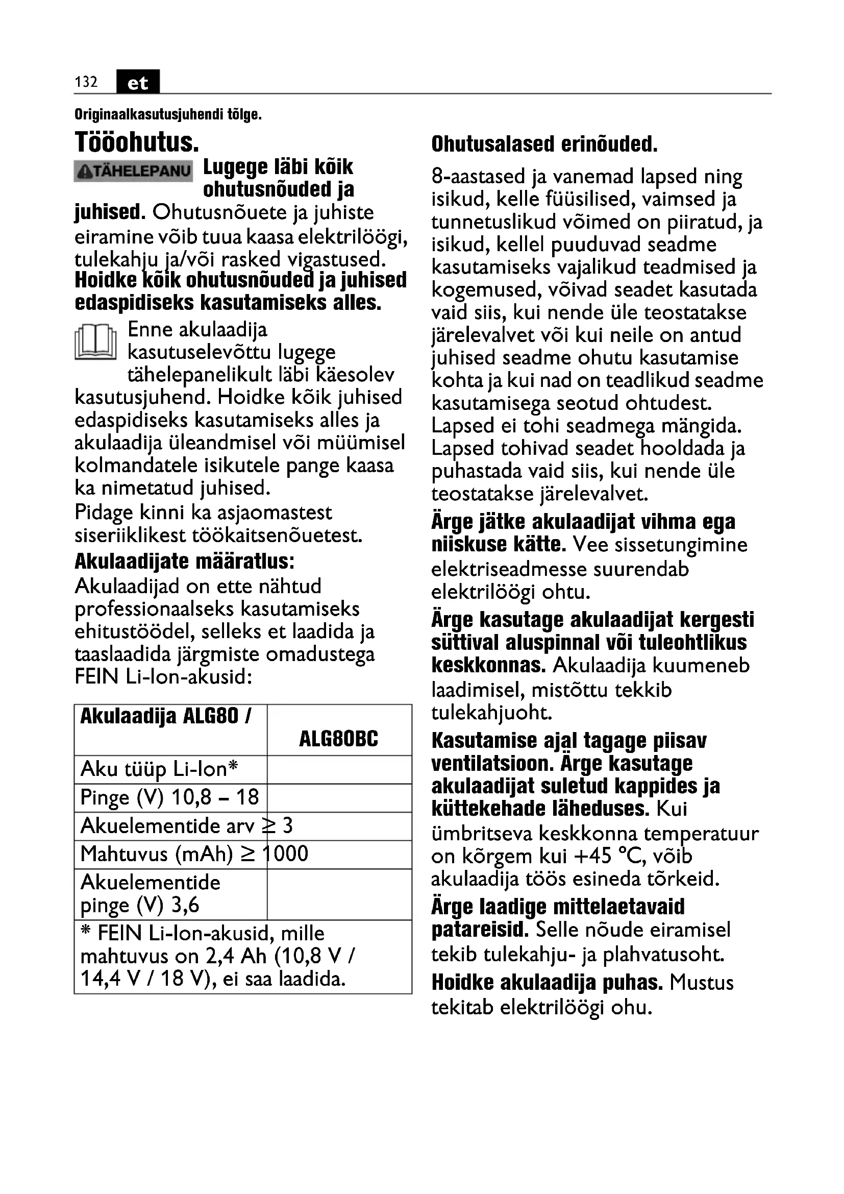 Originaalkasutusjuhendi tõlge. Tööohutus. Lugege läbi kõik ohutusnõuded ja juhised. Ohutusnõuete ja juhiste eiramine võib tuua kaasa elektrilöögi, tulekahju ja/või rasked vigastused. Hoidke kõik ohutusnõuded ja juhised edaspidiseks kasutamiseks alles. Enne akulaadija kasutuselevõttu lugege tähelepanelikult läbi käesolev kasutusjuhend. Hoidke kõik juhised edaspidiseks kasutamiseks alles ja akulaadija üleandmisel või müümisel kolmandatele isikutele pange kaasa ka nimetatud juhised. Pidage kinni ka asjaomastest siseriiklikest töökaitsenõuetest. Akulaadijate määratlus: Akulaadijad on ette nähtud professionaalseks kasutamiseks ehitustöödel, selleks et laadida ja taaslaadida järgmiste omadustega FEIN Li-Ion-akusid: Ohutusalased erinõuded. 8-aastased ja vanemad lapsed ning isikud, kelle füüsilised, vaimsed ja tunnetuslikud võimed on piiratud, ja isikud, kellel puuduvad seadme kasutamiseks vajalikud teadmised ja kogemused, võivad seadet kasutada vaid siis, kui nende üle teostatakse järelevalvet või kui neile on antud juhised seadme ohutu kasutamise kohta ja kui nad on teadlikud seadme kasutamisega seotud ohtudest. Lapsed ei tohi seadmega mängida. Lapsed tohivad seadet hooldada ja puhastada vaid siis, kui nende üle teostatakse järelevalvet. Ärge jätke akulaadijat vihma ega niiskuse kätte. Vee sissetungimine elektriseadmesse suurendab elektrilöögi ohtu. Ärge kasutage akulaadijat kergesti süttival aluspinnal või tuleohtlikus keskkonnas. Akulaadija kuumeneb laadimisel, mistõttu tekkib tulekahjuoht. Kasutamise ajal tagage piisav ventilatsioon. Ärge kasutage akulaadijat suletud kappides ja küttekehade läheduses. Kui ümbritseva keskkonna temperatuur on kõrgem kui +45 °C, võib akulaadija töös esineda tõrkeid. Ärge laadige mittelaetavaid patareisid. Selle nõude eiramisel tekib tulekahju- ja plahvatusoht. Hoidke akulaadija puhas. Mustus tekitab elektrilöögi ohu. Akulaadija ALG80 / ALG80BC Aku tüüp Li-Ion* Pinge (V) 10,8 – 18 Akuelementide arv ≥ 3 Mahtuvus (mAh) ≥ 1000 Akuelementide pinge (V) 3,6
