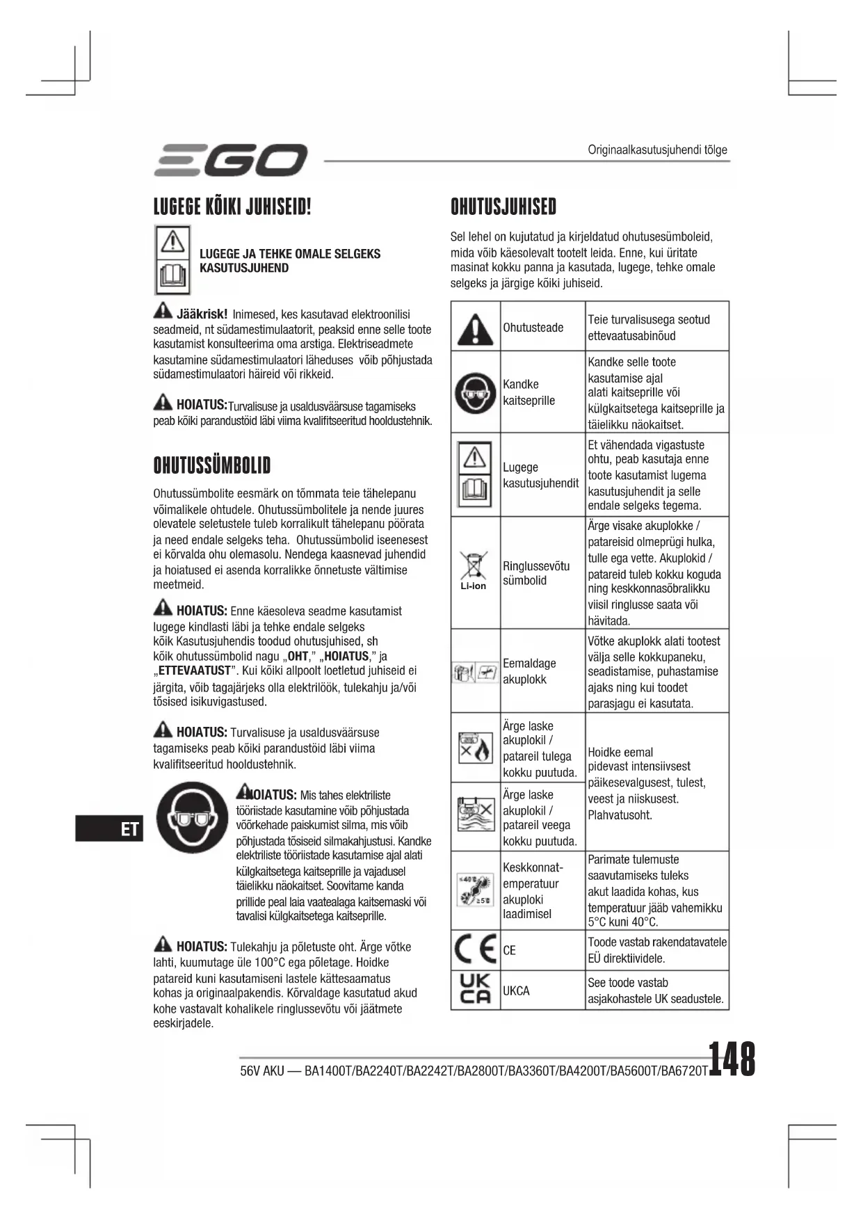 Selle liitiumioonaku jõudlus on optimaalne56V AKU — BA1400T/BA2240T/BA2242T/BA2800T/BA3360T/BA4200T/BA5600T/BA6720T152 temperatuurivahemikus 10°C kuni 26°C. Kui aku on väga külm, võib see esimese kasutusminuti jooksul „tuksuda”, et end üles soojendada. Pange aku tagasi seadmesse ja kasutage tööriista nõrgemas režiimis. Umbes minuti pärast on aku üles soojenenud ja töötab normaalselt.MILLAL AKUT LAADIDAMÄRKUS: Liitiumioonakud toimetatakse kohale osaliselt laetuna. Enne esmakordset kasutamist laadige aku täielikult täis.MÄRKUS: See aku on varustatud täiustatud ise-hoolduse funktsiooniga, mis aitab pikendada aku eluiga. Sõltuvalt aku laetuse tasemest tühjendab see end automaatselt ise pärast ühe kuu pikkust ladustamist. Pärast seda ise-hoolduse toimingut jääb aku puhkerežiimile ja säilitab 30% oma laetuse tasemest. Kui ladustate akut kuu aega või kauem, tuleb see enne järgmist kasutamist uuetsi täielikult täis laadida. (Ei kehti BA2240T puhul, mis on varustatud teistsuguse tänapäevase tehnoloogiaga, mis pikendab aku eluiga.)Enne uuesti laadimist ei ole vaja akut tühjaks laadida. Liitiumioonakut on võimalik igal ajal laadida ja sellel ei teki „mälu”, kui seda ainult pärast osalist tühjakslaadimist laadida. Kasutage toiteindikaatorit, et teada saada, millal akut laadida on vaja.KUIDAS AKUT LAADIDAJärgige EGO laadija CH2100E, CH3200E, CH5500E, CH7000E ja CH7000E-T kasutusjuhendis esitatud juhiseid. AKU PAIGALDAMINE JA EEMALDAMINEJärgige konkreetse EGO toote kasutusjuhendit. HOOLDUS HOIATUS: Tõsiste isikuvigastuste vältimiseks eemaldage aku tööriistast alati lisatarvikute vahetamise, puhastamise ja hooldustööde teostamise ajaks. HOIATUS: Remondiks võib kasutada ainult identseid EGO originaalvaruosi. Mis tahes muude osade kasutamine võib põhjustada ohtlikke olukordi või seadet vigastada. HOIATUS: Aku puhastamiseks ei ole soovitatav kasutada kokkusurutud kuiva õhku. Kui kokkusurutud õhu kasutamine on ainus võimalik viis, kandke kindlasti näokaitset või külgkaitsetega kaitseprille. Kui tööpiirkond on tolmune, kandke ka tolmumaski.ÜLDINE HOOLDUSVältige plastosade kasutamisel lahustite kasutamist. Enamik plastmasse on kaubanduslike lahustite suhtes tundlikud ja võivad nende kasutamisel kahjustada saada. Kasutage mustuse, tolmu, õli, määrete jms eemaldamiseks puhtaid riidest lappe. HOIATUS: Ärge kunagi laske pidurivedelikel, bensiinil, nafta baasil toodetel, läbitungivatel õlidel jms puutuda kokku plastosadega. Kemikaalid võivad plastikut vigastada, nõrgestada või hävitada, mille tulemusena võivad tekkida tõsised isikuvigastused. HOIATUS: LÜHISEST TULENEVA TULEKAHJU, ISIKUVIGASTUSE VÕI TOOTE KAHJUSTUMISE OHU VÄHENDAMISEKS ÄRGE KUNAGI UPUTAGE TÖÖRIISTA, AKUT VÕI LAADIJAT VEDELIKKU EGA LASKE VEDELIKUL SEADMETESSE VOOLATA. LÜHISE VÕIVAD PÕHJUSTADA KORROSIIVSED VÕI ELEKTRIT JUHTIVAD VEDELIKUD, NT. MEREVESI, TEATUD TÖÖSTUSLIKUD KEMIKAALID JA VALGENDI VÕI VALGENDIT SISALDAVAD TOOTED JNE. AKUD Akuplokki kuuluvad laetavad liitiumioonakud. Tööaeg pärast iga laadimist sõltub tehtava töö tüübist.Selle seadme akud on ette nähtud võimaldama maksimaalset probleemidevaba kasutusiga. Nagu kõik akud, vananevad lõpuks ka need.Ärge võtke akuplokki lahti ega üritage akusid välja vahetada. Akude käsitlemine, eriti sõrmuste ja ehete kandmise ajal, võib põhjustada tõsiseid põletusi.Aku maksimaalse võimaliku kasutusaja saavutamiseks tuleb lugeda käesolevat kasutusjuhendit ning see endale selgeks teha. č Kui akuplokki ei kasutata, tuleks laadija toitevõrgust lahti ühendada ja liitiumioonakud eemaldada. Kui soovite liitiumioonakusid üle 30 päeva ladustada:Ladustage liitiumioonakusid kohas, kus temperatuur on alla 26°C ja kus ei ole niiske. č Ladustage liitiumioonakusid 30%-50% laetuse tasemel. č Iga kuue kuu pikkude ladustamisperioodi järel laadige liitiumioonakud täielikult täis. č Akude välispinda võib puhastada riidest lapi või pehme mittemetalse harjaga.AKUPLOKI EEMALDAMINE JA ETTEVALMISTUS RINGLUSSEVÕTUKS Li-ion Ärge visake aku laadijat egd akusid / laetavaid akusid olmeprügi hulka!Vastavalt Euroopa Liidu eriaruandele nr 2012/19/EU tuleb elektri- ja elektroonikaseadmed, mis pole enam kasutatavad, ning, vastavalt direktiivile 2006/66/EÜ, ka defektsed või kasutatud akuplokid / patareid, eraldi kokku koguda ja utiliseerida keskkonnasõbralikul viisil. Konsulteerige kohaliku jäätmekäitlusega tegeleva ametkonnaga, et saada informatsiooni ringlussevõtu ja / või kõrvaldamise võimaluste kohta.56V AKU — BA1400T/BA2240T/BA2242T/BA2800T/BA3360T/BA4200T/BA5600T/BA6720T 153