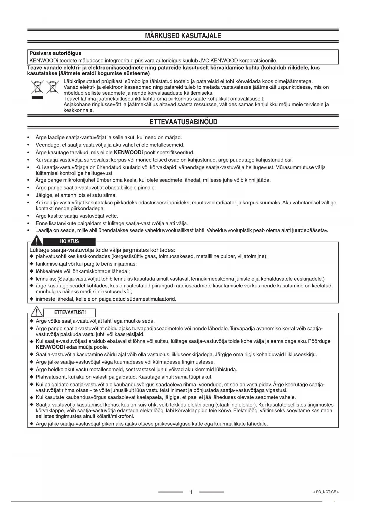 Püsivara autoriõigus KENWOODi toodete mäludesse integreeritud püsivara autoriõigus kuulub JVC KENWOOD korporatsioonile. Teave vanade elektri- ja elektroonikaseadmete ning patareide kasutuselt kõrvaldamise kohta (kohaldub riikidele, kus kasutatakse jäätmete eraldi kogumise süsteeme) Läbikriipsutatud prügikasti sümboliga tähistatud tooteid ja patareisid ei tohi kõrvaldada koos olmejäätmetega. Vanad elektri- ja elektroonikaseadmed ning patareid tuleb toimetada vastavatesse jäätmekäitluspunktidesse, mis on mõeldud selliste seadmete ja nende kõrvalsaaduste käitlemiseks. Teavet lähima jäätmekäitluspunkti kohta oma piirkonnas saate kohalikult omavalitsuselt. Asjakohane ringlussevõtt ja jäätmekäitlus aitavad säästa ressursse, vältides samas kahjulikku mõju meie tervisele ja keskkonnale. ETTEVAATUSABINÕUD